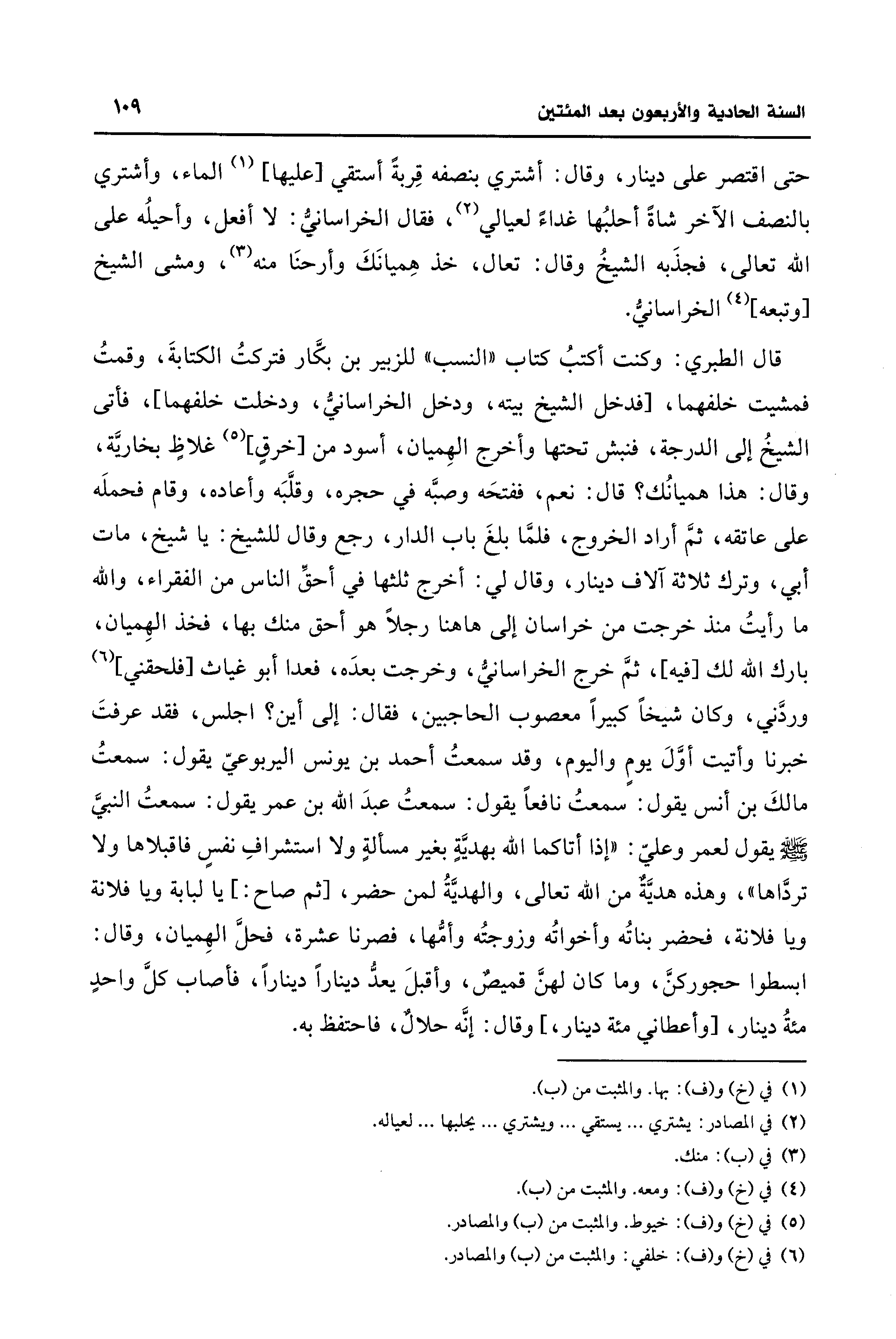 قال الطبري: وكنت أكتبُ كتاب "النسب" للزبير بن بكَّار فتركتُ الكتابةَ، وقمتُ فمشيت خلفهما، [فدخل الشيخ بيته، ودخل الخراسانيُّ، ودخلت خلفهما]، فأتى الشيخُ إلى الدرجة، فنبش تحتها وأخرج الهِميان، أسود من [خرق] (¬5) غلاظٍ بخارية، وقال: هذا هميانُك؟ قال: نعم، ففتحَه وصبَّه في حجره، وقلَّبَه وأعاده، وقام فحملَه على عاتقه، ثمَّ أراد الخروج، فلمَّا بلغَ باب الدار، رجع وقال للشيخ: يا شيخ، مات أبي، وترك ثلاثة آلاف دينار، وقال لي: أخرج ثلثها في أحقِّ الناس من الفقراء، والله ما رأيتُ منذ خرجت من خراسان إلى هاهنا رجلًا هو أحق منك بها، فخذ الهِميان، بارك الله لك [فيه]، ثمَّ خرج الخراسانيُّ، وخرجت بعدَه، فعدا أبو غياث [فلحقني] (¬6) وردَّني، وكان شيخًا كبيرًا معصوب الحاجبين، فقال: إلى أين؟ اجلس، فقد عرفتَ خبرنا وأتيت أوَّلَ يومٍ واليوم، وقد سمعتُ أحمد بن يونس اليربوعيّ يقول: سمعتُ مالكَ بن أنس يقول: سمعتُ نافعًا يقول: سمعتُ عبدَ الله بن عمر يقول: سمعتُ النبيَّ - صلى الله عليه وسلم - يقول لعمر وعليّ: "إذا أتاكما الله بهديَّةٍ بغير مسألةٍ ولا استشرافِ نفسٍ فاقبلاها ولا تردَّاها"، وهذه هديَّةٌ من الله تعالى، والهديَّةُ لمن حضر، [ثم صاح: ] يا لبابة ويا فلانة ويا فلانة، فحضر بناتُه وأخواتُه وزوجتُه وأمُّها، فصرنا عشرة، فحل الهِميان، وقال: ابسطوا حجوركنَّ، وما كان لهنَّ قميصٌ، وأقبلَ يعدُّ دينارًا دينارًا، فأصاب كلَّ واحدٍ مئةُ دينار، [وأعطاني مئة دينار، ] وقال: إنَّه حلالٌ، فاحتفظ به.