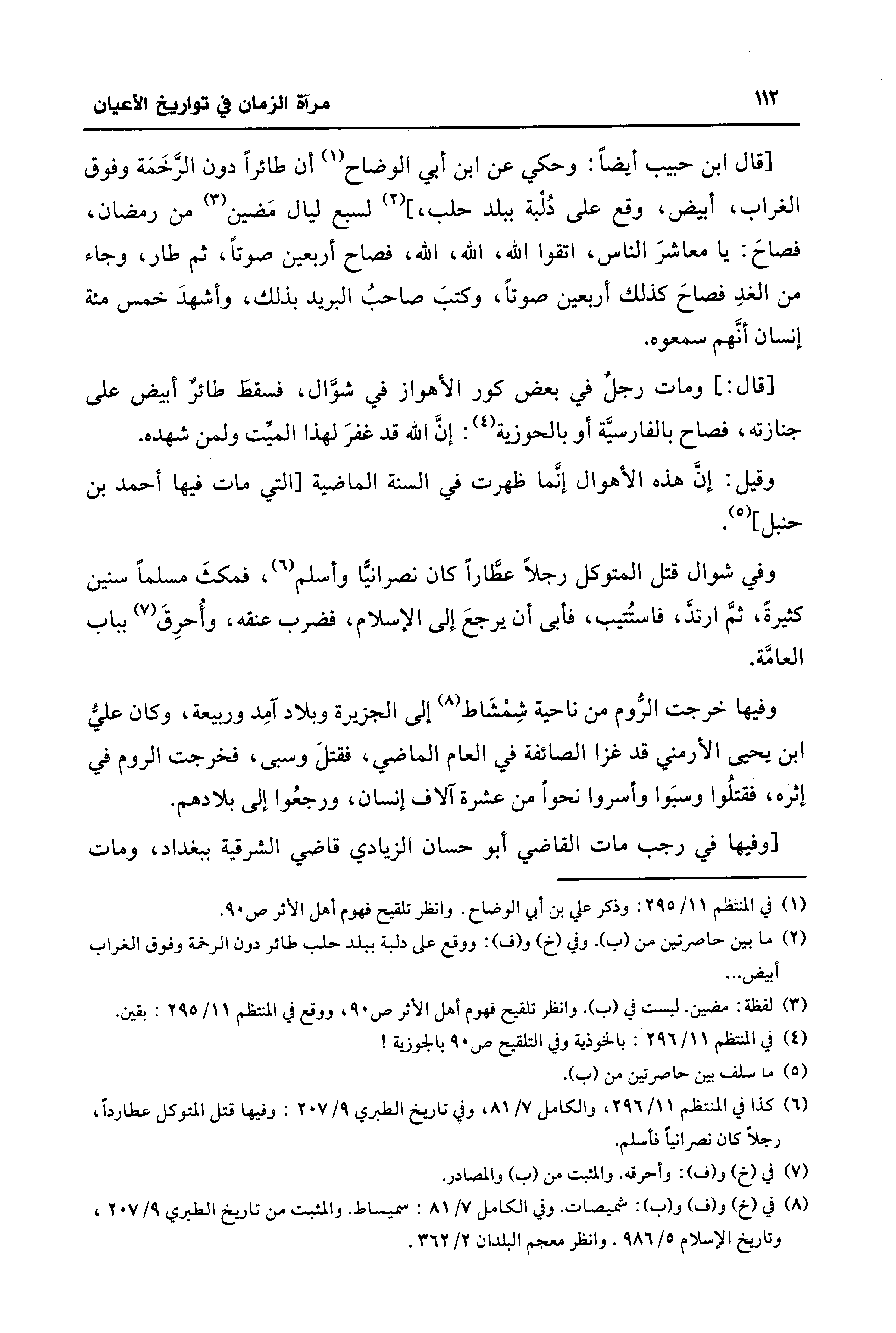 [قال ابن حبيب أيضًا: وحكي عن ابن أبي الوضاح (¬1) أن طائرًا دون الرَّخَمَة وفوق الغراب، أبيض، وقع على دُلْبة ببلد حلب، ] (¬2) لسبع ليال مَضين (¬3) من رمضان، فصاحَ: يا معاشرَ الناس، اتقوا الله، الله، الله، فصاح أربعين صوتًا، ثم طار، وجاء من الغدِ فصاحَ كذلك أربعين صوتًا، وكتبَ صاحبُ البريد بذلك، وأشهدَ خمس مئة إنسان أنَّهم سمعوه.