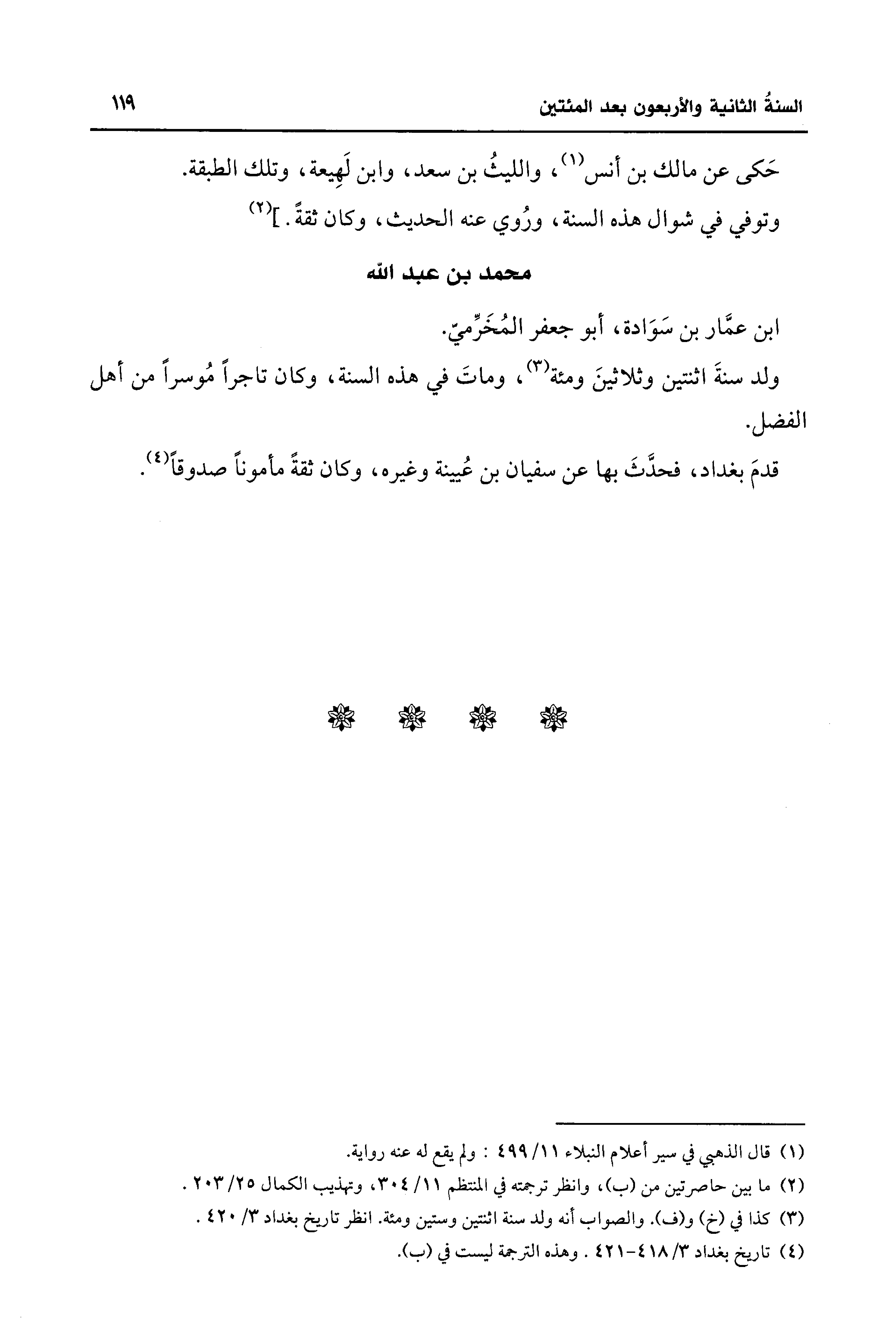 (¬4) تاريخ بغداد 3/ 418 - 421. وهذه الترجمة ليست في (ب).