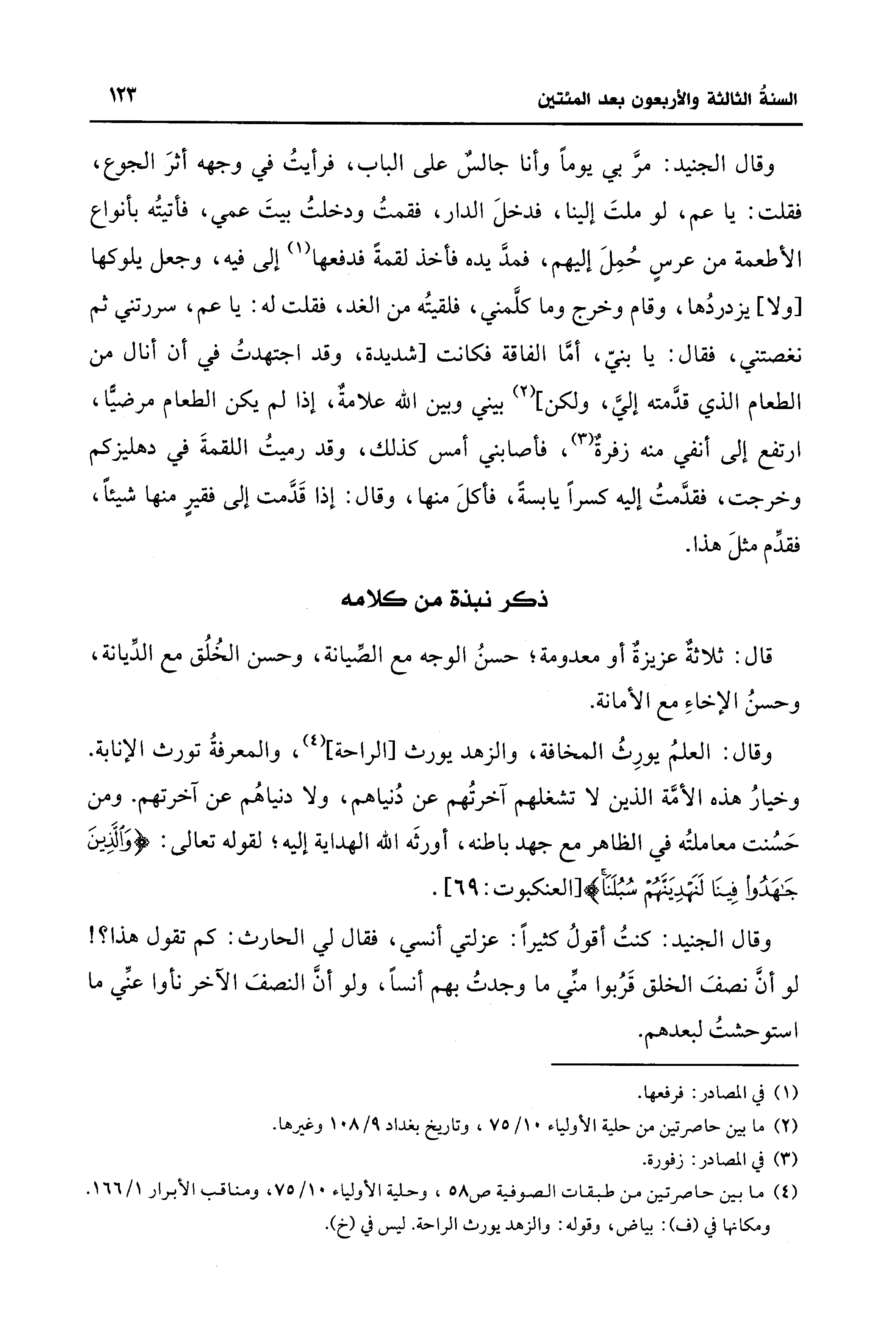 (¬4) ما بين حاصرتين من طبقات الصوفية ص 58، وحلية الأولياء 10/ 75، ومناقب الأبرار 1/ 166. ومكانها في (ف): بياض، وقوله: والزهد يورث الراحة. ليس في (خ).