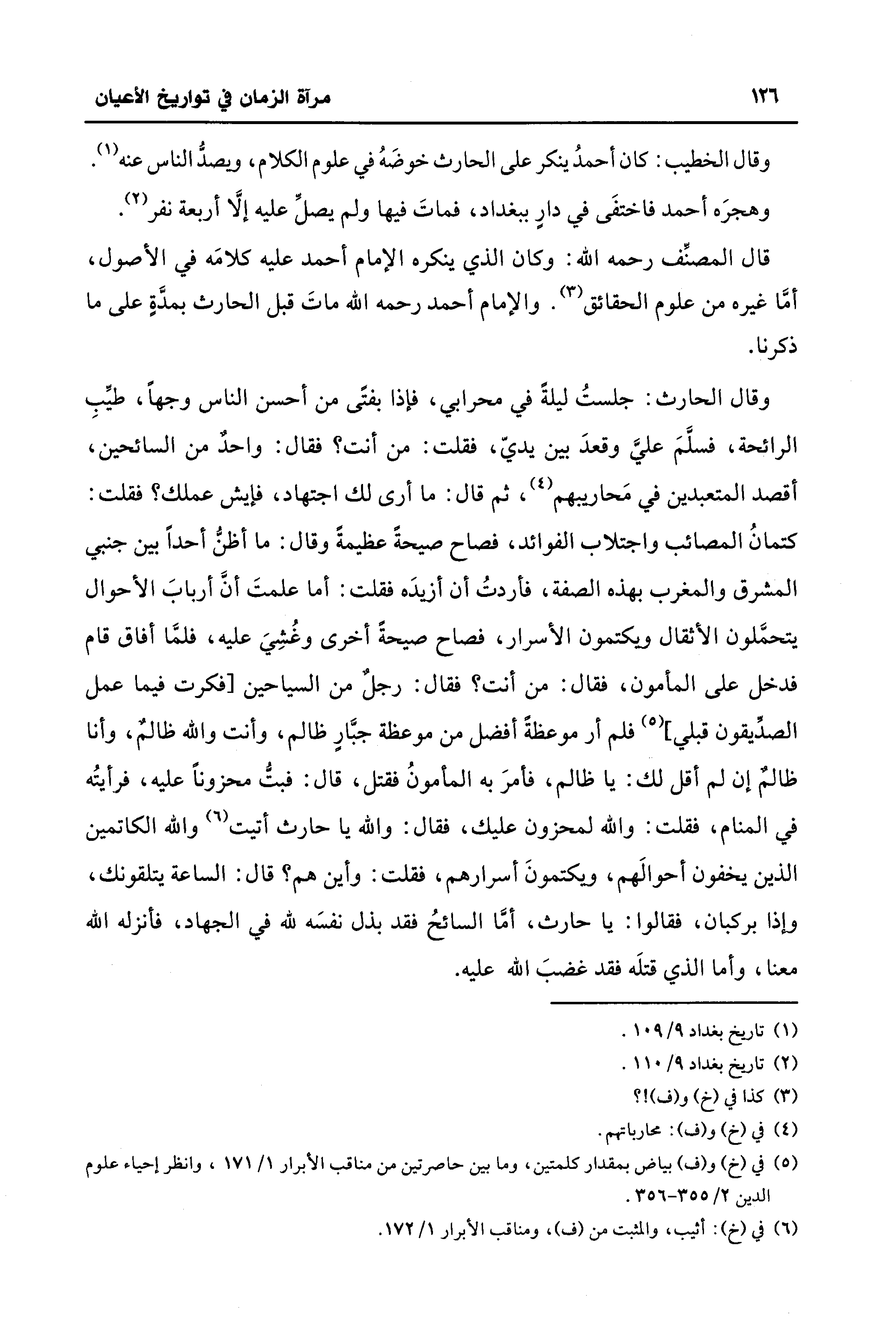 قال المصنِّف رحمه الله: وكان الذي ينكره الإمام أحمد عليه كلامَه في الأصول، أمَّا غيره من علوم الحقائق (¬3). والإمام أحمد رحمه الله ماتَ قبل الحارث بمدَّةٍ على ما ذكرنا.