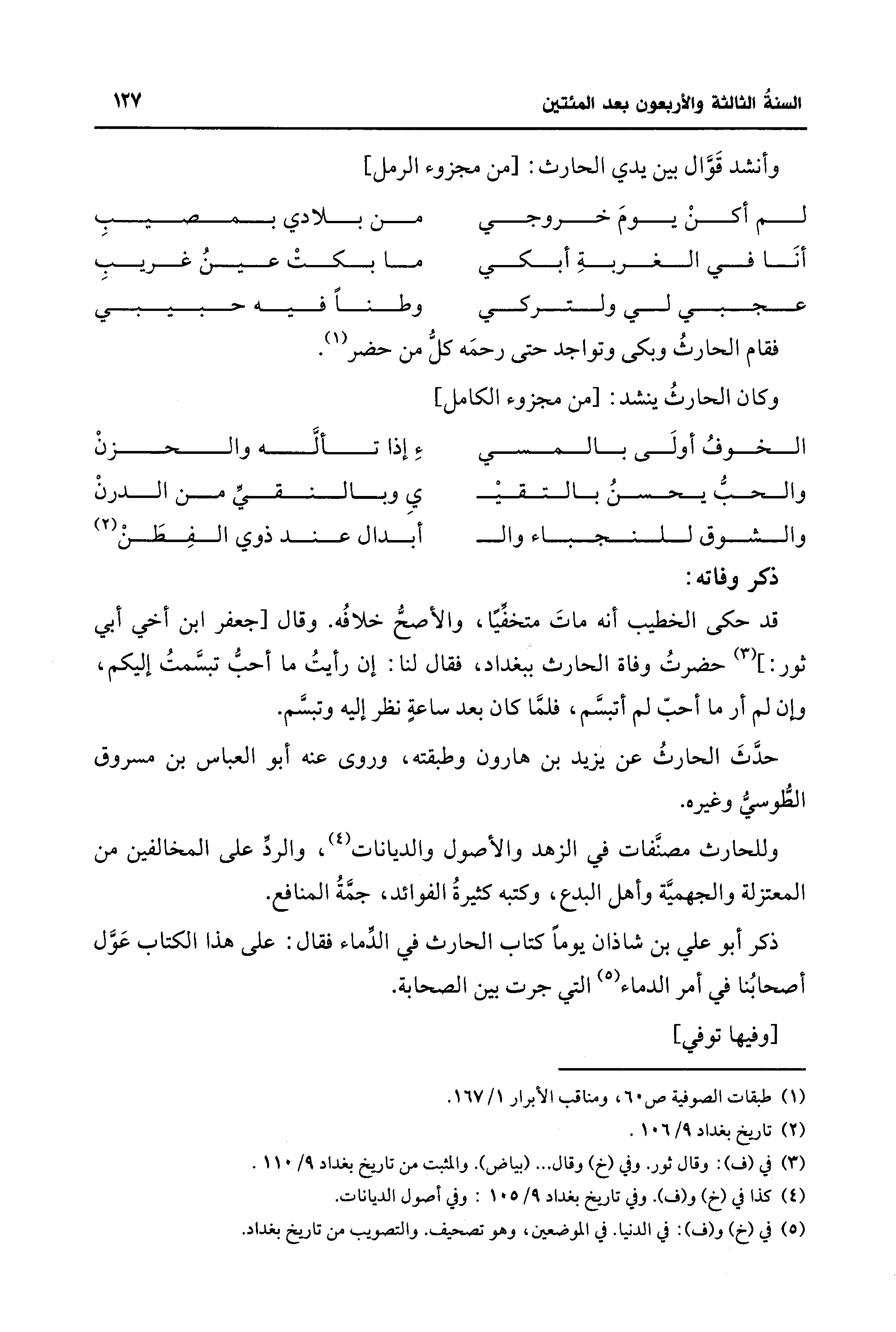 قد حكى الخطيب أنه ماتَ متخفِّيًا، والأصحُّ خلافُه. وقال [جعفر ابن أخي أبي ثور: ] (¬3) حضرتُ وفاة الحارث ببغداد، فقال لنا: إن رأيتُ ما أحبُّ تبسَّمتُ إليكم، وإن لم أر ما أحبّ لم أتبسَّم، فلمَّا كان بعد ساعةٍ نظر إليه وتبسَّم.