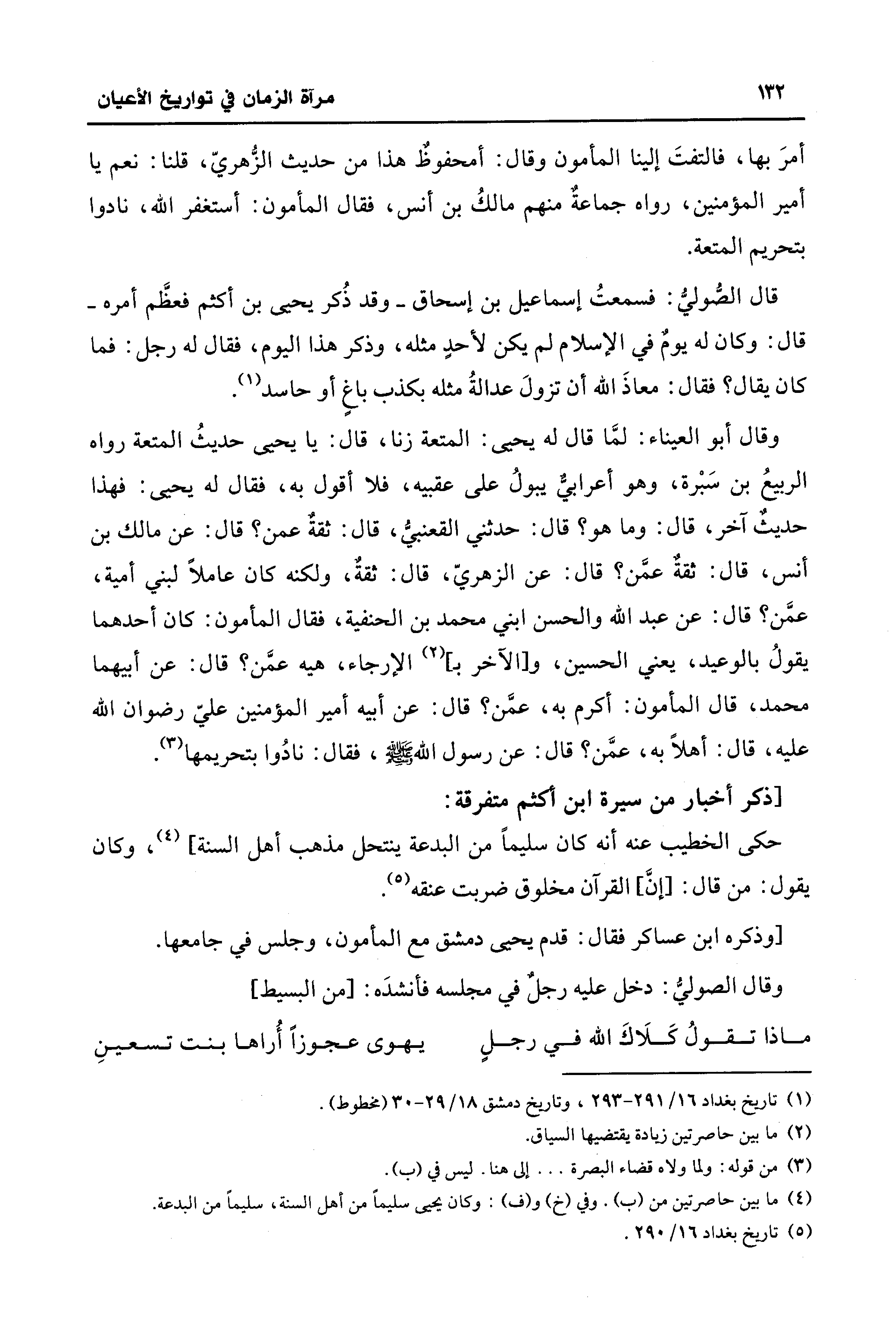 وقال أبو العيناء: لمَّا قال له يحيى: المتعة زنا، قال: يا يحيى حديثُ المتعة رواه الربيعُ بن سَبْرة، وهو أعرابيٌّ يبولُ على عقبيه، فلا أقول به، فقال له يحيى: فهذا حديثٌ آخر، قال: وما هو؟ قال: حدثني القعنبيُّ، قال: ثقةٌ عمن؟ قال: عن مالك بن أنس، قال: ثقةٌ عمَّن؟ قال: عن الزهريّ، قال: ثقةٌ، ولكنه كان عاملًا لبني أمية، عمَّن؟ قال: عن عبد الله والحسن ابني محمد بن الحنفية، فقال المأمون: كان أحدهما يقولُ بالوعيد، يعني الحسين، و [الآخر بـ] (¬2) الإرجاء، هيه عمَّن؟ قال: عن أبيهما محمد، قال المأمون: أكرم به، عمَّن؟ قال: عن أبيه أمير المؤمنين عليّ رضوان الله عليه، قال: أهلًا به، عمَّن؟ قال: عن رسول الله - صلى الله عليه وسلم -، فقال: نادُوا بتحريمها (¬3).