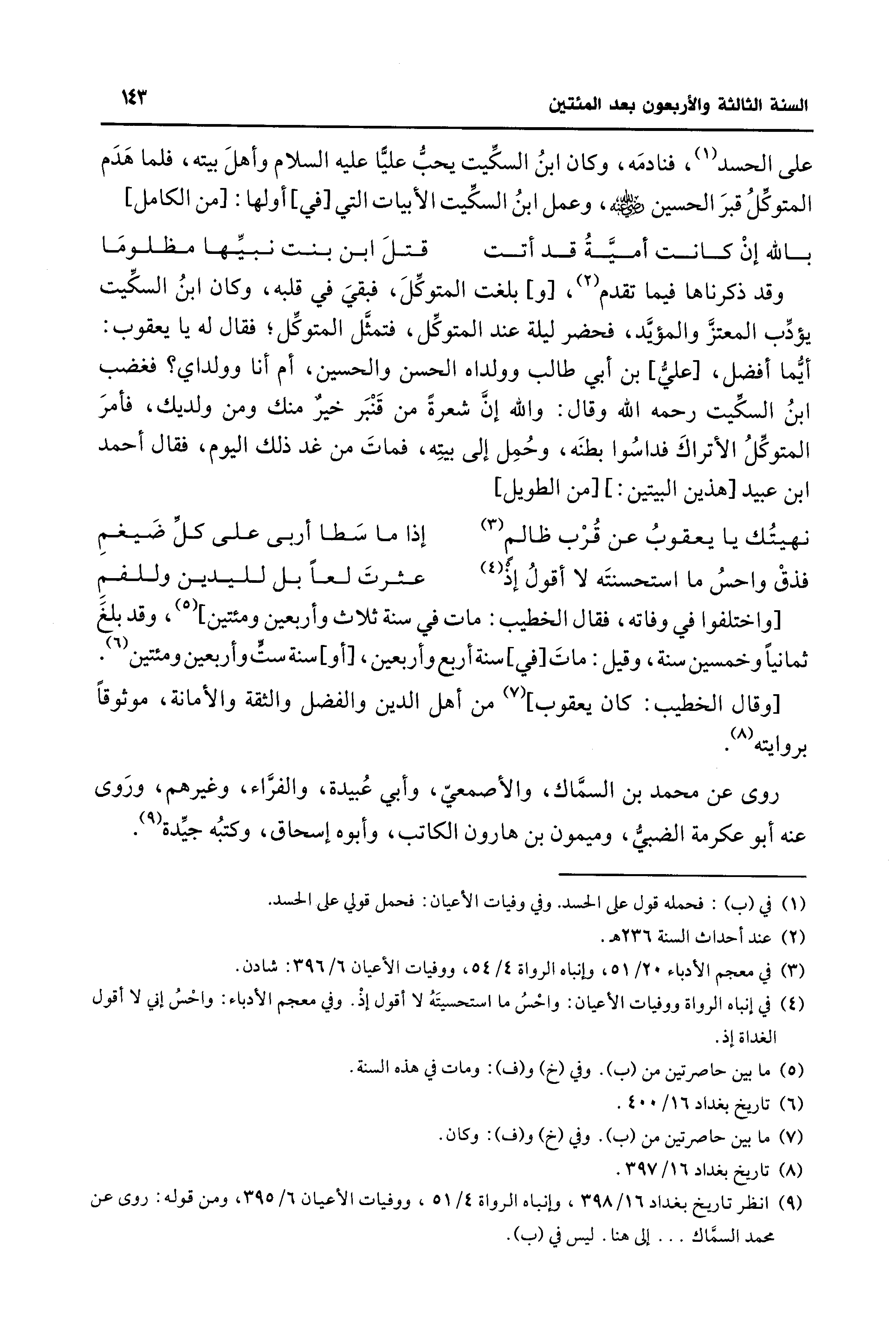 (¬9) انظر تاريخ بغداد 16/ 398، وإنباه الرواة 4/ 51، ووفيات الأعيان 6/ 395، ومن قوله: روى عن محمد السمَّاك ... إلى هنا. ليس في (ب).