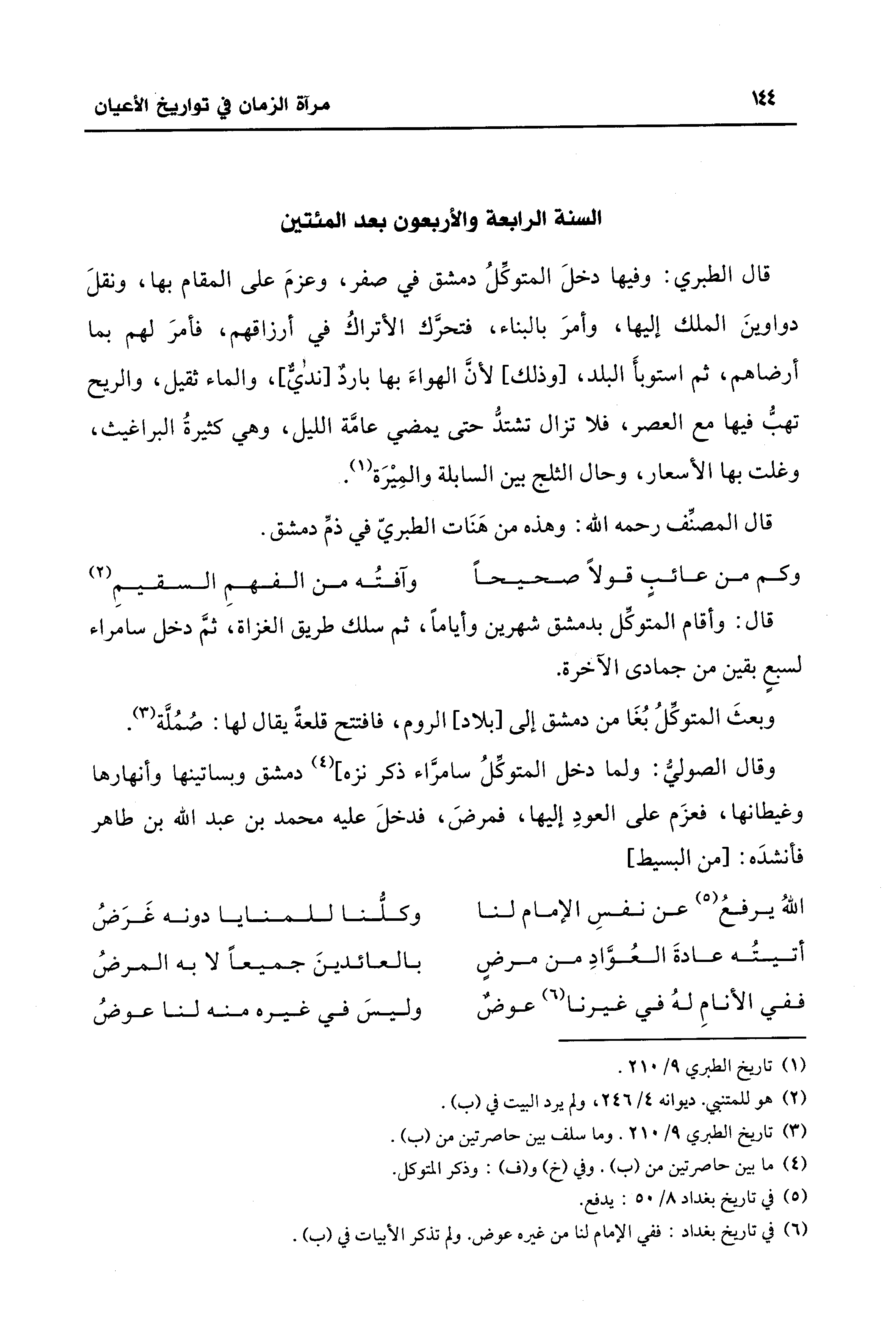قال: وأقام المتوكِّل بدمشق شهرين وأيامًا، ثم سلك طريق الغزاة، ثمَّ دخل سامراء لسبعٍ بقين من جمادى الآخرة.