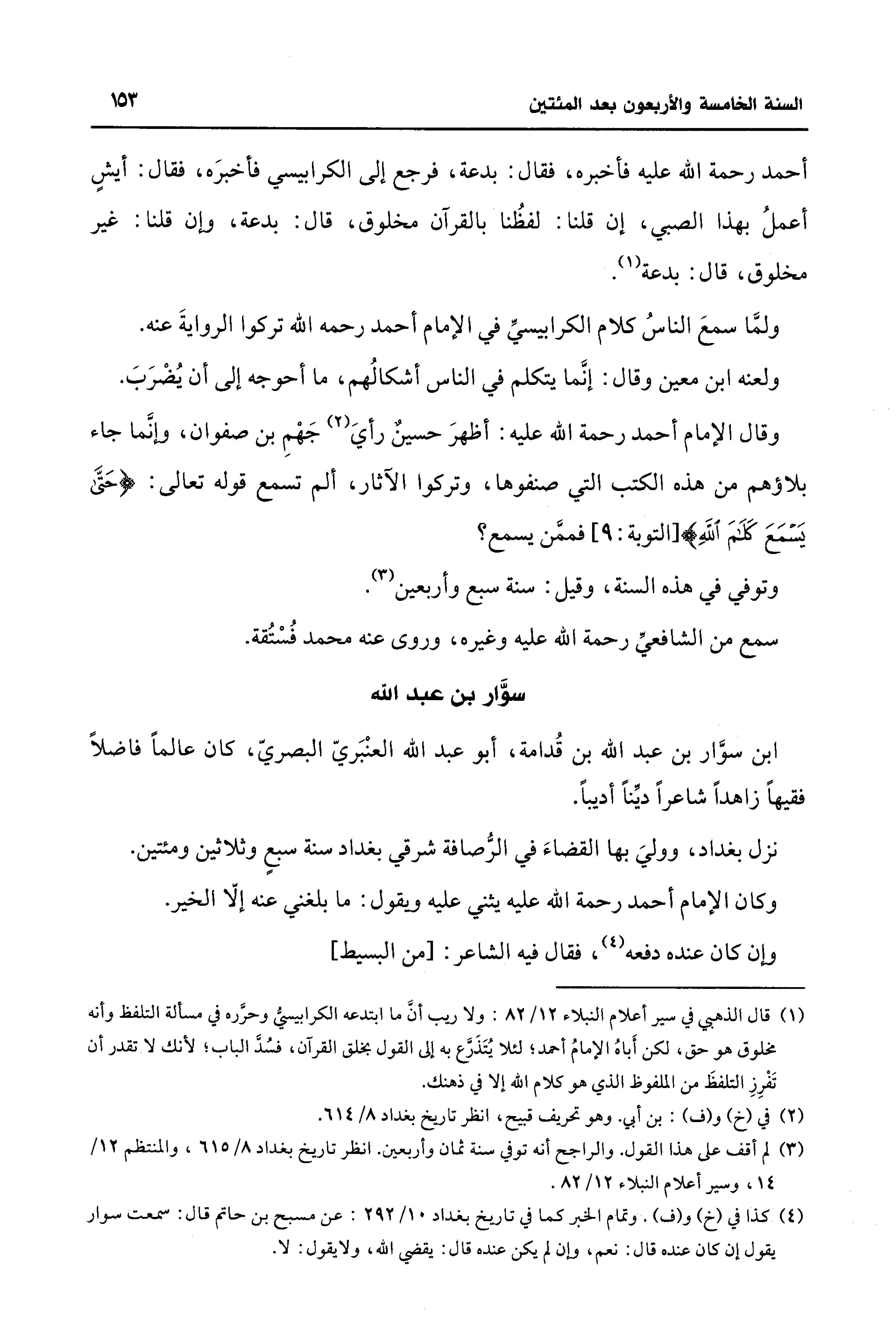 (¬1) قال الذهبي في سير أعلام النبلاء 12/ 82: ولا ريب أنَّ ما ابتدعه الكرابيسيُّ وحرَّره في مسألة التلفظ وأنه مخلوق هو حق، لكن أَباهُ الإمامُ أحمد؛ لئلا يُتَذَرَّع به إلى القول بخلق القرآن، فسُدَّ الباب؛ لأنك لا تقدر أن تَفْرِزِ التلفظَ من الملفوظ الذي هو كلام الله إلا في ذهنك.