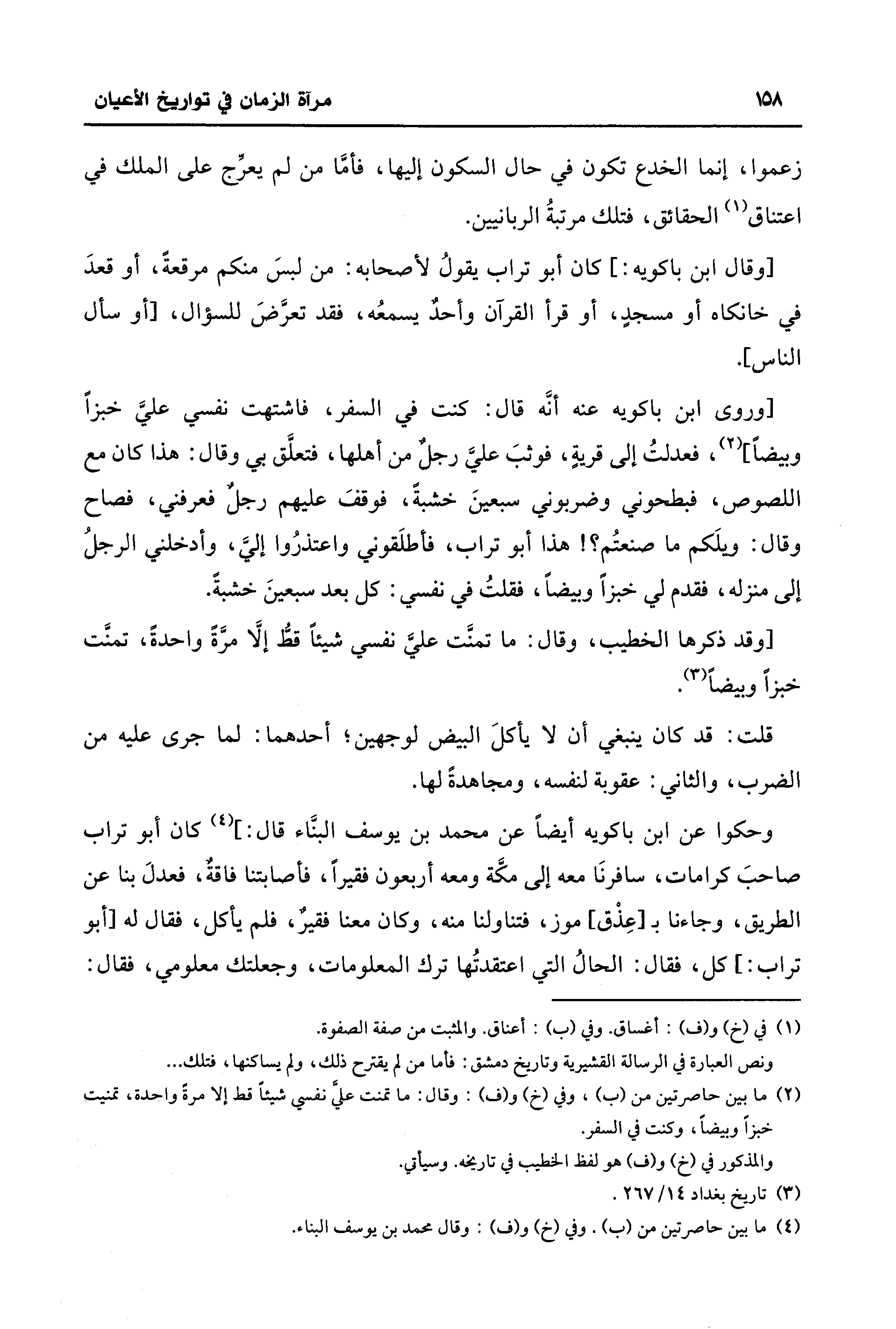 [وروى ابن باكويه عنه أنَّه قال: كنت في السفر، فاشتهت نفسي عليَّ خبزًا وبيضًا] (¬2)، فعدلتُ إلى قريةٍ، فوثبَ عليَّ رجل من أهلها، فتعلَّق بي وقال: هذا كان مع اللصوص، فبطحوني وضربوني سبعينَ خشبةً، فوقفَ عليهم رجلٌ فعرفني، فصاح وقال: ويلَكم ما صنعتُم؟ ! هذا أبو تراب، فأطلَقوني واعتذرُوا إليَّ، وأدخلني الرجلُ إلى منزله، فقدم لي خبزًا وبيضًا، فقلتُ في نفسي: كل بعد سبعينَ خشبةً.