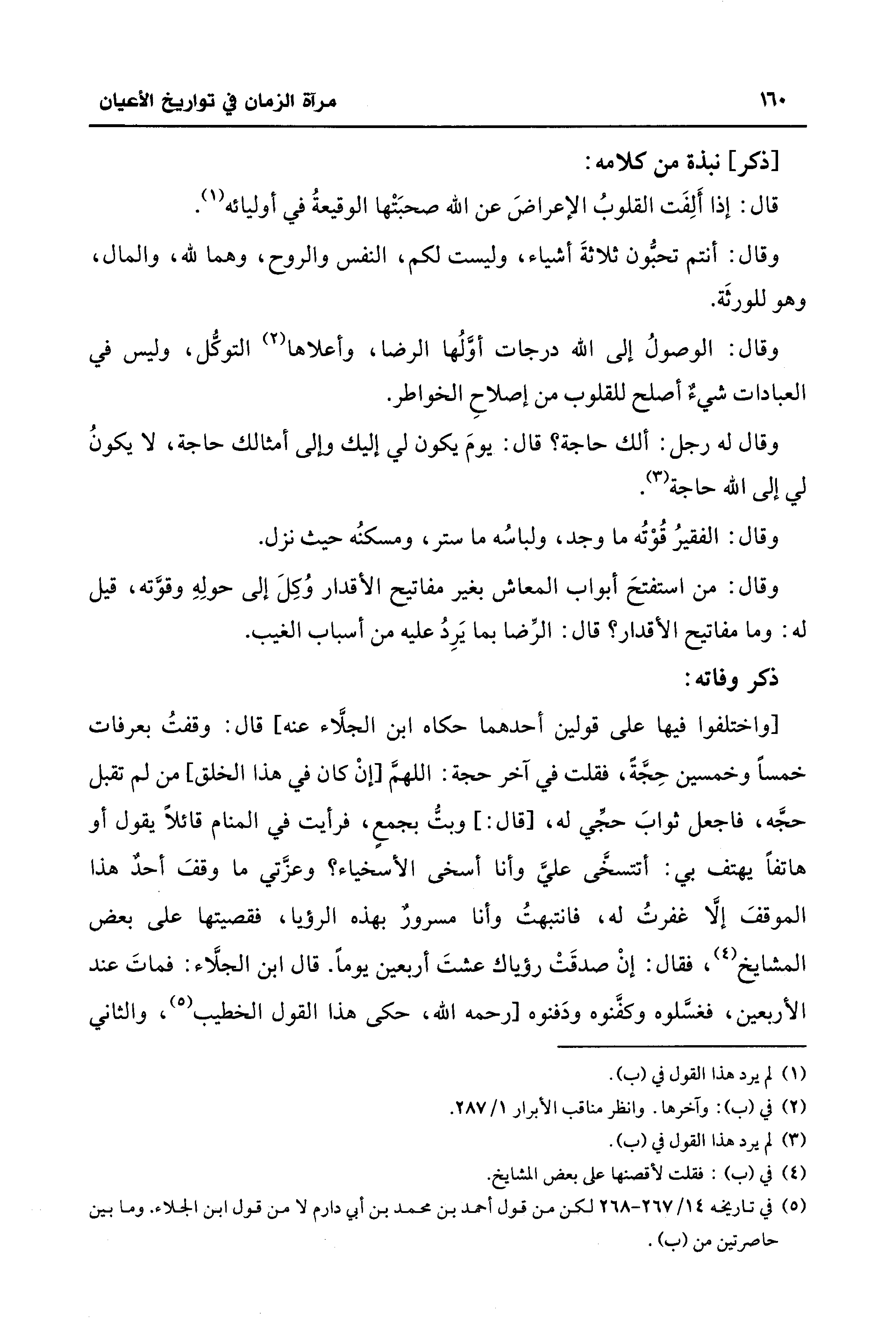 [واختلفوا فيها على قولين أحدهما حكاه ابن الجلَّاء عنه] قال: وقفتُ بعرفات خمسًا وخمسين حِجَّة، فقلت في آخر حجة: اللهمَّ [إنْ كان في هذا الخلق، من لم تقبل حجَّه، فاجعل ثوابَ حجِّي له، [قال: ] وبتُّ بجمع، فرأيت في المنام قائلًا يقول أو هاتفًا يهتف بي: أتتسخَّى عليَّ وأنا أسخى الأسخياء؟ وعزَّتي ما وقفَ أحدٌ هذا الموقفَ إلَّا غفرتُ له، فانتبهتُ وأنا مسرور بهذه الرؤيا، فقصيتها على بعض المشايخ (¬4)، فقال: إنْ صدقَتْ رؤياك عشتَ أربعين يومًا. قال ابن الجلَّاء: فماتَ عند الأربعين، فغسَّلوه وكفَّنوه ودَفنوه [رحمه الله، حكى هذا القول الخطيب (¬5)، والثاني