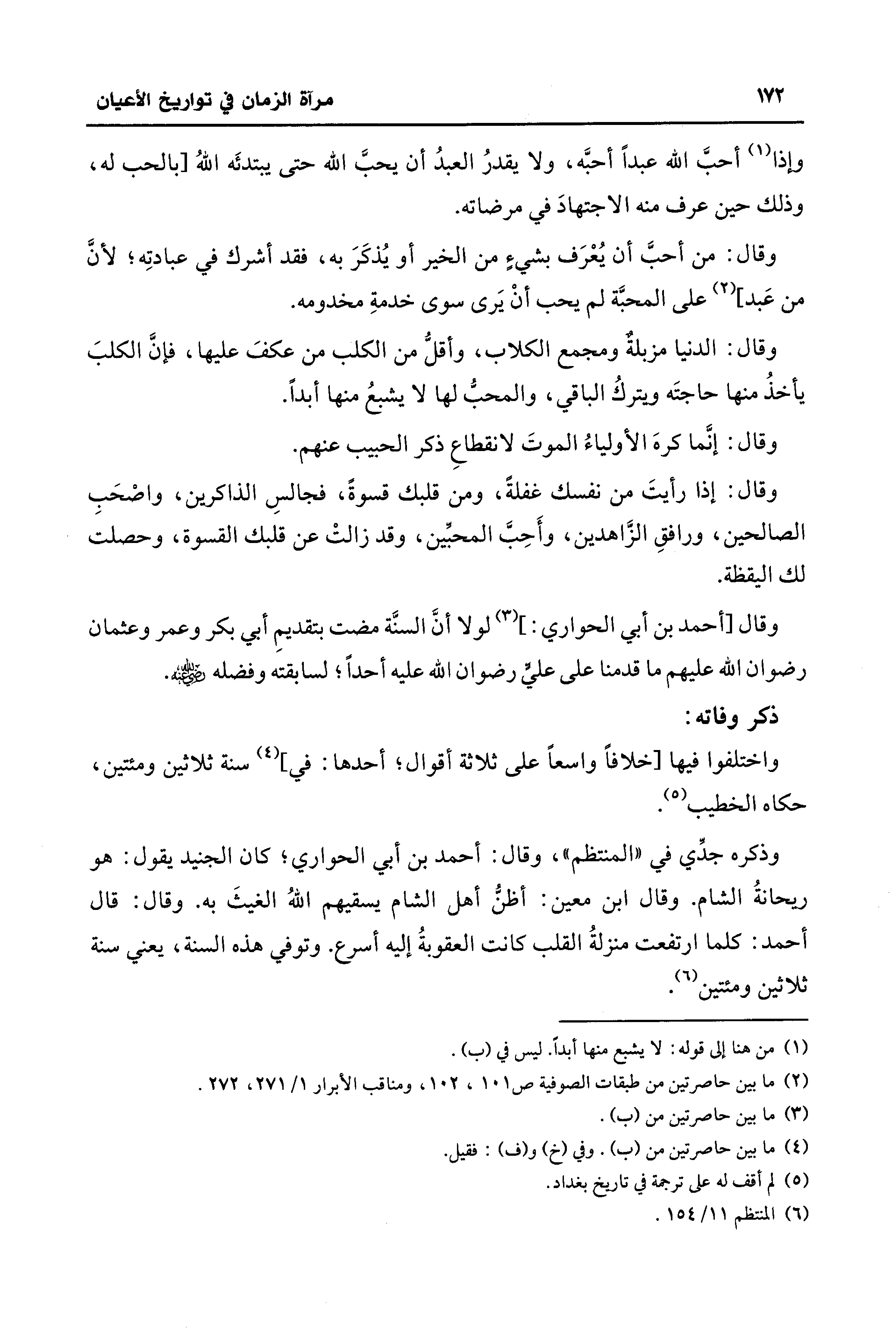 وذكره جدِّي في "المنتظم"، وقال: أحمد بن أبي الحواري؛ كان الجنيد يقول: هو ريحانةُ الشام. وقال ابن معين: أظنُ أهل الشام يسقيهم اللهُ الغيثَ به. وقال: قال أحمد: كلما ارتفعت منزلةُ القلب كانت العقوبةُ إليه أسرع. وتوفي هذه السنة، يعني سنة ثلاثين ومئتين (¬6).
