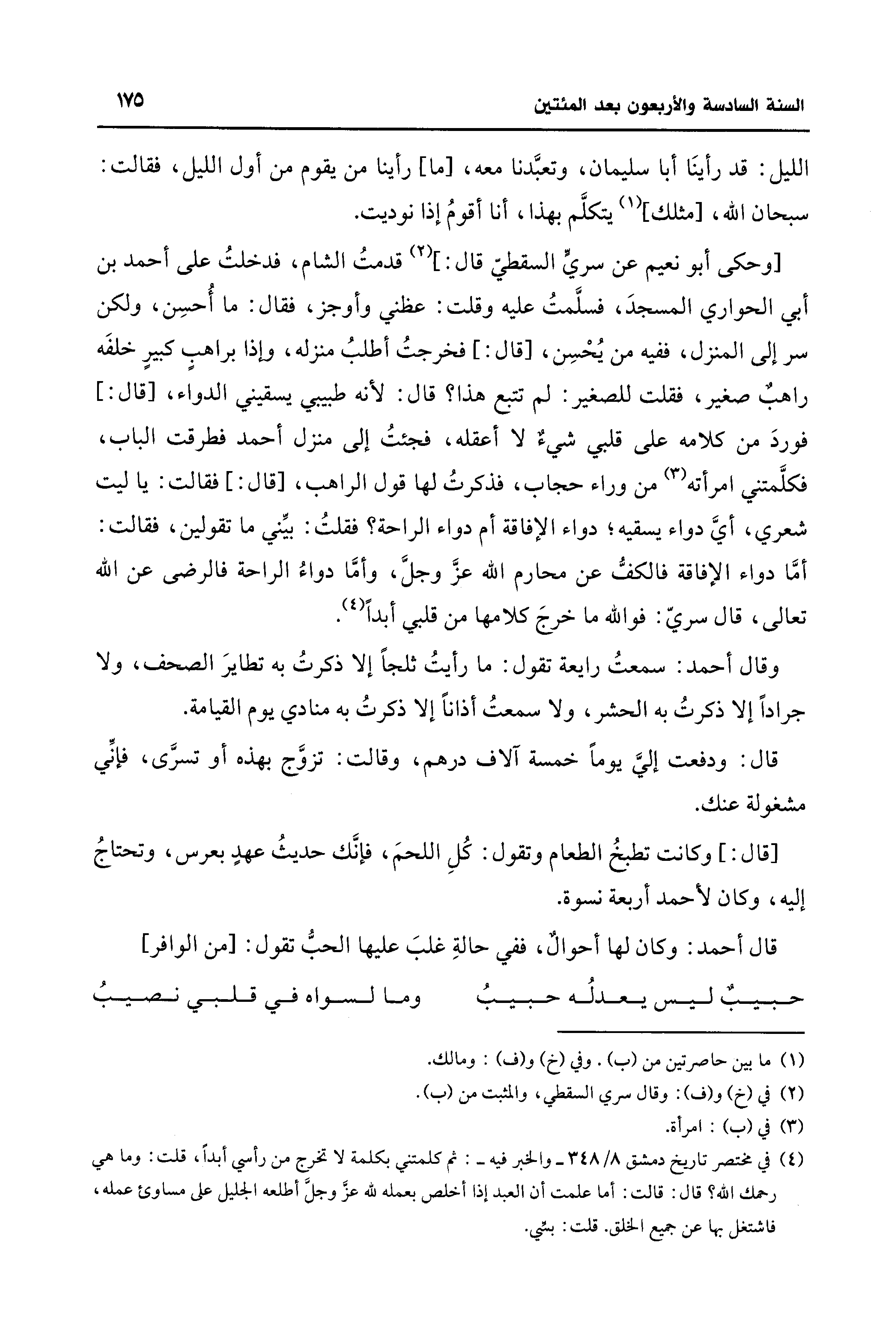[قال: ] وكانت تطبخُ الطعام وتقول: كُلِ اللحمَ، فإنَّك حديثُ عهدٍ بعرس، وتحتاجُ إليه، وكان لأحمد أربعة نسوة.