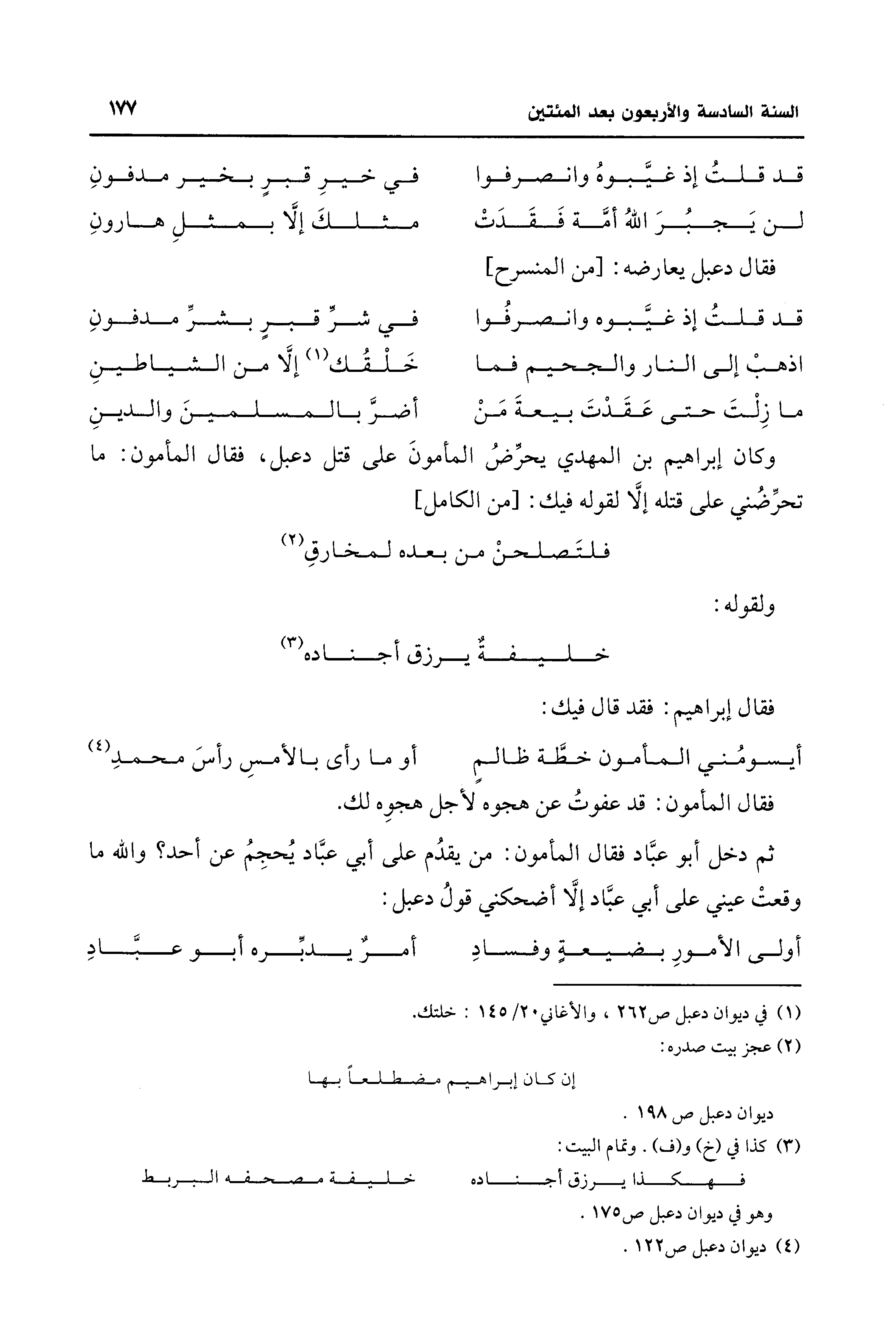 وكان إبراهيم بن المهدي يحرِّضُ المأمونَ على قتل دعبل، فقال المأمون: ما تحرِّضُني على قتله إلَّا لقوله فيك: [من الكامل]