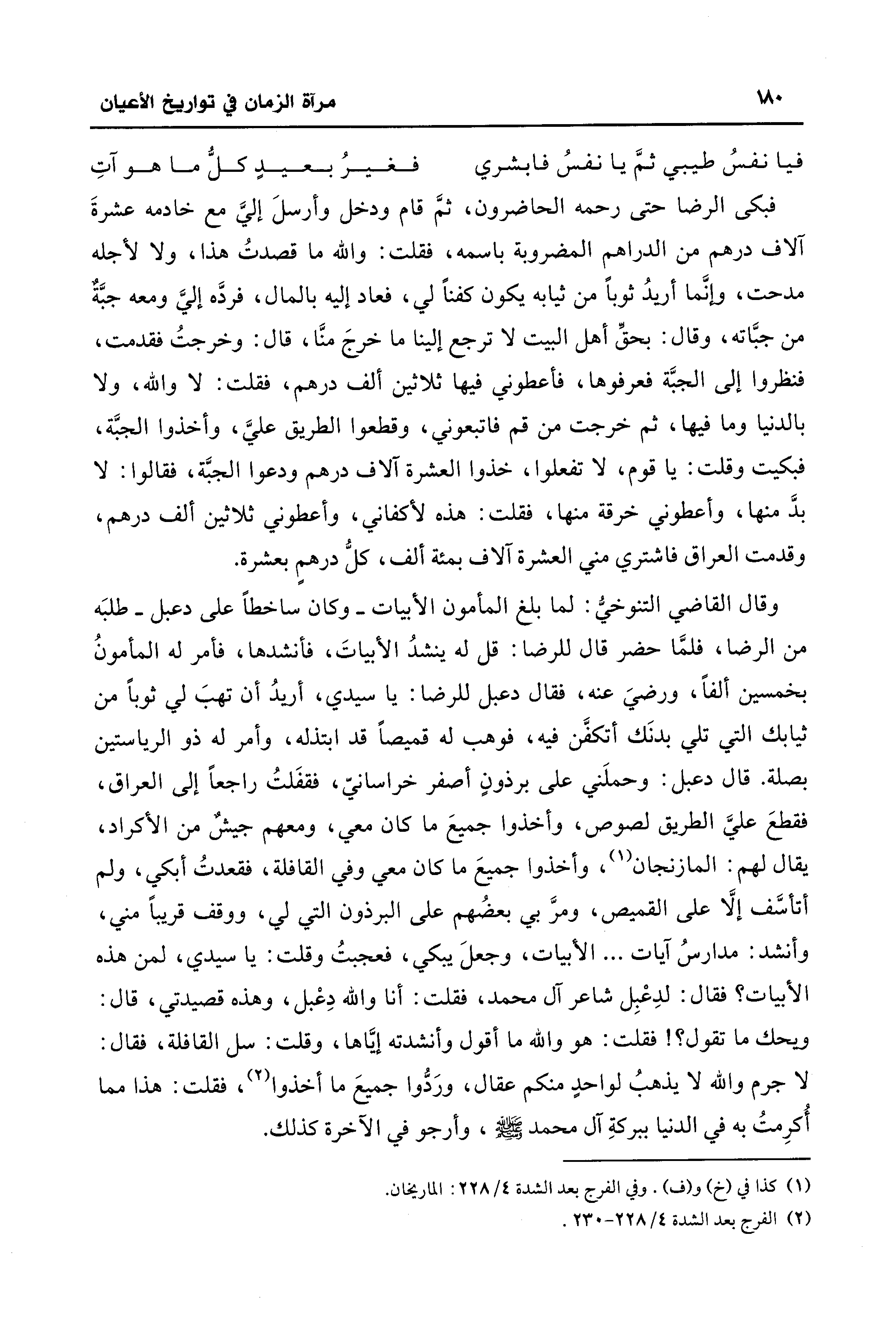 وقال القاضي التنوخيُّ: لما بلغ المأمون الأبيات -وكان ساخطًا على دعبل- طلبَه من الرضا، فلمَّا حضر قال للرضا: قل له ينشدُ الأبياتَ، فأنشدها، فأمر له المأمونُ بخمسين ألفًا، ورضيَ عنه، فقال دعبل للرضا: يا سيدي، أريدُ أن تهبَ لي ثوبًا من ثيابك التي تلي بدنَك أتكفَّن فيه، فوهب له قميصًا قد ابتذله، وأمر له ذو الرياستين بصلة. قال دعبل: وحملَني على برذونٍ أصفر خراسانيّ، فقفَلتُ راجعًا إلى العراق، فقطعَ عليَّ الطريق لصوص، وأخذوا جميعَ ما كان معي، ومعهم جيشٌ من الأكراد، يقال لهم: المازنجان (¬1)، وأخذوا جميعَ ما كان معي وفي القافلة، فقعدتُ أبكي، ولم أتأسَّف إلَّا على القميص، ومرَّ بي بعضُهم على البرذون التي لي، ووقف قريبًا مني، وأنشد: مدارسُ آيات ... الأبيات، وجعلَ يبكي، فعجبتُ وقلت: يا سيدي، لمن هذه الأبيات؟ فقال: لدِعْبِل شاعر آل محمد، فقلت: أنا والله دِعْبل، وهذه قصيدتي، قال: ويحك ما تقول؟ ! فقلت: هو والله ما أقول وأنشدته إيَّاها، وقلت: سل القافلة، فقال: لا جرم والله لا يذهبُ لواحدٍ منكم عقال، ورَدُّوا جميعَ ما أخذوا (¬2)، فقلت: هذا مما أُكرِمتُ به في الدنيا ببركةِ آل محمد - صلى الله عليه وسلم -، وأرجو في الآخرة كذلك.