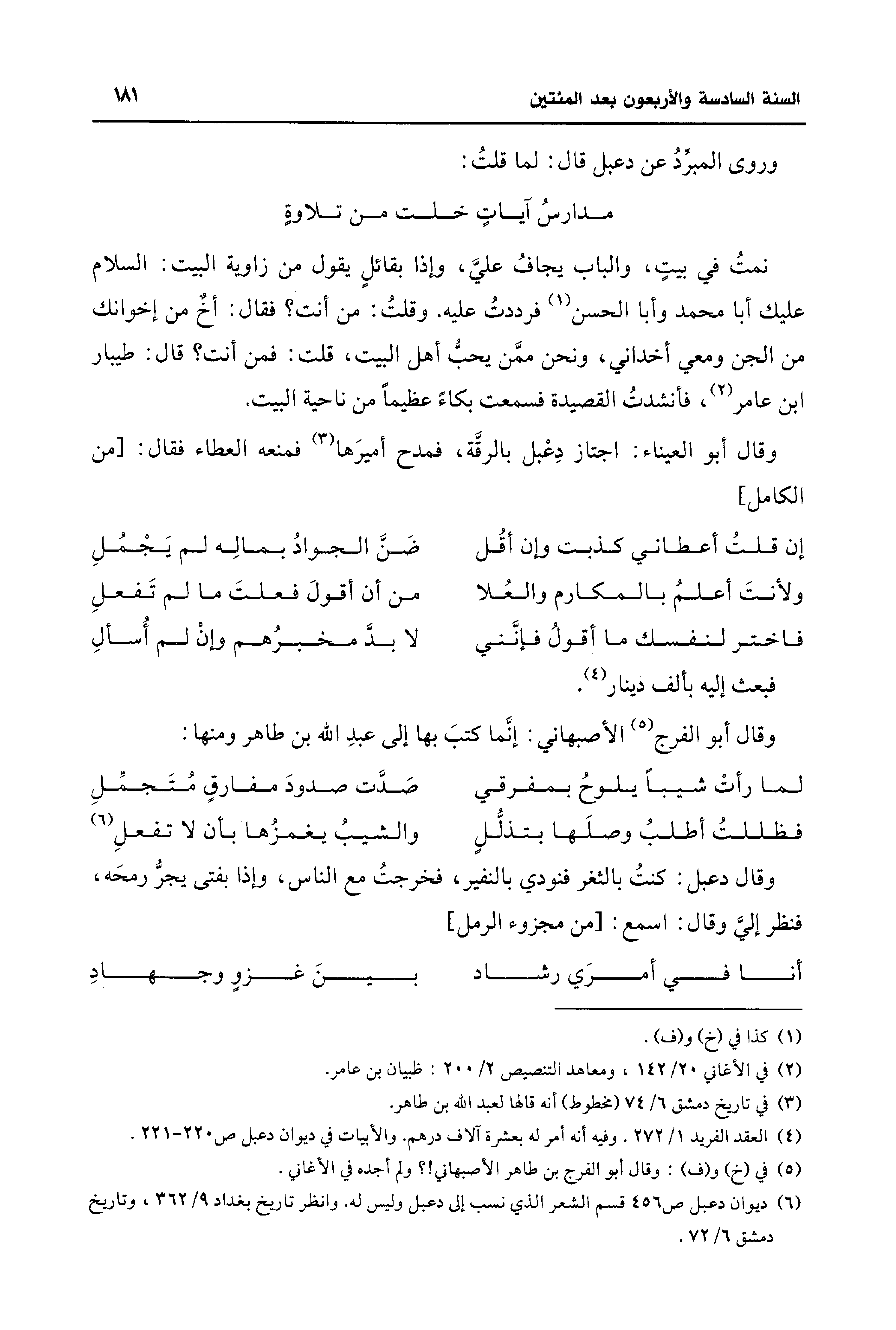 (¬6) ديوان دعبل ص 456 قسم الشعر الذي نسب إلى دعبل وليس له. وانظر تاريخ بغداد 9/ 362، وتاريخ دمشق 6/ 72.