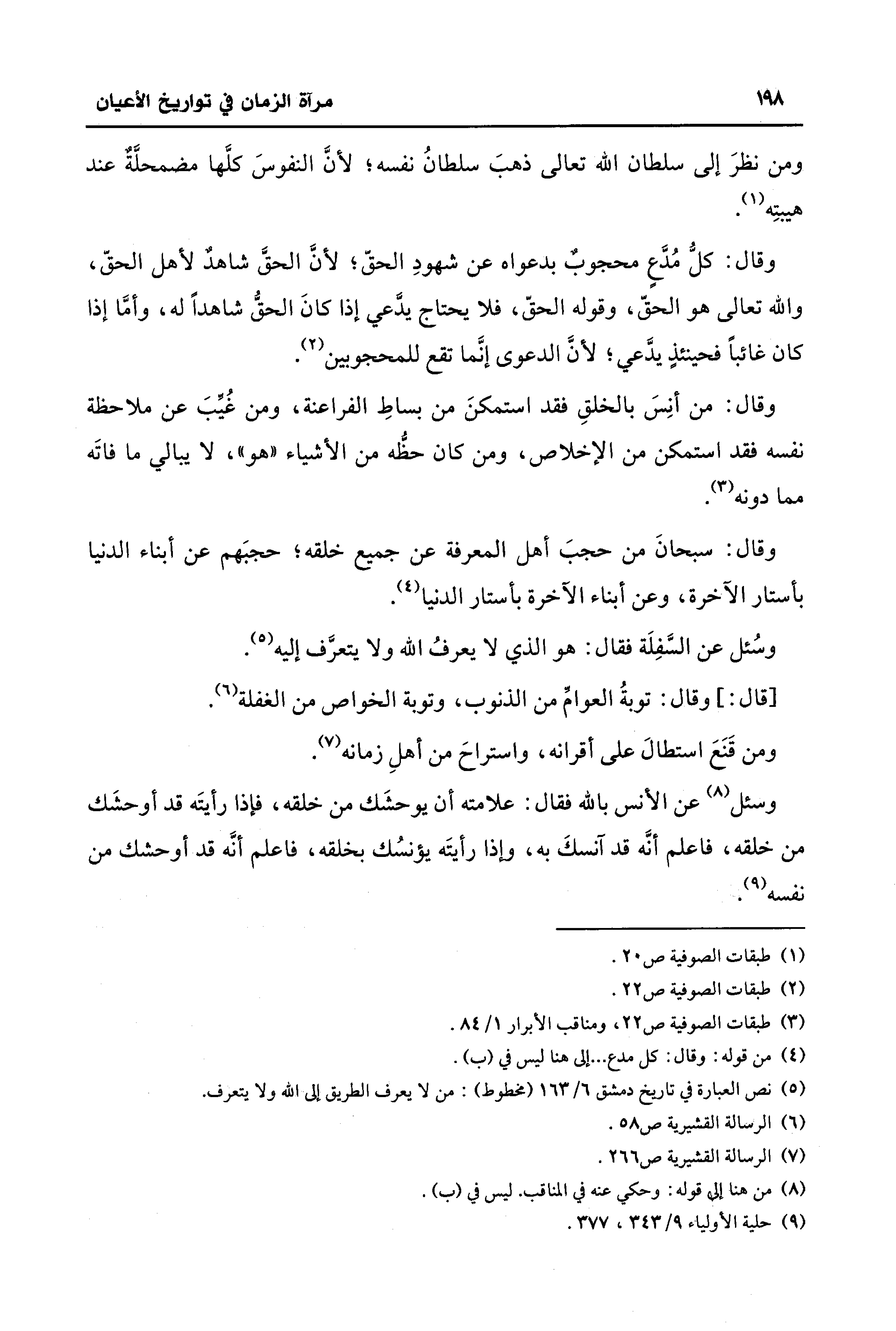 وقال: سبحانَ من حجبَ أهل المعرفة عن جميع خلقه؛ حجبَهم عن أبناء الدنيا بأستار الآخرة، وعن أبناء الآخرة بأستار الدنيا (¬4).