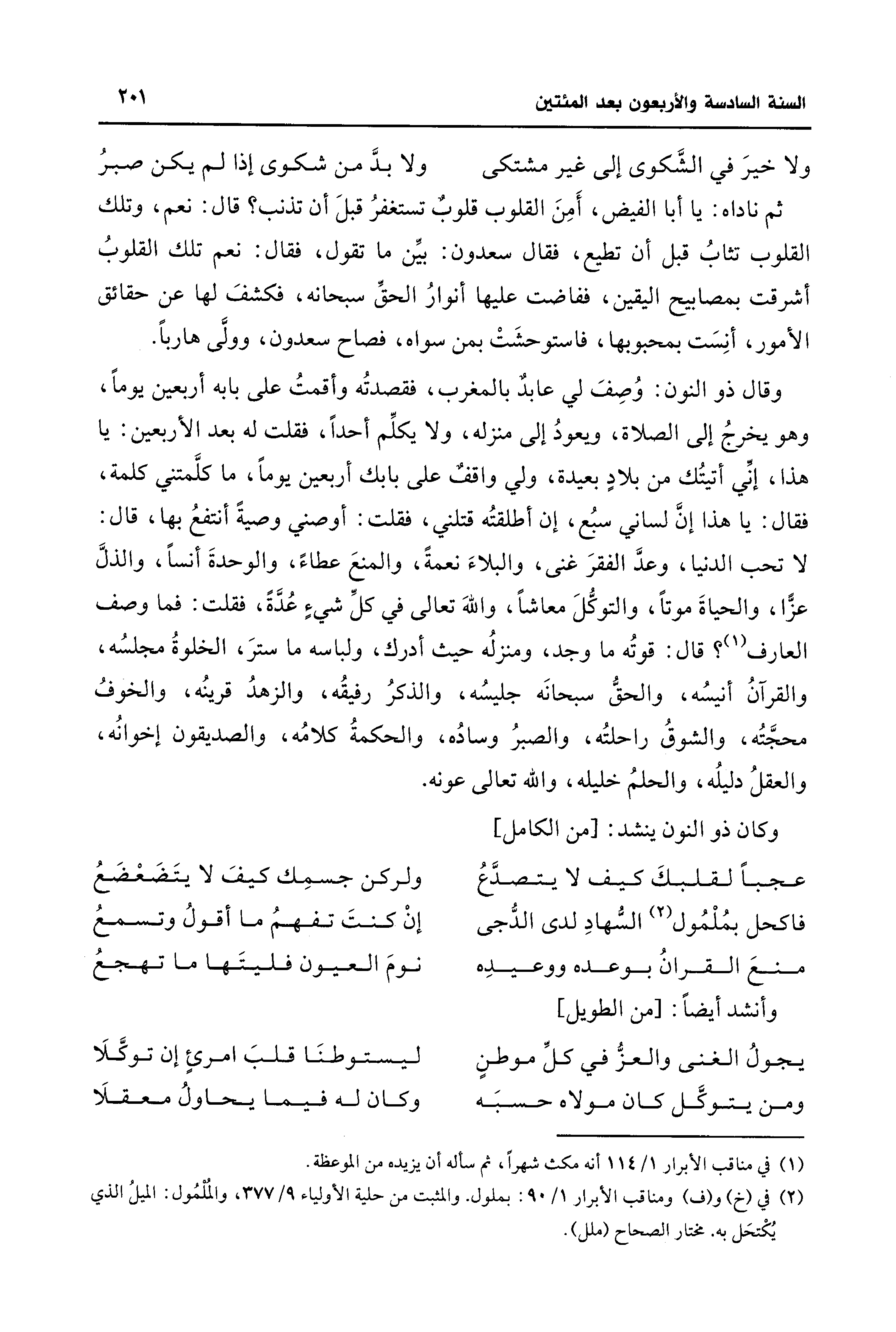وقال ذو النون: وُصِفَ لي عابدٌّ بالمغرب، فقصدتُه وأقمتُ على بابه أربعين يومًا، وهو يخرجُ إلى الصلاة، ويعودُ إلى منزله، ولا يكلِّم أحدًا، فقلت له بعد الأربعين: يا هذا، إنِّي أتيتُك من بلادٍ بعيدة، ولي واقفٌ على بابك أربعين يومًا، ما كلَّمتني كلمة، فقال: يا هذا إنَّ لساني سبُع، إن أطلقتُه قتلني، فقلت: أوصني وصيةً أنتفعُ بها، قال: لا تحب الدنيا، وعدَّ الفقرَ غنى، والبلاءَ نعمةً، والمنعَ عطاءً، والوحدةَ أنسًا، والذلَّ عزًّا، والحياةَ موتًا، والتوكُّلَ معاشًا، واللهَ تعالى في كلِّ شيءٍ عُدَّةً، فقلت: فما وصف العارف (¬1)؟ قال: قوتُه ما وجد، ومنزلُه حيث أدرك، ولباسه ما سترَ، الخلوةُ مجلسُه، والقرآنُ أنيسُه، والحقُّ سبحانَه جليسُه، والذكرُ رفيقُه، والزهدُ قرينُه، والخوفُ محجَّتُه، والشوقُ راحلتُه، والصبرُ وسادُه، والحكمةُ كلامُه، والصديقون إخوانُه، والعقلُ دليلُه، والحلمُ خليله، والله تعالى عونه.