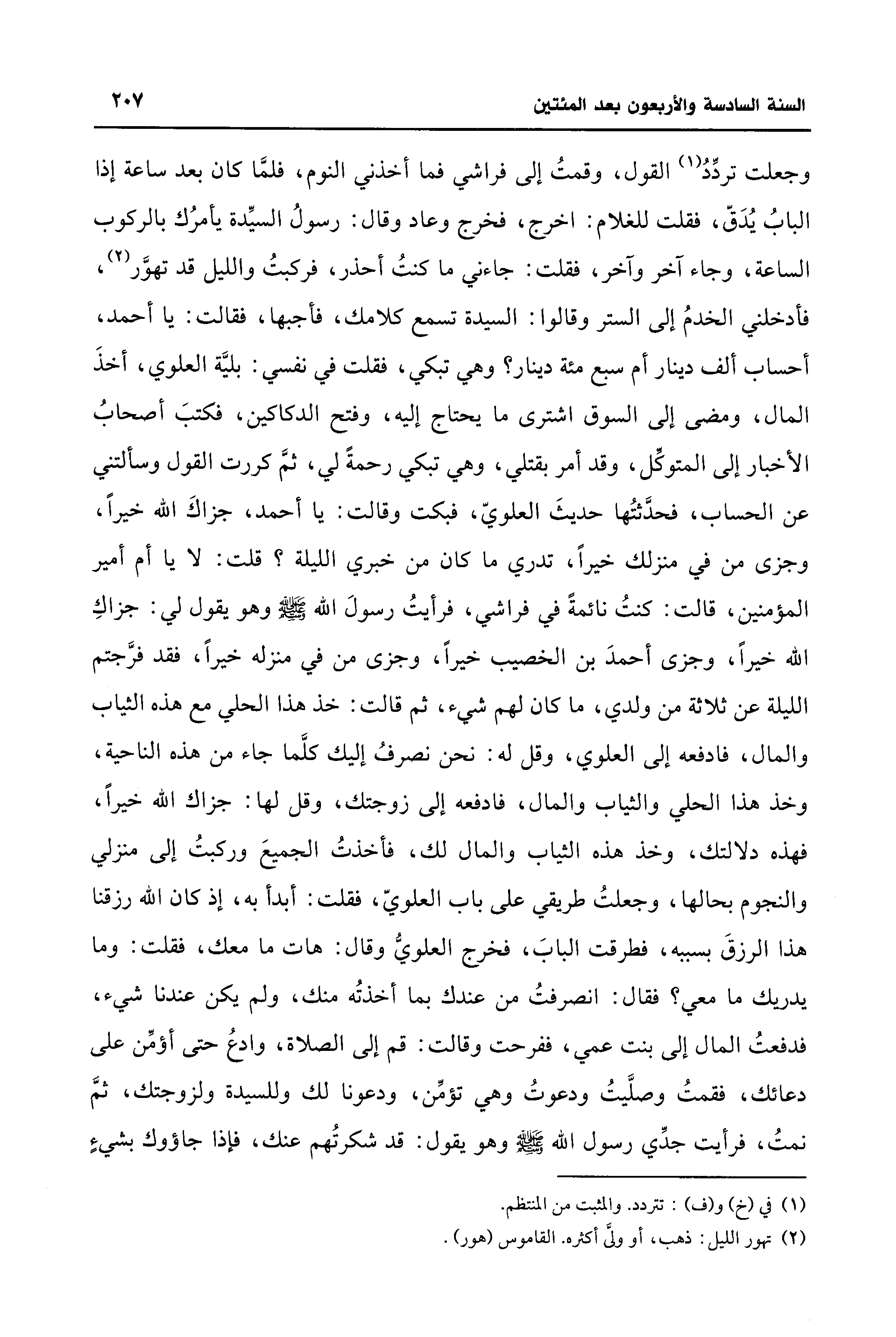 وجعلت تردِّدُ (¬1) القول، وقمتُ إلى فراشي فما أخذني النوم، فلمَّا كان بعد ساعة إذا البابُ يُدَقّ، فقلت للغلام: اخرج، فخرج وعاد وقال: رسول السيِّدة يأمرُك بالركوب الساعة، وجاء آخر وآخر، فقلت: جاءني ما كنتُ أحذر، فركبتُ والليل قد تهوَّر (¬2)، فأدخلني الخدمُ إلى الستر وقالوا: السيدة تسمع كلامك، فأجبها، فقالت: يا أحمد، أحساب ألف دينار أم سبع مئة دينار؟ وهي تبكي، فقلت في نفسي: بليَّة العلوي، أخذَ المال، ومضى إلى السوق اشترى ما يحتاج إليه، وفتح الدكاكين، فكتبَ أصحابُ الأخبار إلى المتوكِّل، وقد أمر بقتلي، وهي تبكي رحمةً لي، ثم كررت القول وسألتني عن الحساب، فحدَّثتُها حديثَ العلويّ، فبكت وقالت: يا أحمد، جزاكَ الله خيرًا، وجزى من في منزلك خيرًا، تدري ما كان من خبري الليلة؟ قلت: لا يا أم أمير المؤمنين، قالت: كنتُ نائمةً في فراشي، فرأيتُ رسول الله - صلى الله عليه وسلم - وهو يقول لي: جزاكِ الله خيرًا، وجزى أحمدَ بن الخصيب خيرًا، وجزى من في منزله خيرًا، فقد فرَّجتم الليلة عن ثلاثة من ولدي، ما كان لهم شيء، ثم قالت: خذ هذا الحلي مع هذه الثياب والمال، فادفعه إلى العلوي، وقل له: نحن نصرفُ إليك كلَّما جاء من هذه الناحية، وخذ هذا الحلي والثياب والمال، فادفعه إلى زوجتك، وقل لها: جزاك الله خيرًا، فهذه دلالتك، وخذ هذه الثياب والمال لك، فأخذتُ الجميعَ وركبتُ إلى منزلي والنجوم بحالها، وجعلتُ طريقي على باب العلويّ، فقلت: أبدأ به، إذ كان الله رزقنا هذا الرزقَ بسببه، فطرقت البابَ، فخرج العلويُّ وقال: هات ما معك، فقلت: وما يدريك ما معي؟ فقال: انصرفتُ من عندك بما أخذتُه منك، ولم يكن عندنا شيء، فدفعتُ المال إلى بنت عمي، ففرحت وقالت: قم إلى الصلاة، وادعُ حتى أؤمِّن على دعائك، فقمتُ وصلَّيتُ ودعوتُ وهي تؤمِّن، ودعونا لك وللسيدة ولزوجتك، ثمَّ نمتُ، فرأيت جدِّي رسول الله - صلى الله عليه وسلم - وهو يقول: قد شكرتُهم عنك، فإذا جاؤوك بشيءٍ