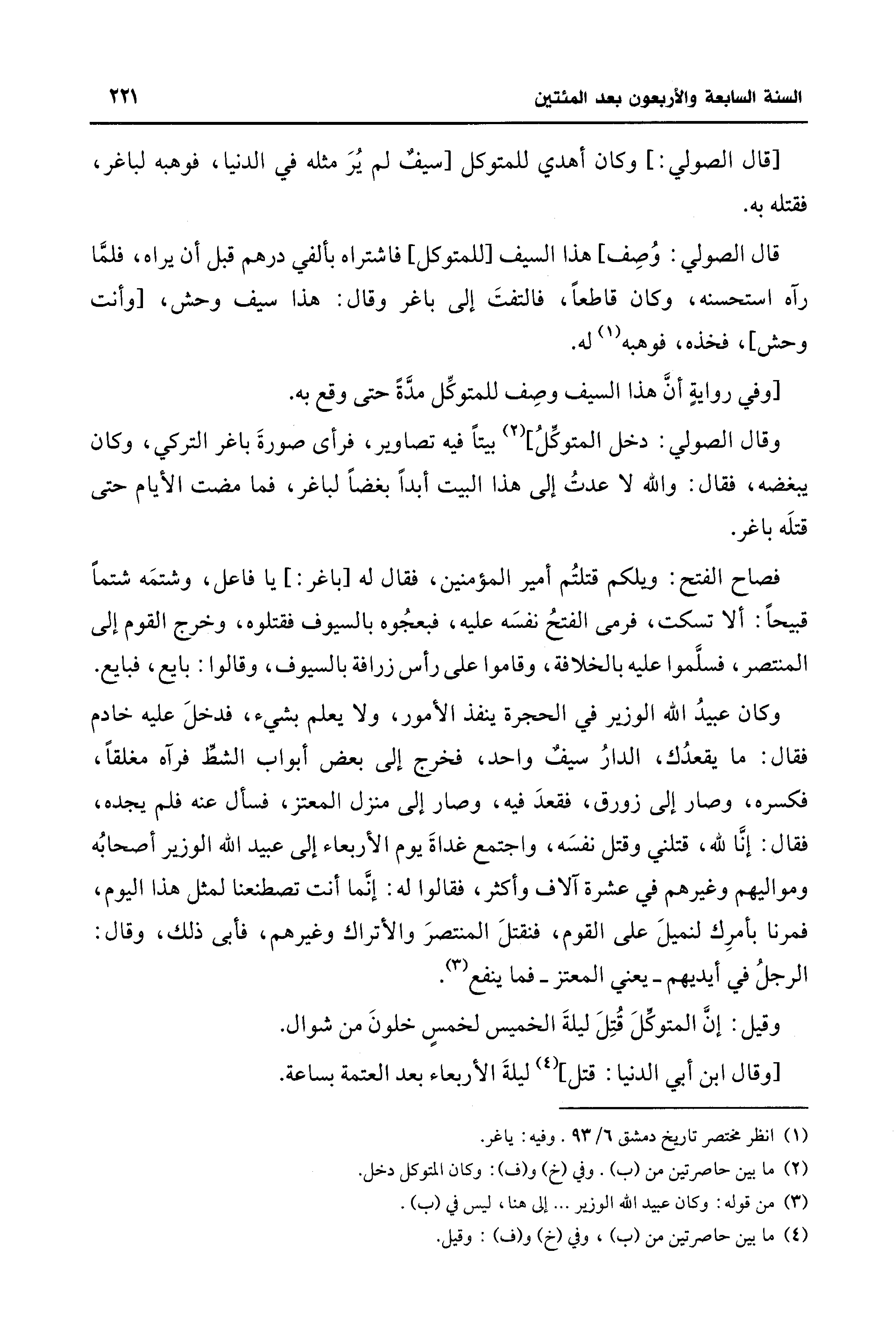 [قال الصولي: ] وكان أهدي للمتوكل [سيفٌ لم يُرَ مثله في الدنيا، فوهبه لباغر، فقتله به.