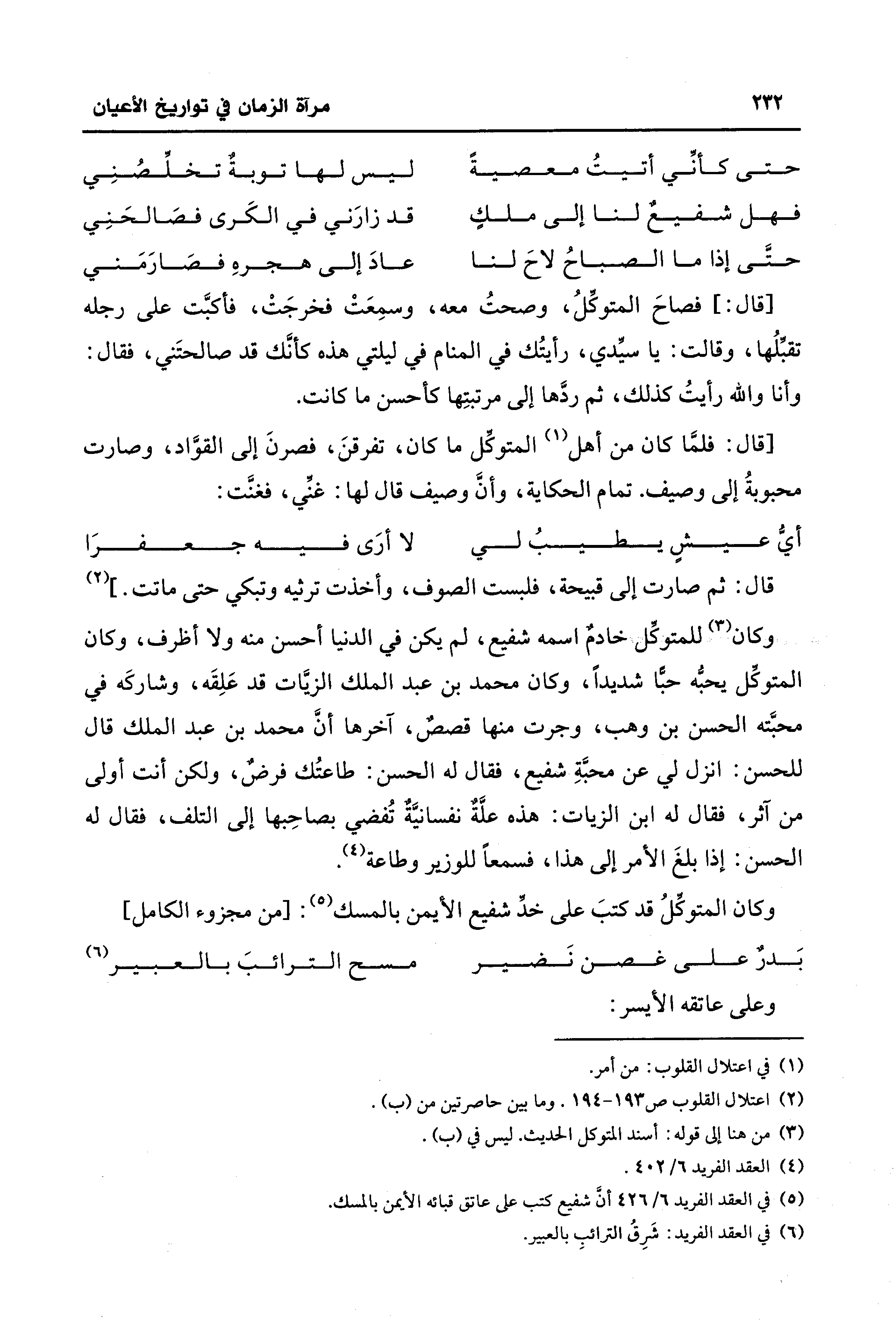 وكان (¬3) للمتوكِّل خادم اسمه شفيع، لم يكن في الدنيا أحسن منه ولا أظرف، وكان المتوكِّل يحبُّه حبًّا شديدًا، وكان محمد بن عبد الملك الزيّات قد عَلِقَه، وشاركَه في محبَّته الحسن بن وهب، وجرت منها قصص، آخرها أنَّ محمد بن عبد الملك قال للحسن: انزل لي عن محبَّةِ شفيع، فقال له الحسن: طاعتُك فرض، ولكن أنت أولى من آثر، فقال له ابن الزيات: هذه علةٌ نفسانية تُفضي بصاحِبها إلى التلف، فقال له الحسن: إذا بلغَ الأمر إلى هذا، فسمعًا للوزير وطاعة (¬4).