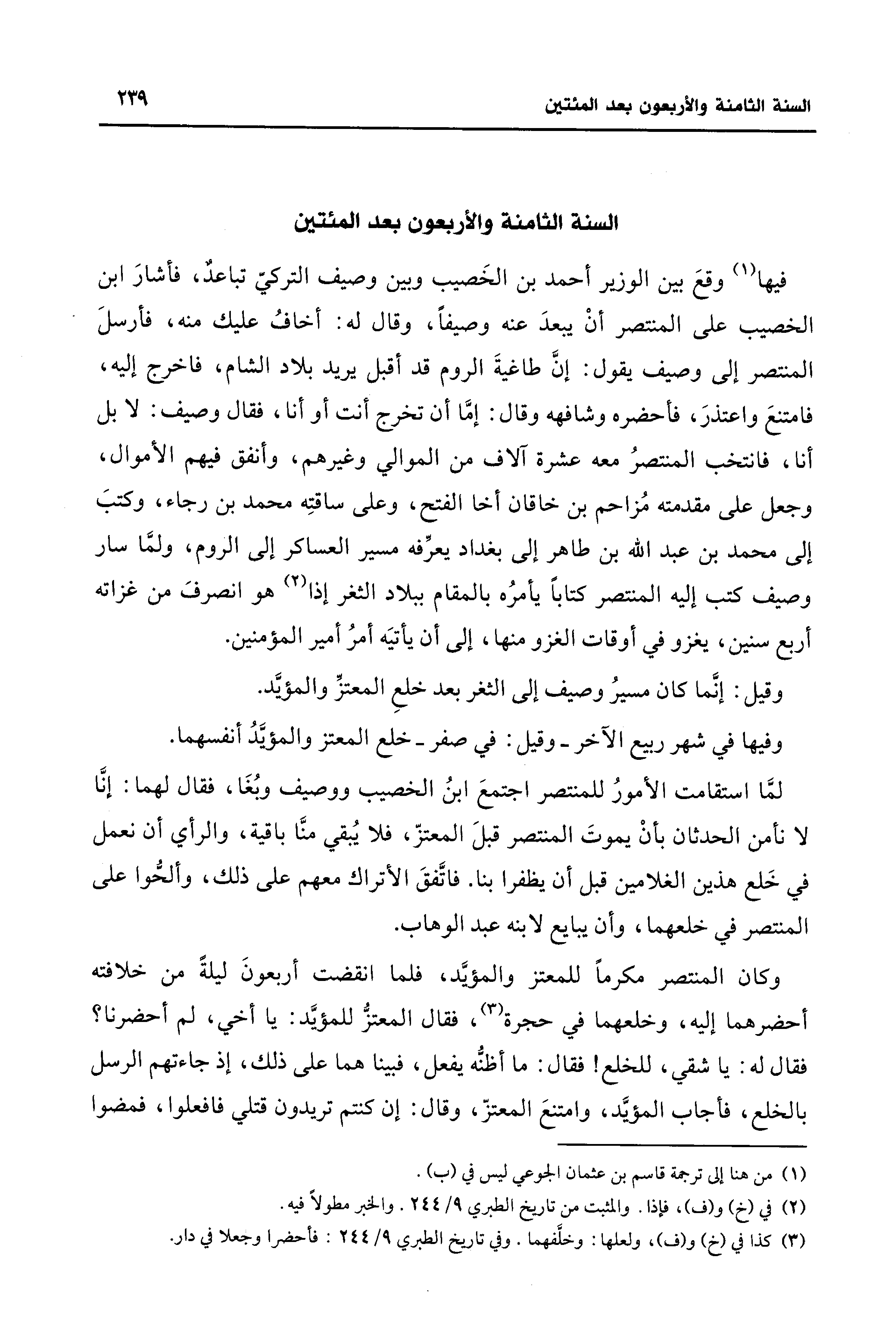 فيها (¬1) وقعَ بين الوزير أحمد بن الخَصيب وبين وصيف التركيّ تباعدٌ، فأشارَ ابن الخصيب على المنتصر أنْ يبعدَ عنه وصيفًا، وقال له: أخافُ عليك منه، فأرسلَ المنتصر إلى وصيف يقول: إنَّ طاغيةَ الروم قد أقبل يريد بلاد الشام، فاخرج إليه، فامتنعَ واعتذرَ، فأحضره وشافهه وقال: إمَّا أن تخرج أنت أو أنا، فقال وصيف: لا بل أنا، فانتخب المنتصرُ معه عشرة آلاف من الموالي وغيرهم، وأنفق فيهم الأموال، وجعل على مقدمته مُزاحم بن خاقان أخا الفتح، وعلى ساقتِه محمد بن رجاء، وكتبَ إلى محمد بن عبد الله بن طاهر إلى بغداد يعرِّفه مسير العساكر إلى الروم، ولمَّا سار وصيف كتب إليه المنتصر كتابًا يأمرُه بالمقام ببلاد الثغر إذا (¬2) هو انصرفَ من غزاته أربع سنين، يغزو في أوقات الغزو منها، إلى أن يأتيَه أمرُ أمير المؤمنين.