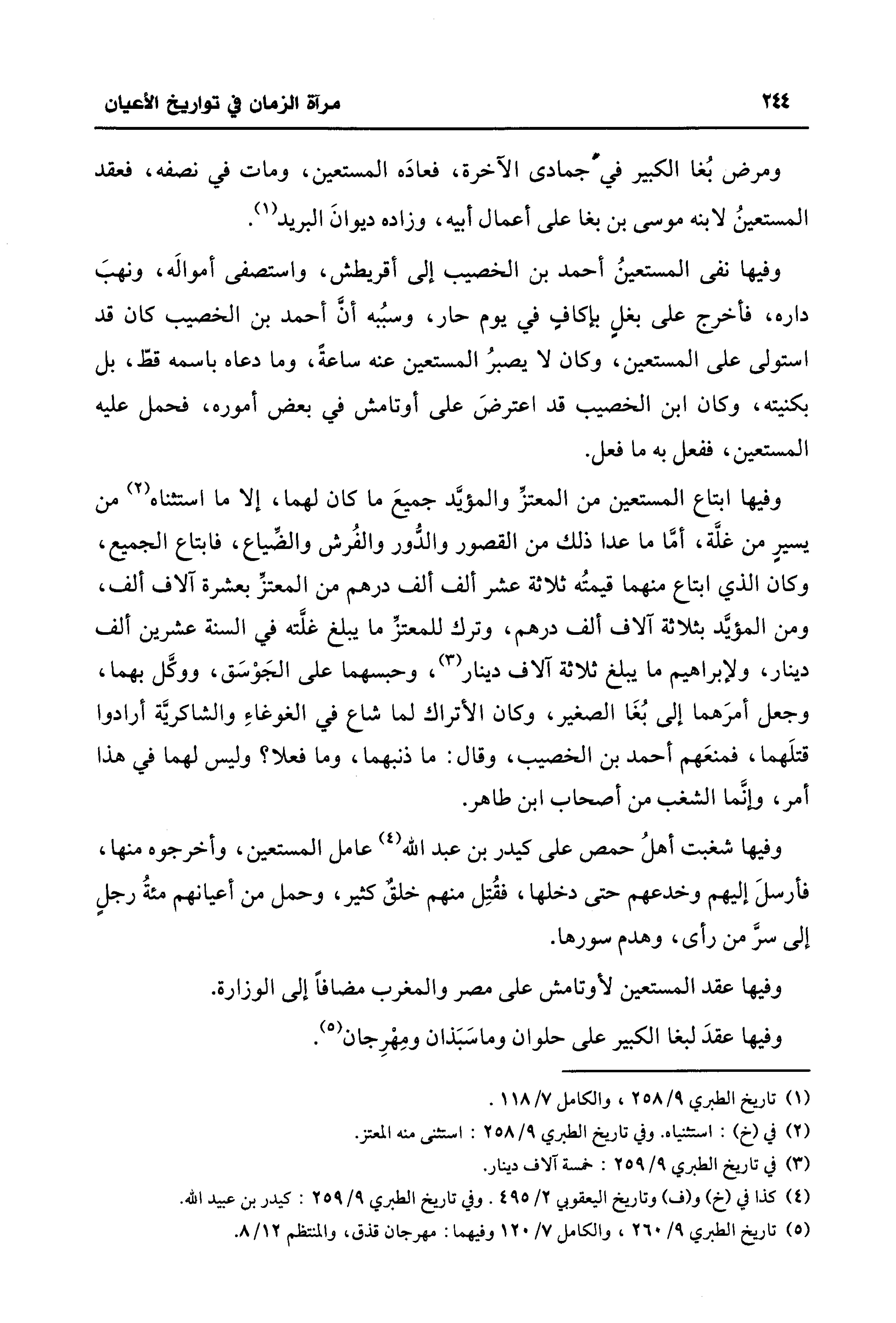 وفيها ابتاع المستعين من المعتزِّ والمؤيد جميعَ ما كان لهما، إلا ما استثناه (¬2) من يسيرٍ من غلَّة، أما ما عدا ذلك من القصور والدّور والفُرش والضِّياع، فابتاع الجميع، وكان الذي ابتاع منهما قيمتُه ثلاثة عشر ألف ألف درهم من المعتزِّ بعشرة آلاف ألف، ومن المؤيَّد بثلاثة آلاف ألف درهم، وترك للمعتزِّ ما يبلغ غلته في السنة عشرين ألف دينار، ولإبراهيم ما يبلغ ثلاثة آلاف دينار (¬3)، وحبسهما على الجَوْسَق، ووكَّل بهما، وجعل أمرَهما إلى بُغَا الصغير، وكان الأتراك لما شاع في الغوغاءِ والشاكريَّة أرادوا قتلَهما، فمنعَهم أحمد بن الخصيب، وقال: ما ذنبهما، وما فعلا؟ وليس لهما في هذا أمر، وإنَّما الشغب من أصحاب ابن طاهر.