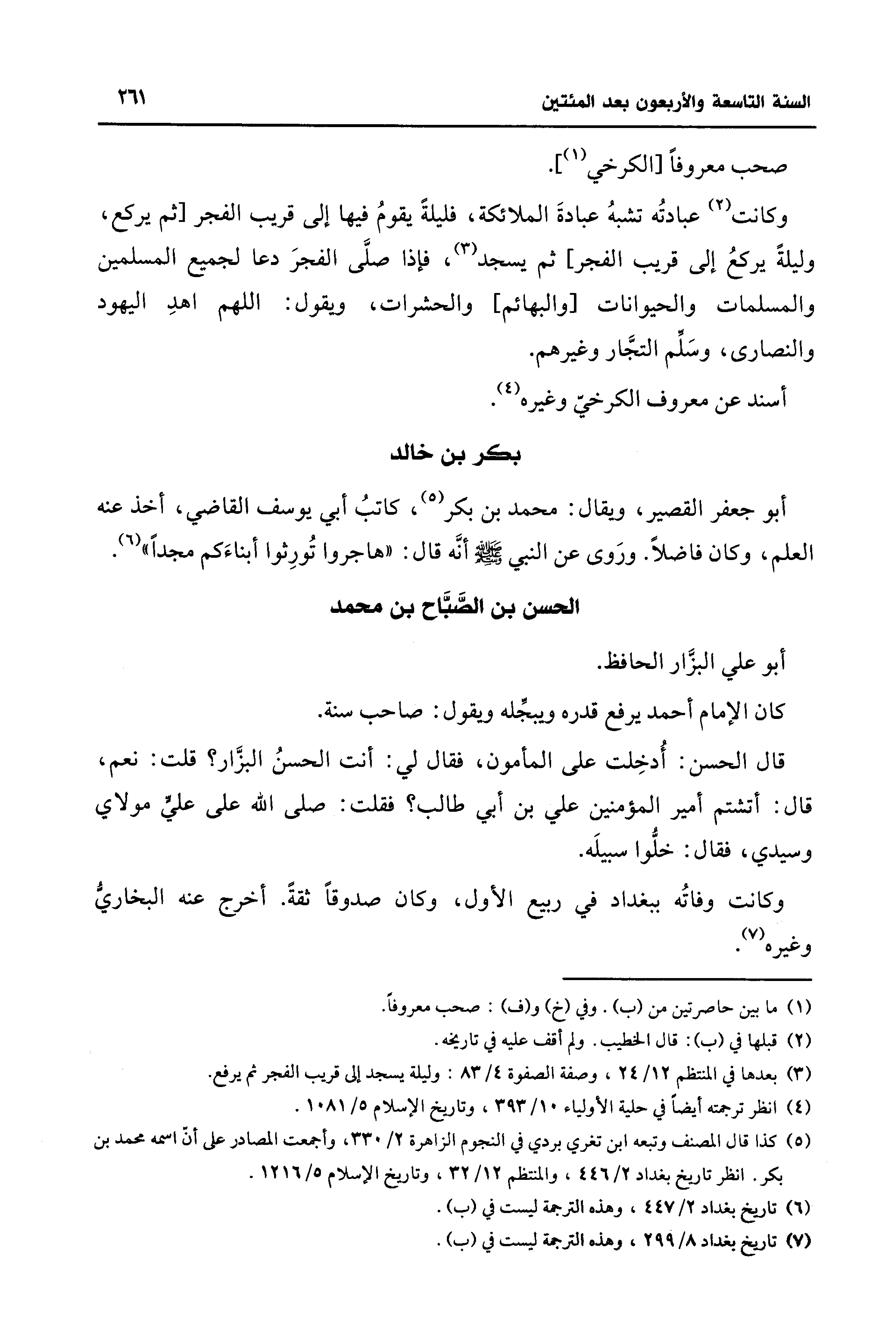 (¬5) كذا قال المصنف وتبعه ابن تغري بردي في النجوم الزاهرة 2/ 330، وأجمعت المصادر على أن اسمه محمد بن بكر. انظر تاريخ بغداد 2/ 446، والمنتظم 12/ 32، وتاريخ الإسلام 5/ 1216.