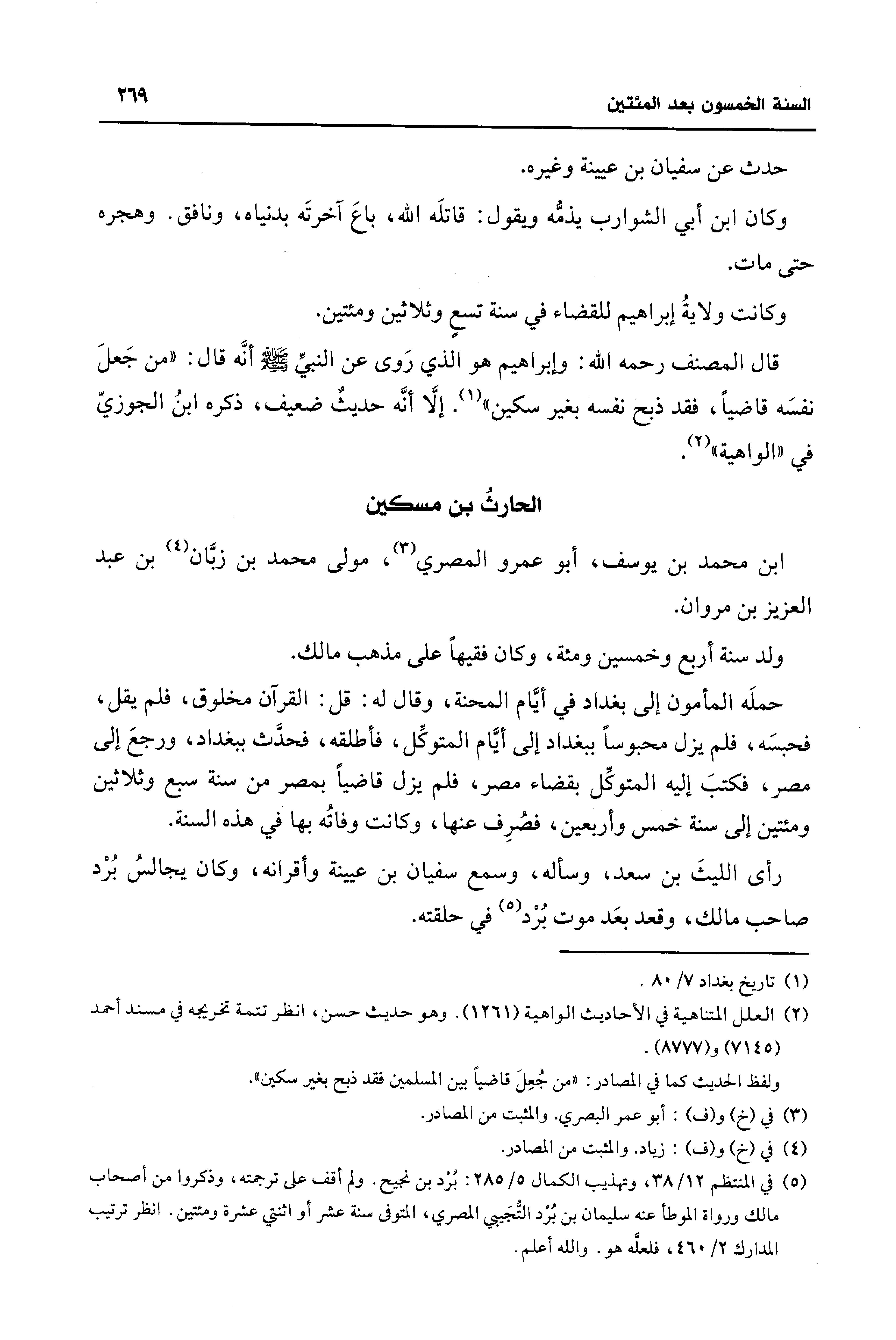 حملَه المأمون إلى بغداد في أيَّام المحنة، وقال له: قل: القرآن مخلوق، فلم يقل، فحبسَه، فلم يزل محبوسًا ببغداد إلى أيَّام المتوكِّل، فأطلقه، فحدَّث ببغداد، ورجعَ إلى مصر، فكتبَ إليه المتوكِّل بقضاء مصر، فلم يزل قاضيًا بمصر من سنة سبع وثلاثين ومئتين إلى سنة خمس وأربعين، فصُرِف عنها، وكانت وفاتُه بها في هذه السنة.