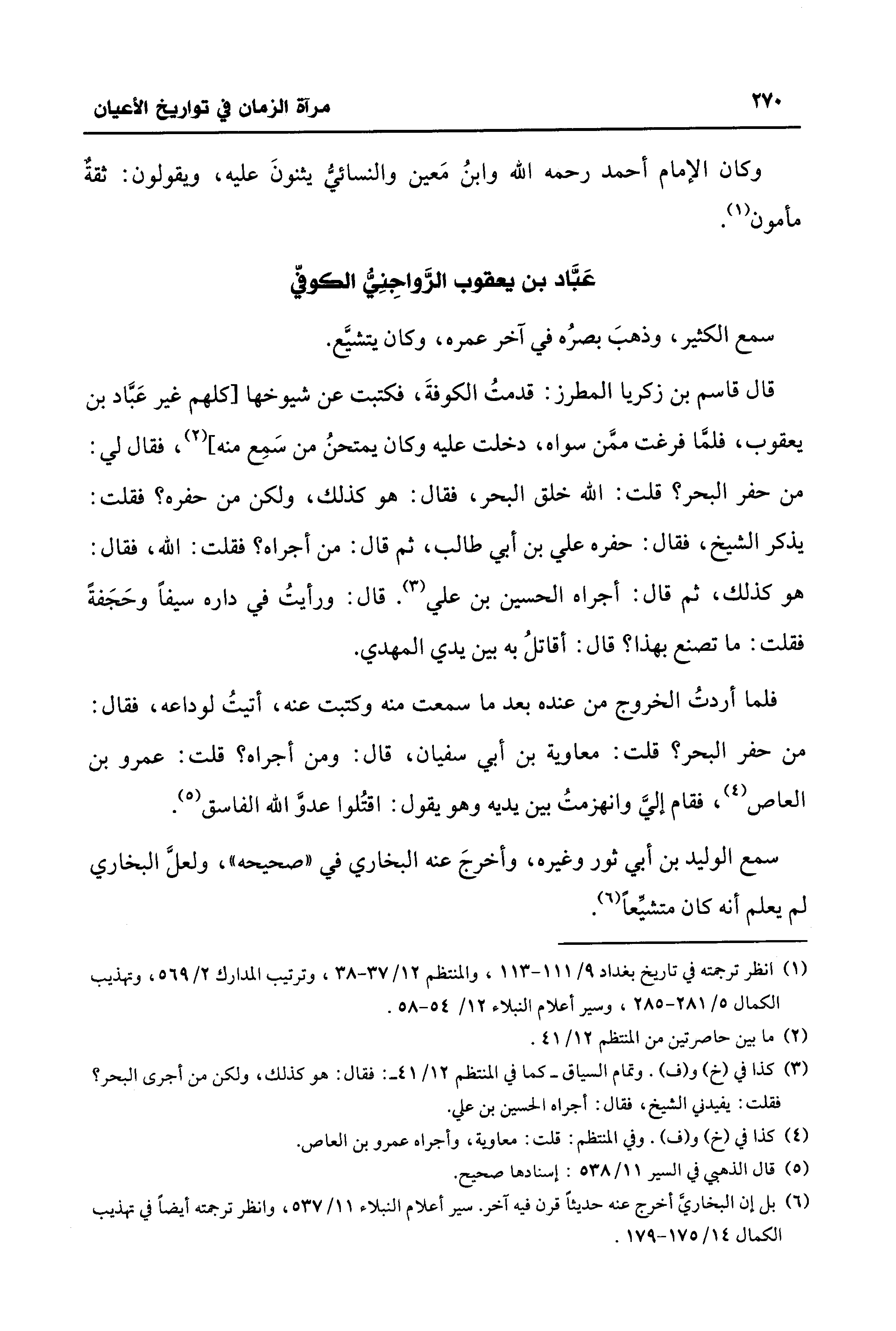 قال قاسم بن زكريا المطرز: قدمتُ الكوفةَ، فكتبت عن شيوخها [كلهم غير عَبَّاد بن يعقوب، فلمَّا فرغت ممَّن سواه، دخلت عليه وكان يمتحنُ من سَمِع منه] (¬2)، فقال لي: من حفر البحر؟ قلت: الله خلق البحر، فقال: هو كذلك، ولكن من حفره؟ فقلت: يذكر الشيخ، فقال: حفره علي بن أبي طالب، ثم قال: من أجراه؟ فقلت: الله، فقال: هو كذلك، ثم قال: أجراه الحسين بن علي (¬3). قال: ورأيتُ في داره سيفًا وحَجَفةً فقلت: ما تصنع بهذا؟ قال: أقاتلُ به بين يدي المهدي.