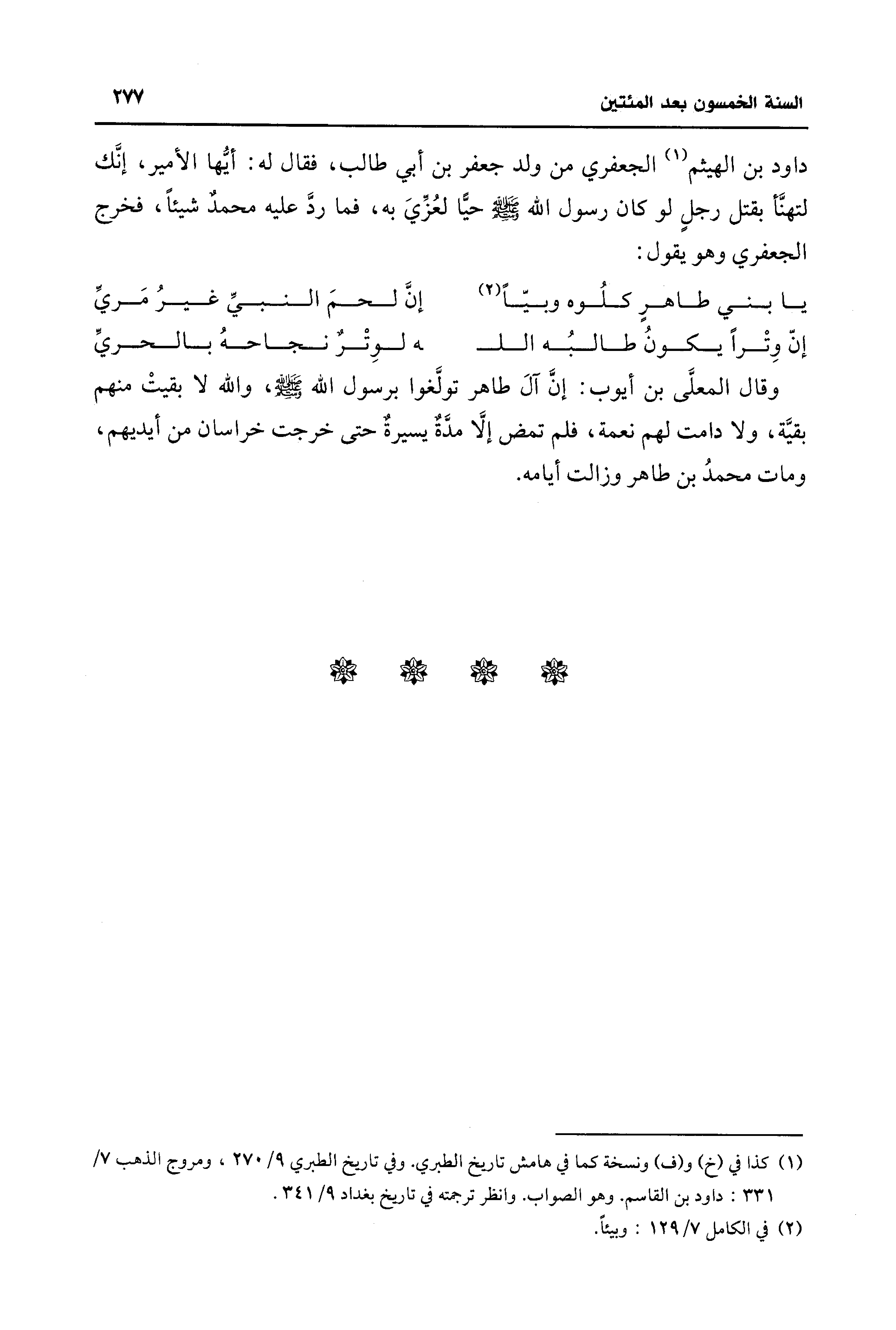 داود بن الهيثم (¬1) الجعفري من ولد جعفر بن أبي طالب، فقال له: أيُّها الأمير، إنَّك لتهنَّأ بقتل رجلٍ لو كان رسول الله - صلى الله عليه وسلم - حيًّا لعُزِّيَ به، فما ردَّ عليه محمدٌ شيئًا، فخرج الجعفري وهو يقول: