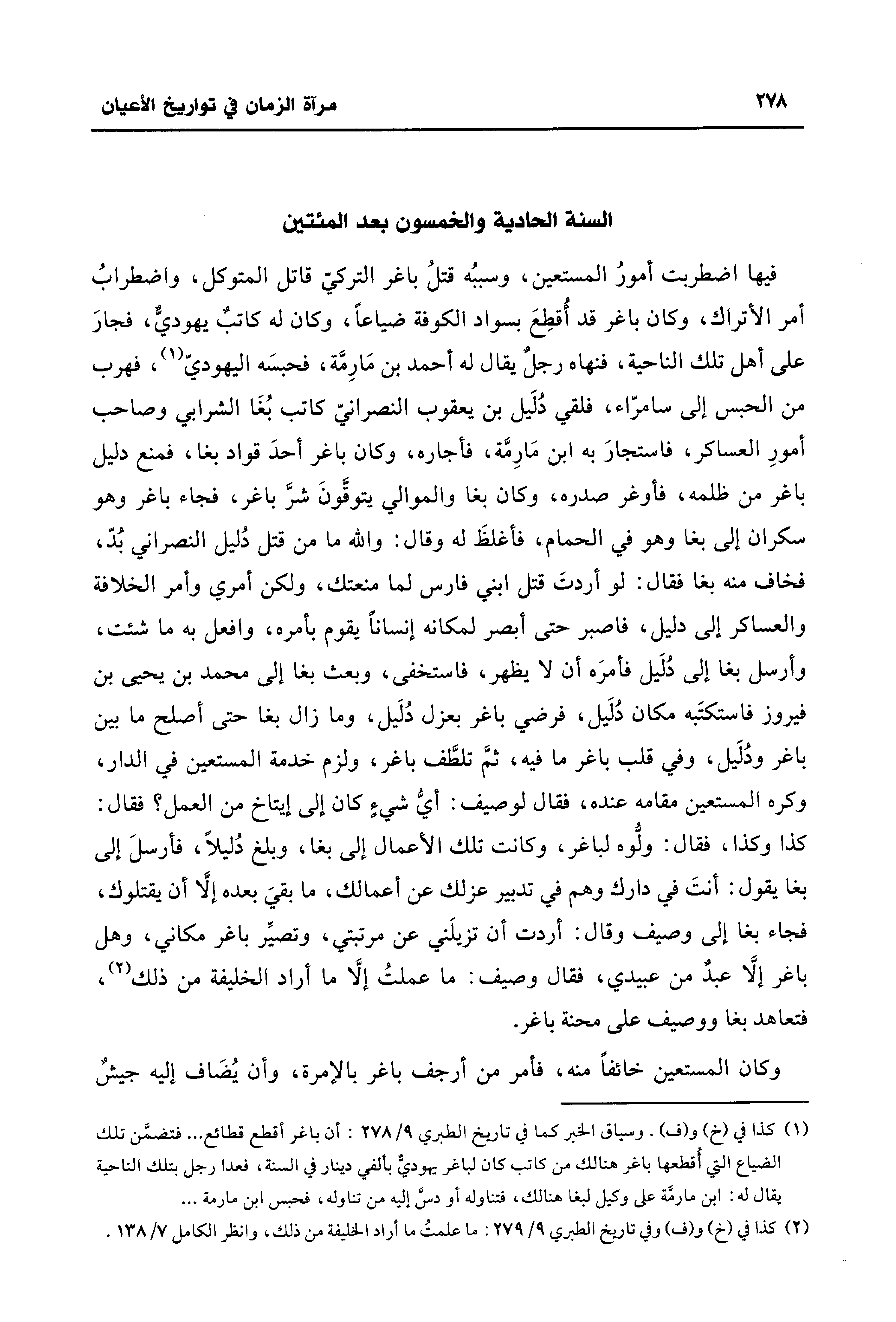 فيها اضطربت أمورُ المستعين، وسببُه قتلُ باغر التركيّ قاتل المتوكل، واضطرابُ أمر الأتراك، وكان باغر قد أُقطِعَ بسواد الكوفة ضياعًا، وكان له كاتبٌ يهوديٌّ، فجارَ على أهل تلك الناحية، فنهاه رجلٌ يقال له أحمد بن مَارِمَّة، فحبسَه اليهوديّ (¬1)، فهرب من الحبس إلى سامرّاء، فلقي دُلَيل بن يعقوب النصرانيّ كاتب بُغَا الشرابي وصاحب أمورِ العساكر، فاستجارَ به ابن مَارِمَّة، فأجاره، وكان باغر أحدَ قواد بغا، فمنع دليل باغر من ظلمه، فأوغر صدره، وكان بغا والموالي يتوقَّونَ شرَّ باغر، فجاء باغر وهو سكران إلى بغا وهو فِي الحمام، فأغلظَ له وقال: والله ما من قتل دُليل النصراني بُدّ، فخاف منه بغا فقال: لو أردتَ قتل ابني فارس لما منعتك، ولكن أمري وأمر الخلافة والعساكر إلى دليل، فاصبر حتَّى أبصر لمكانه إنسانًا يقوم بأمره، وافعل به ما شئت، وأرسل بغا إلى دُلَيل فأمرَه أن لا يظهر، فاستخفى، وبعث بغا إلى محمد بن يحيى بن فيروز فاستكتَبه مكان دُلَيل، فرضي باغر بعزل دُلَيل، وما زال بغا حتَّى أصلح ما بين باغر ودُلَيل، وفي قلب باغر ما فيه، ثمَّ تلطَّف باغر، ولزم خدمة المستعين فِي الدار، وكره المستعين مقامه عنده، فقال لوصيف: أيُّ شيءٍ كان إلى إيتاخ من العمل؟ فقال: كذا وكذا، فقال: ولُّوه لباغر، وكانت تلك الأعمال إلى بغا، وبلغ دُليلًا، فأرسلَ إلى بغا يقول: أنتَ فِي دارك وهم فِي تدبير عزلك عن أعمالك، ما بقيَ بعده إلَّا أن يقتلوك، فجاء بغا إلى وصيف وقال: أردت أن تزيلَني عن مرتبتي، وتصيِّر باغر مكاني، وهل باغر إلَّا عبدٌ من عبيدي، فقال وصيف: ما عملتُ إلَّا ما أراد الخليفة من ذلك (¬2)، فتعاهد بغا ووصيف على محنة باغر.