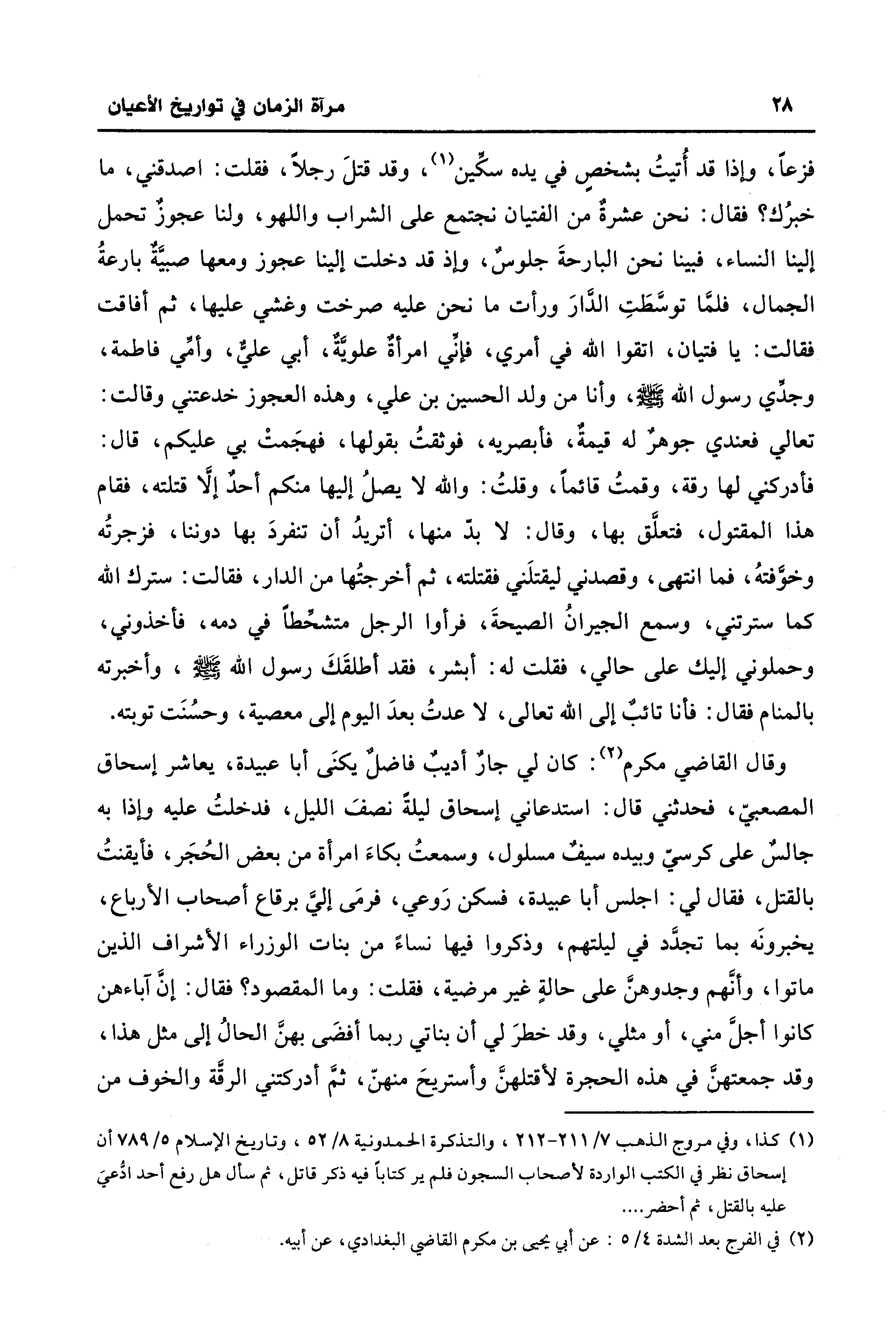 وقال القاضي مكرم (¬2): كان لي جارٌ أديبٌ فاضلٌ يكنَى أبا عبيدة، يعاشر إسحاق المصعبيّ، فحدثني قال: استدعاني إسحاق ليلة نصفَ الليل، فدخلتُ عليه وإذا به جالسٌ على كرسيّ وبيده سيفٌ مسلول، وسمعتُ بكاءَ امرأة من بعض الحُجَر، فأيقنتُ بالقتل، فقال لي: اجلس أبا عبيدة، فسكن رَوعي، فرمَى إليَّ برقاع أصحاب الأرباع، يخبرونَه بما تجدَّد في ليلتهم، وذكروا فيها نساءً من بنات الوزراء الأشراف الذين ماتوا، وأنَّهم وجدوهنَّ على حالةٍ غير مرضية، فقلت: وما المقصود؟ فقال: إنَّ آباءهن كانوا أجلَّ مني، أو مثلي، وقد خطرَ لي أن بناتي ربما أفضَى بهنَّ الحالُ إلى مثل هذا، وقد جمعتهنَّ في هذه الحجرة لأقتلهنَّ وأستريحَ منهنّ، ثمَّ أدركتني الرقَّة والخوف من