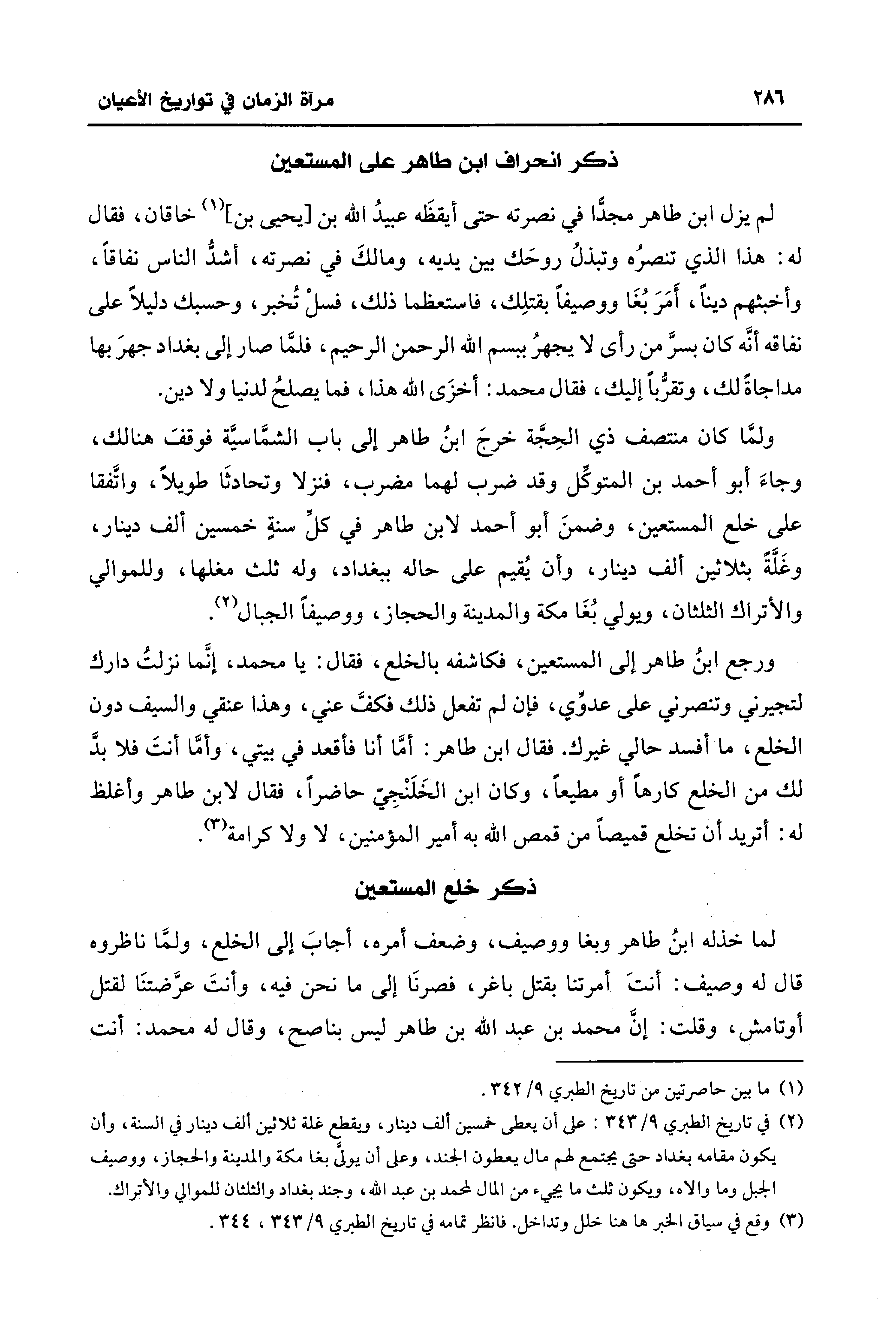 (¬3) وقع فِي سياق الخبر ها هنا خلل وتداخل. فانظر تمامه فِي تاريخ الطبري 9/ 343، 344.