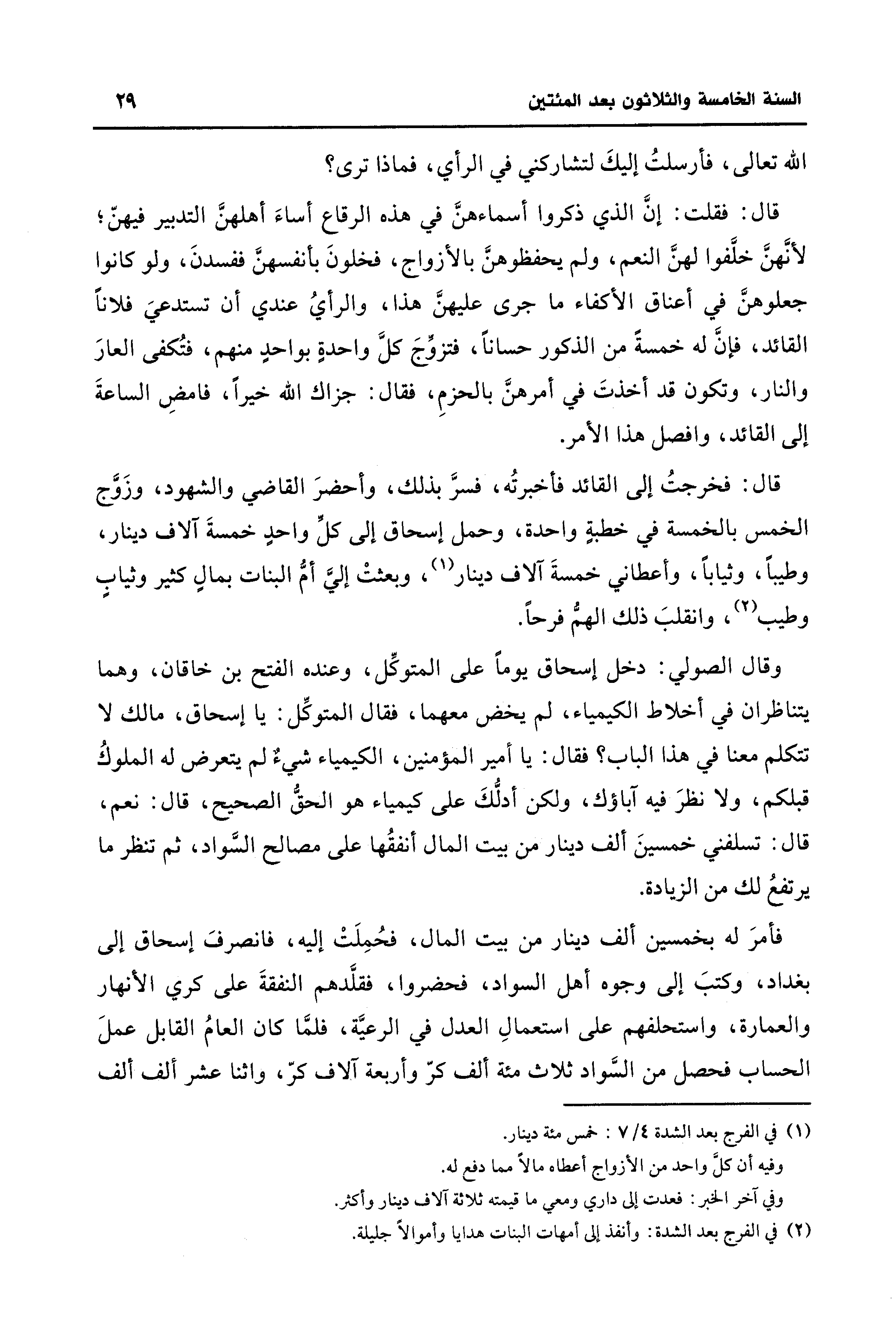 وقال الصولي: دخل إسحاق يومًا على المتوكِّل، وعنده الفتح بن خاقان، وهما يتناظران في أخلاط الكيمياء، لم يخض معهما، فقال المتوكِّل: يا إسحاق، مالك لا تتكلم معنا في هذا الباب؟ فقال: يا أمير المؤمنين، الكيمياء شيءٌ لم يتعرض له الملوكُ قبلكم، ولا نظرَ فيه آباؤك، ولكن أدلُّكَ على كيمياء هو الحقُّ الصحيح، قال: نعم، قال: تسلفني خمسينَ ألف دينار من بيت المال أنفقُها على مصالح السَّواد، ثم تنظر ما يرتفعُ لك من الزيادة.