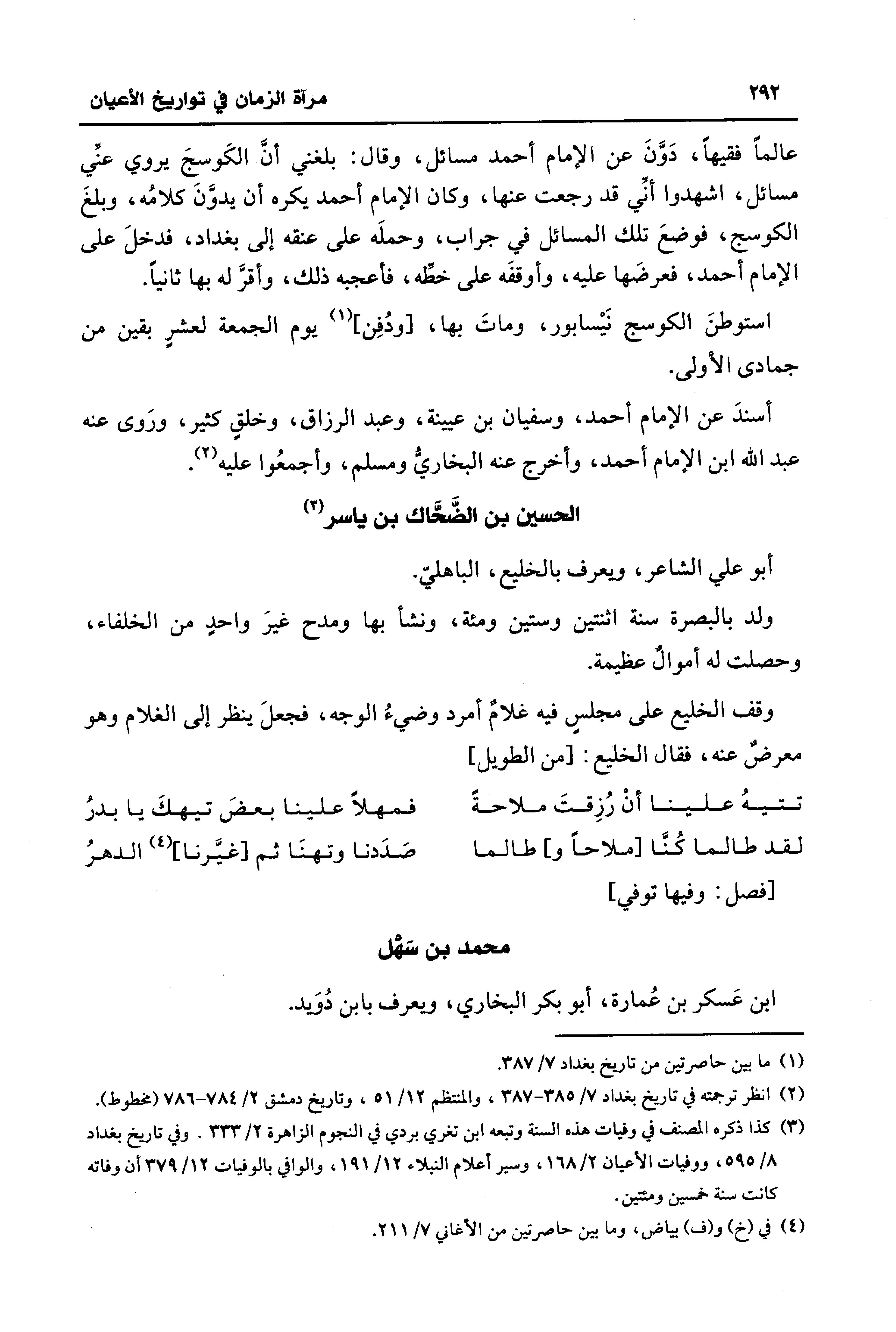 (¬3) كذا ذكره المصنف فِي وفيات هذه السنة وتبعه ابن تغري بردي فِي النجوم الزاهرة 2/ 333. وفي تاريخ بغداد 8/ 595، ووفيات الأعيان 2/ 168، وسير أعلام النبلاء 12/ 191، والوافِي بالوفيات 12/ 379 أن وفاته كانت سنة خمسين ومئتين.