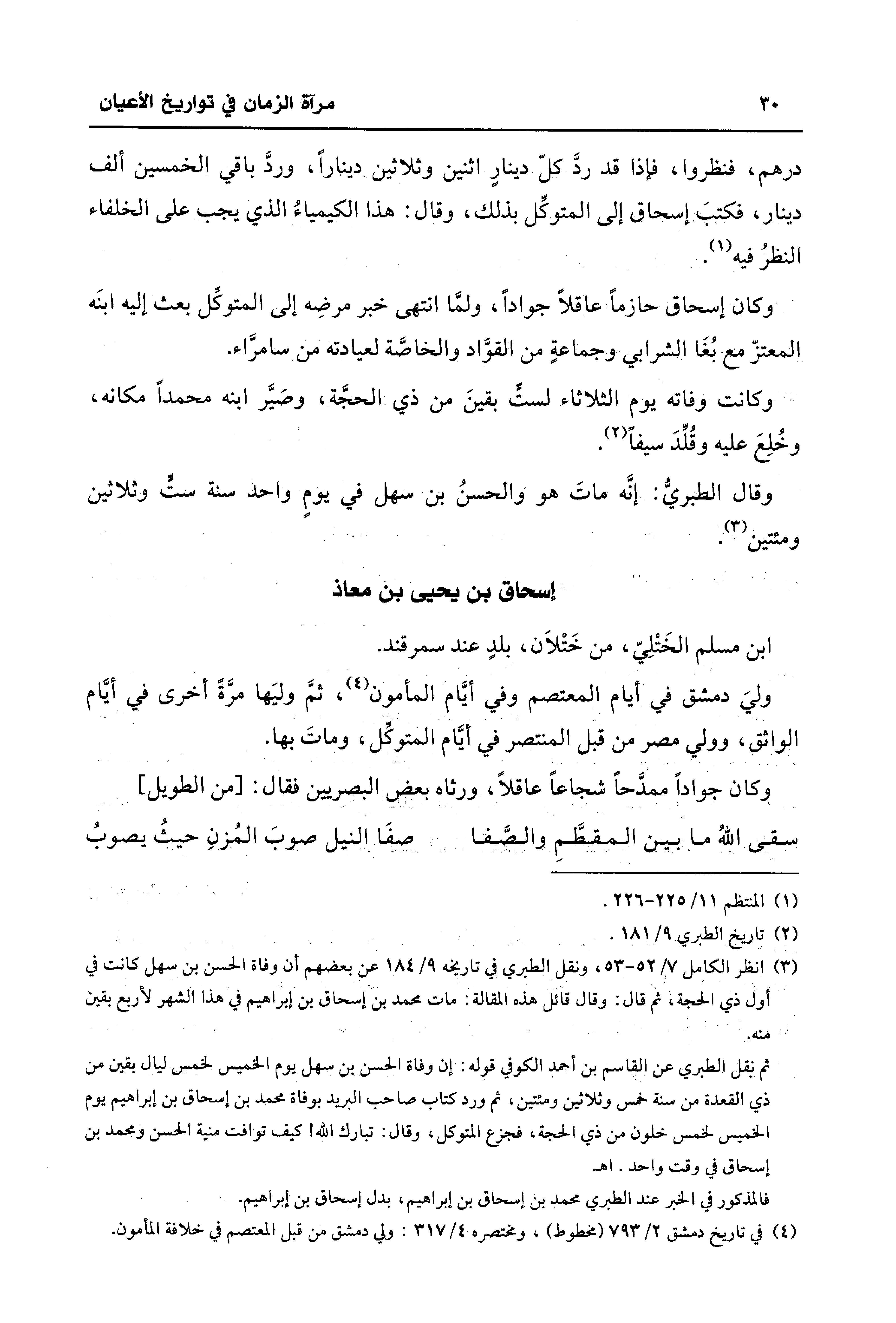 (¬3) انظر الكامل 7/ 52 - 53، ونقل الطبري في تاريخه 9/ 184 عن بعضهم أن وفاة الحسن بن سهل كانت في أول ذي الحجة، ثم قال: وقال قائل هذه المقالة: مات محمد بن إسحاق بن إبراهيم في هذا الشهر لأربع بقين منه.
