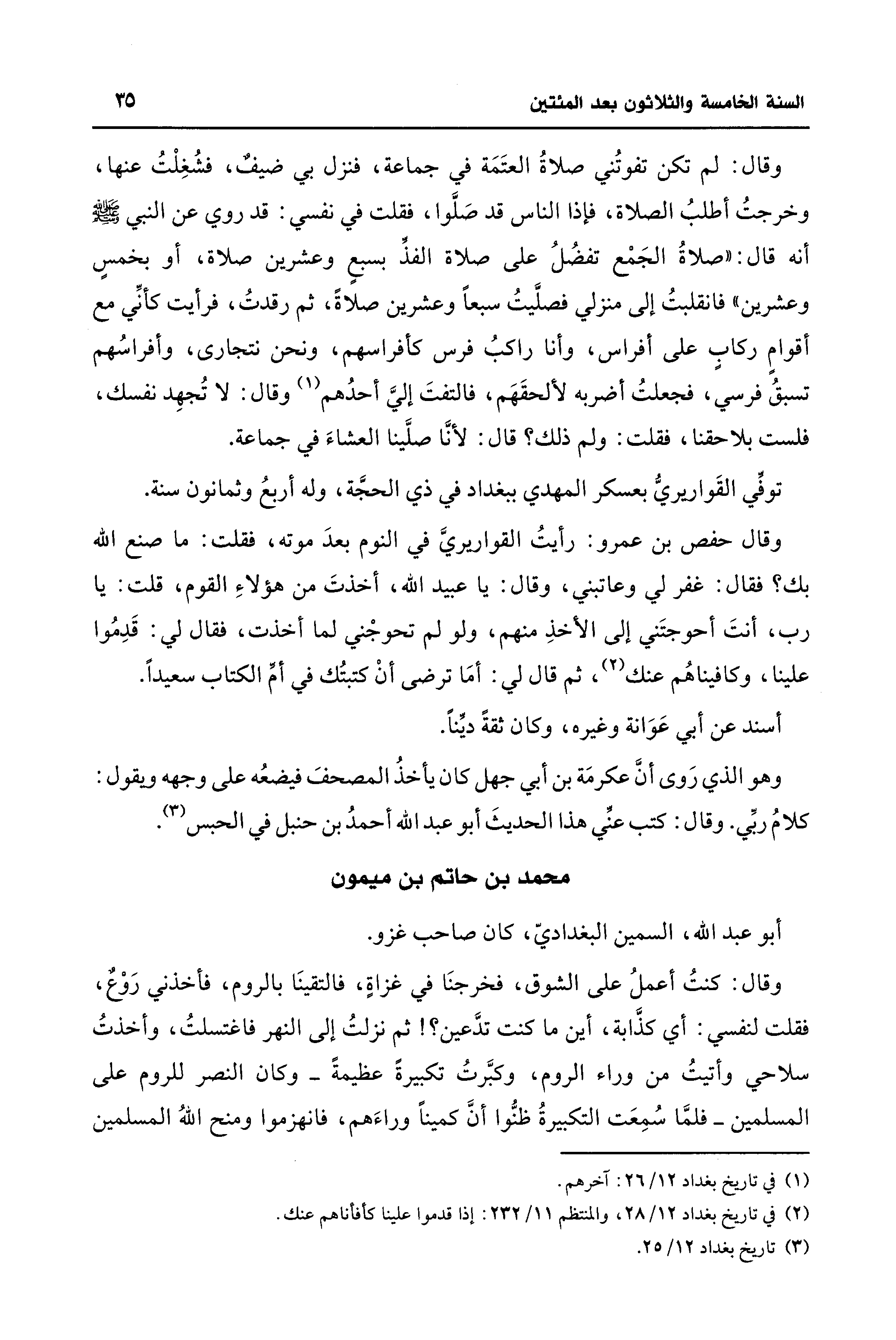 وقال حفص بن عمرو: رأيتُ القواريريَّ في النوم بعدَ موته، فقلت: ما صنع الله بك؟ فقال: غفر لي وعاتبني، وقال: يا عبيد الله، أخذتَ من هؤلاءِ القوم، قلت: يا رب، أنتَ أحوجتَني إلى الأخذِ منهم، ولو لم تحوجْني لما أخذت، فقال لي: قَدِمُوا علينا، وكافيناهُم عنك (¬2)، ثم قال لي: أمَّا ترضى أنْ كتبتُك في أم الكتاب سعيدًا.