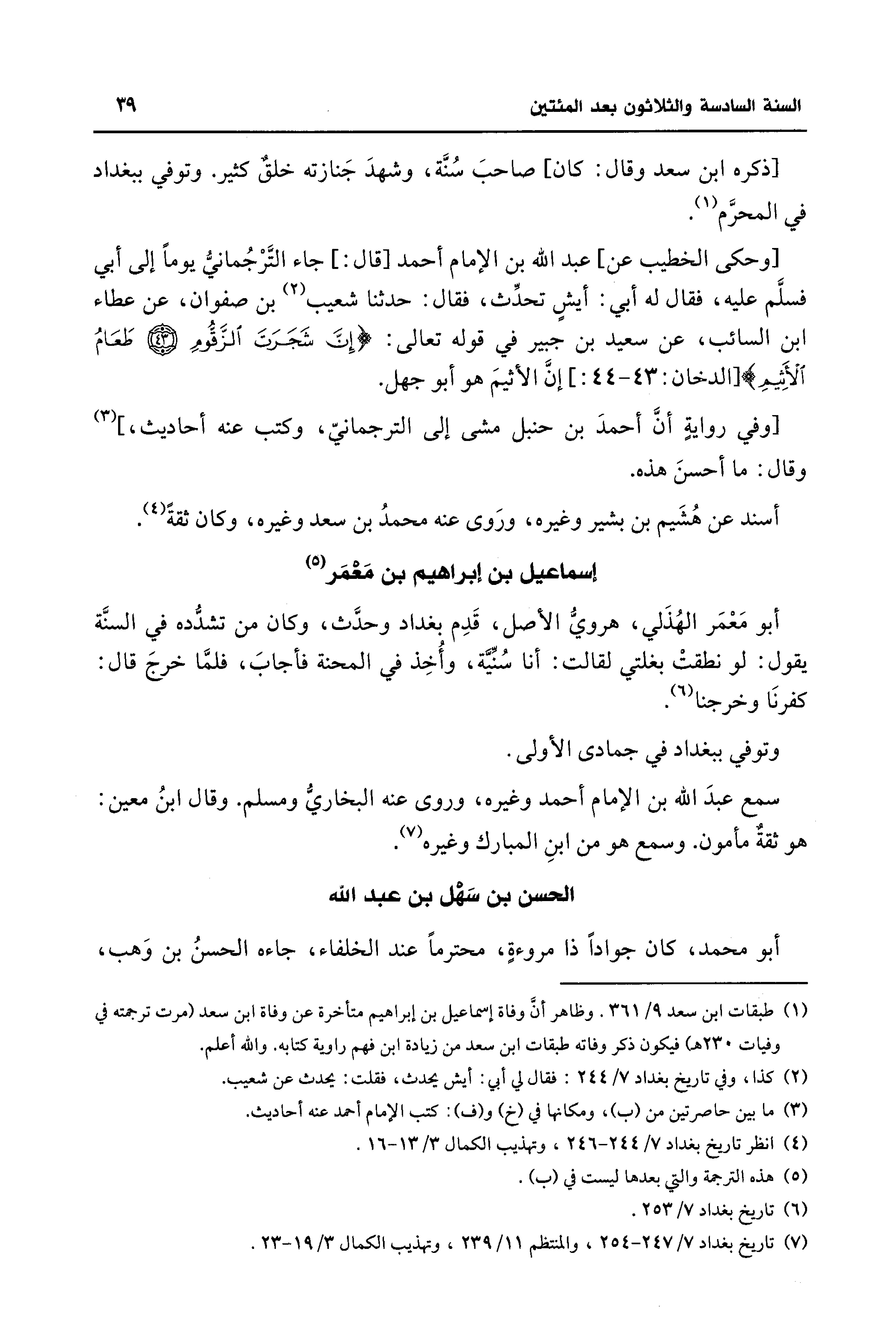 (¬7) تاريخ بغداد 7/ 247 - 254، والمنتظم 11/ 239، وتهذيب الكمال 3/ 19 - 23.