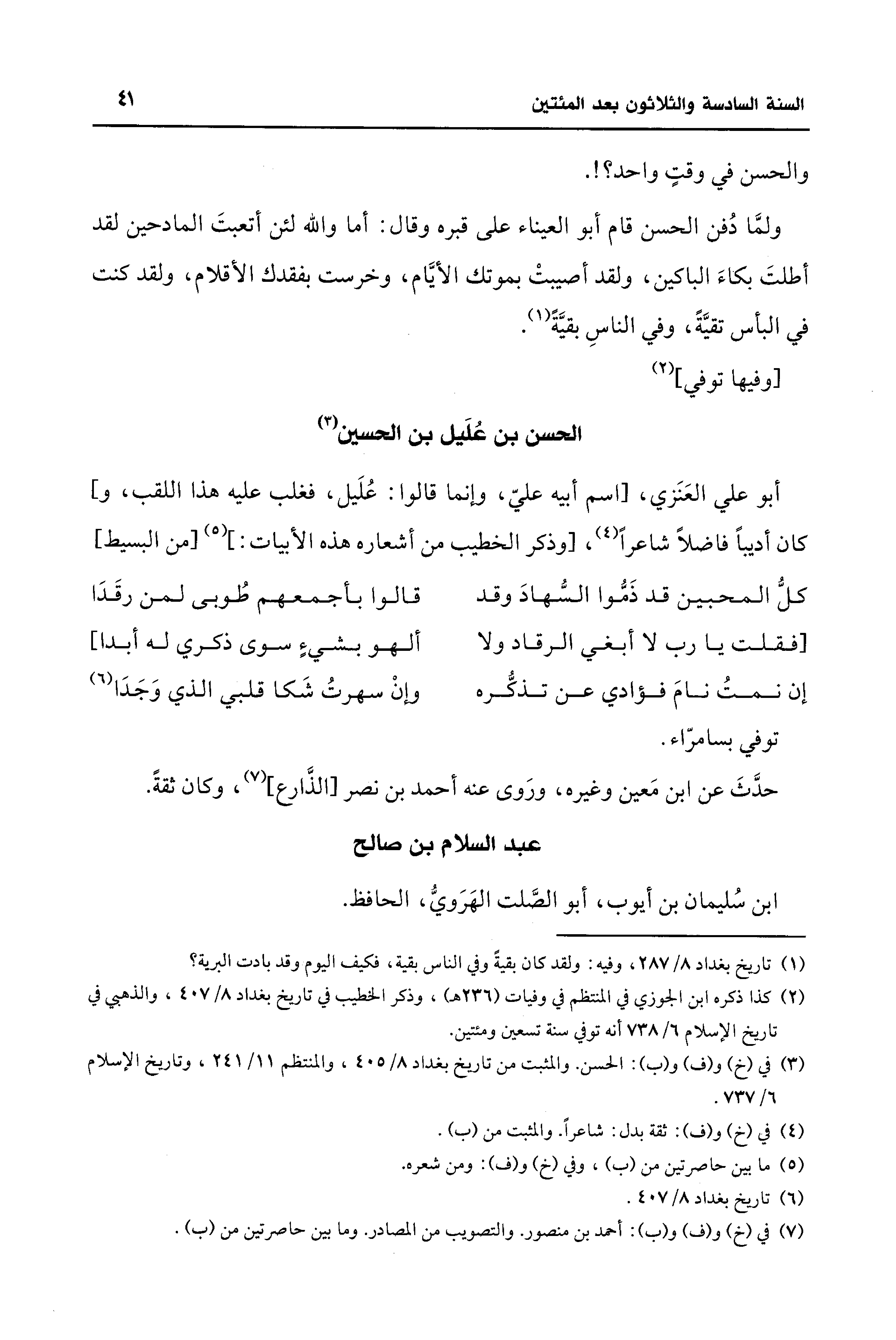 (¬1) تاريخ بغداد 8/ 287، وفيه: ولقد كان بقية وفي الناس بقية، فكيف اليوم وقد بادت البرية؟
