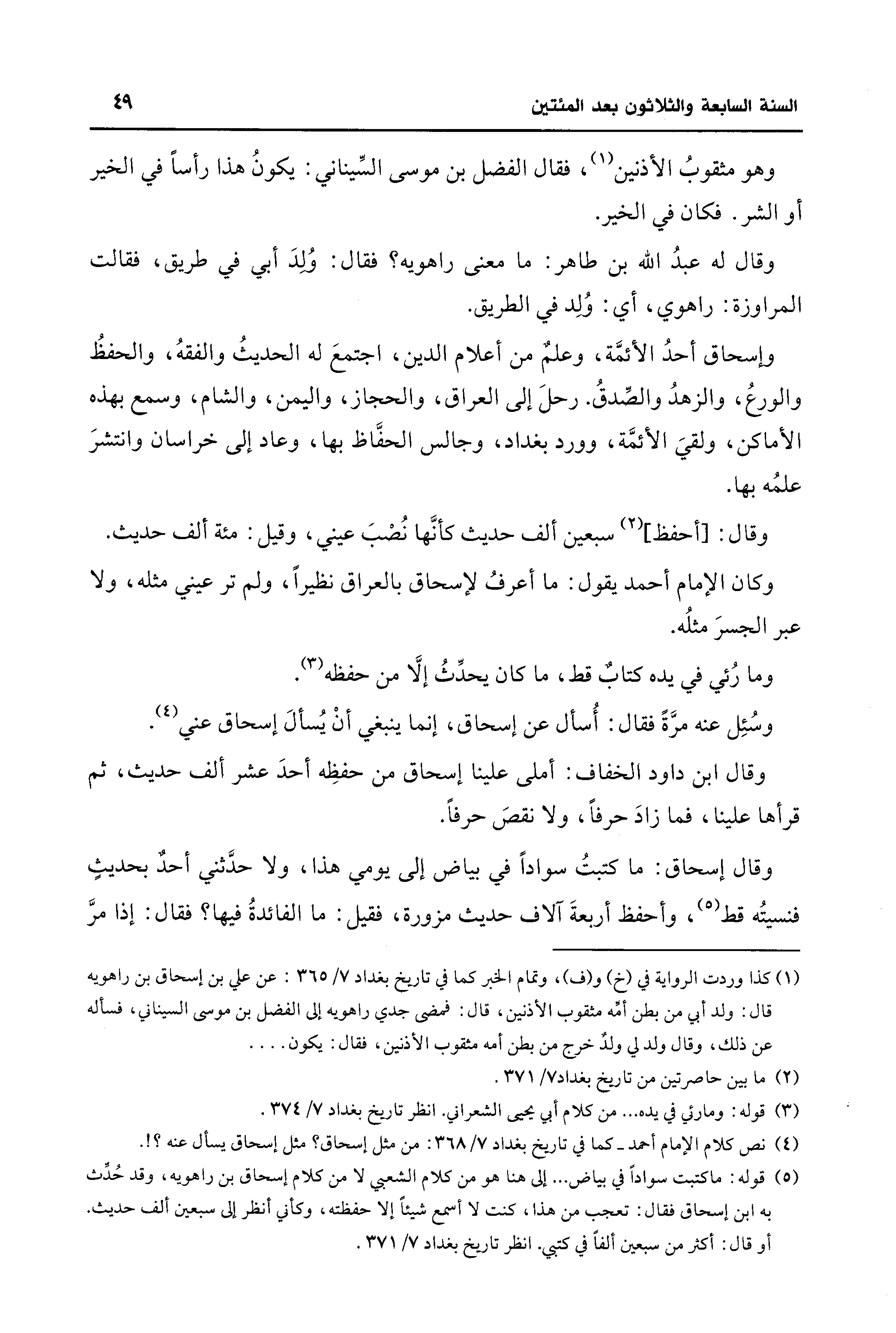 (¬5) قوله: ما كتبت سوادًا في بياض ... إلى هنا هو من كلام الشعبي لا من كلام إسحاق بن راهويه، وقد حُدِّث به ابن إسحاق فقال: تعجب من هذا، كنت لا أسمع شيئًا إلا حفظته، وكأني أنظر إلى سبعين ألف حديث. أو قال: أكثر من سبعين ألفًا في كتبي. انظر تاريخ بغداد 7/ 371.