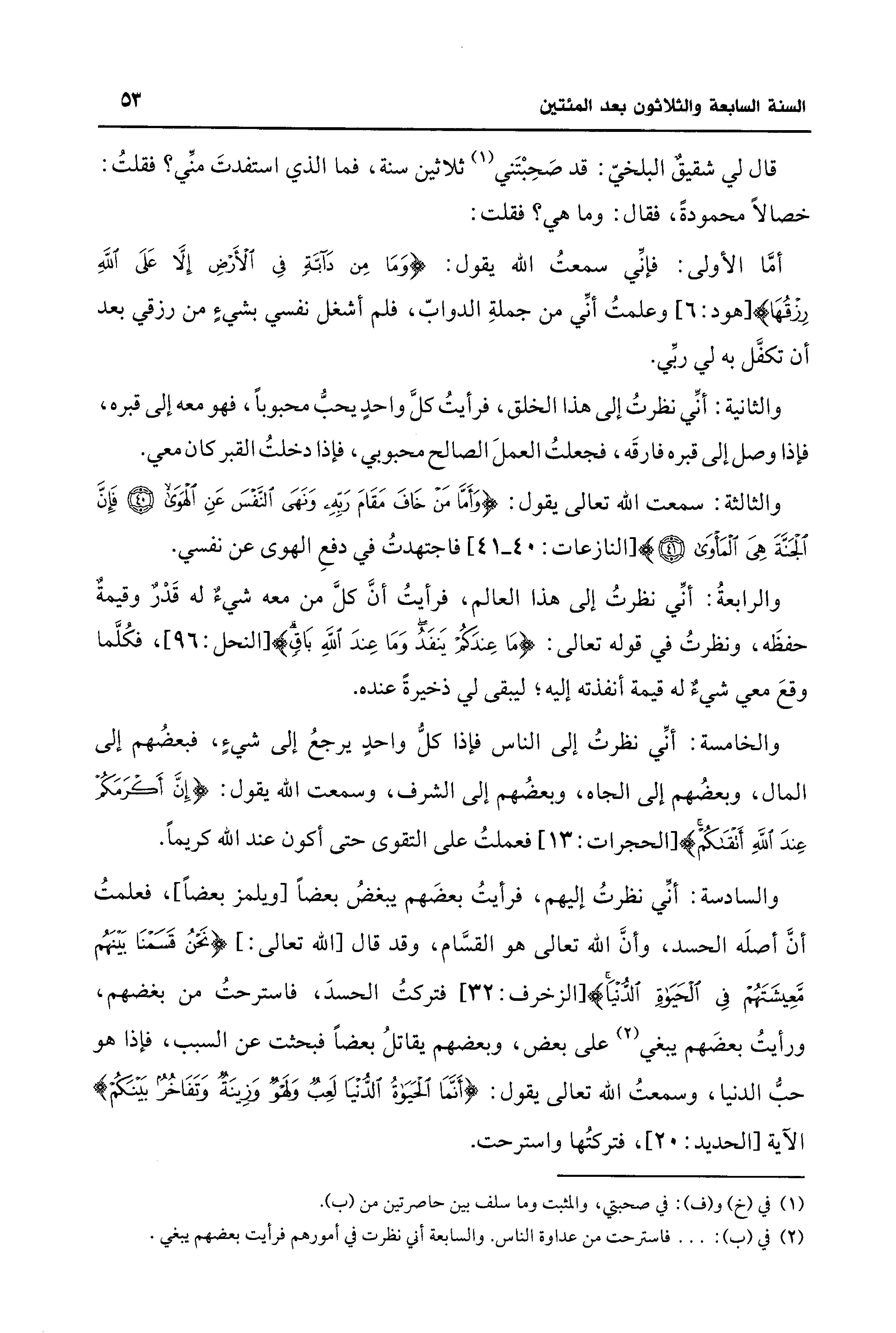 والسادسة: أنِّي نظرتُ إليهم، فرأيتُ بعضَهم يبغضُ بعضًا [ويلمز بعضًا]، فعلمتُ أنَّ أصلَه الحسد، وأنَّ الله تعالى هو القسَّام، وقد قال [الله تعالى: ] {نَحْنُ قَسَمْنَا بَينَهُمْ مَعِيشَتَهُمْ فِي الْحَيَاةِ الدُّنْيَا} [الزخرف: 32] فتركتُ الحسدَ، فاسترحتُ من بغضهم، ورأيتُ بعضَهم يبغي (¬2) على بعض، وبعضهم يقاتلُ بعضًا فبحثت عن السبب، فإذا هو حبُّ الدنيا، وسمعتُ الله تعالى يقول: {أَنَّمَا الْحَيَاةُ الدُّنْيَا لَعِبٌ وَلَهْوٌ وَزِينَةٌ وَتَفَاخُرٌ بَينَكُمْ} الآية [الحديد: 20]، فتركتُها واسترحت.