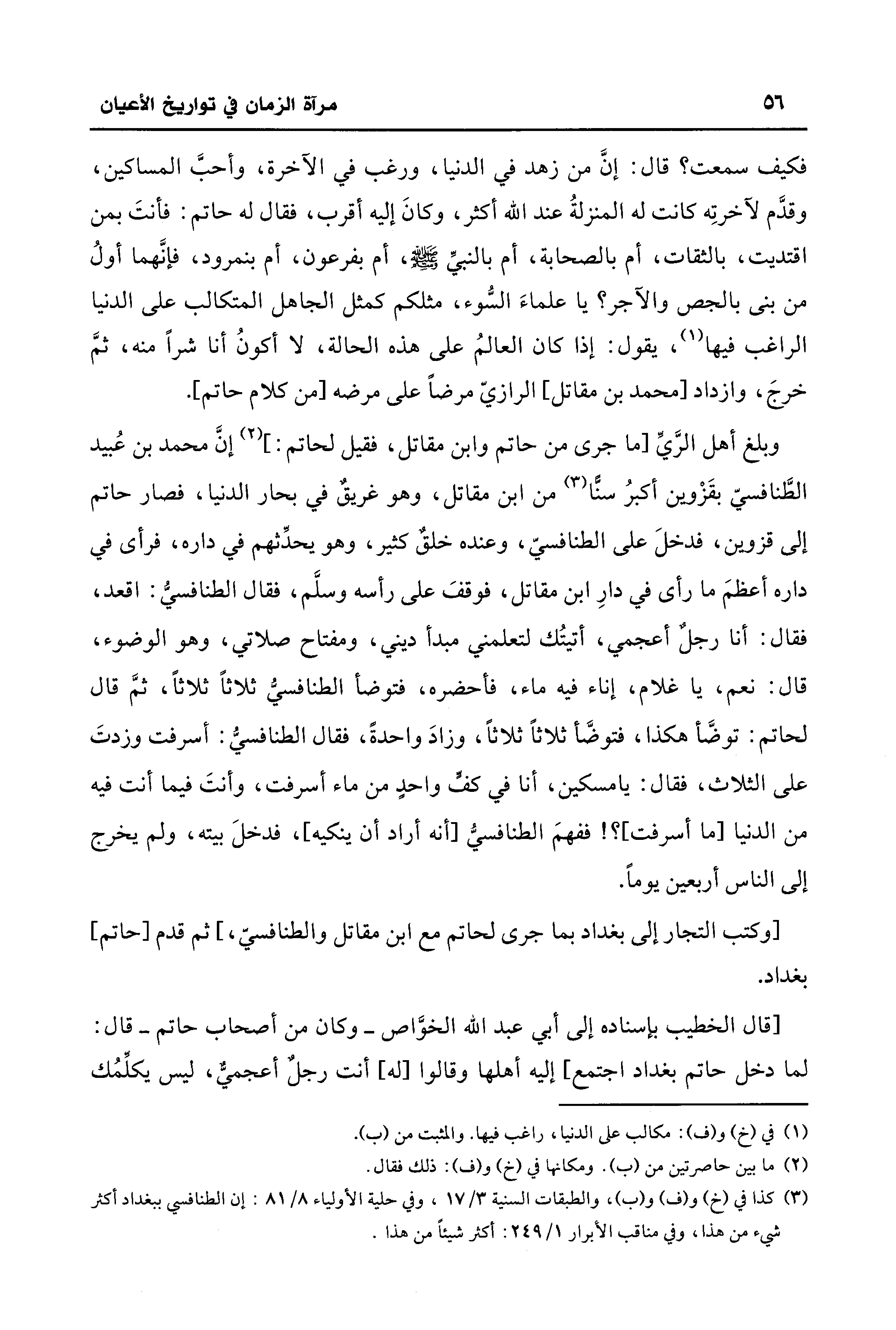 وبلغ أهل الرَّيِّ [ما جرى من حاتم وابن مقاتل، فقيل لحاتم: ] (¬2) إنَّ محمد بن عُبيد الطَّنافسيّ بقَزْوين أكبرُ سنًّا (¬3) من ابن مقاتل، وهو غريقٌ في بحار الدنيا، فصار حاتم إلى قزوين، فدخلَ على الطنافسيّ، وعنده خلقٌ كثير، وهو يحدِّثهم في داره، فرأى في داره أعظمَ ما رأى في دارِ ابن مقاتل، فوقفَ على رأسه وسلَّم، فقال الطنافسيُّ: اقعد، فقال: أنا رجلٌ أعجمي، أتيتُك لتعلمني مبدأ ديني، ومفتاح صلاتي، وهو الوضوء، قال: نعم، يا غلام، إناء فيه ماء، فأحضره، فتوضأ الطنافسيُّ ثلاثًا ثلاثًا، ثمَّ قال لحاتم: توضَّأْ هكذا، فتوضَّأ ثلاثًا ثلاثًا، وزادَ واحدةً، فقال الطنافسيُّ: أسرفت وزدتَ على الثلاث، فقال: يا مسكين، أنا في كفٍّ واحدٍ من ماء أسرفت، وأنتَ فيما أنت فيه من الدنيا [ما أسرفت]؟ ! ففهمَ الطنافسيُّ [أنَّه أراد أن ينكيه]، فدخلَ بيته، ولم يخرج إلى الناس أربعين يومًا.
