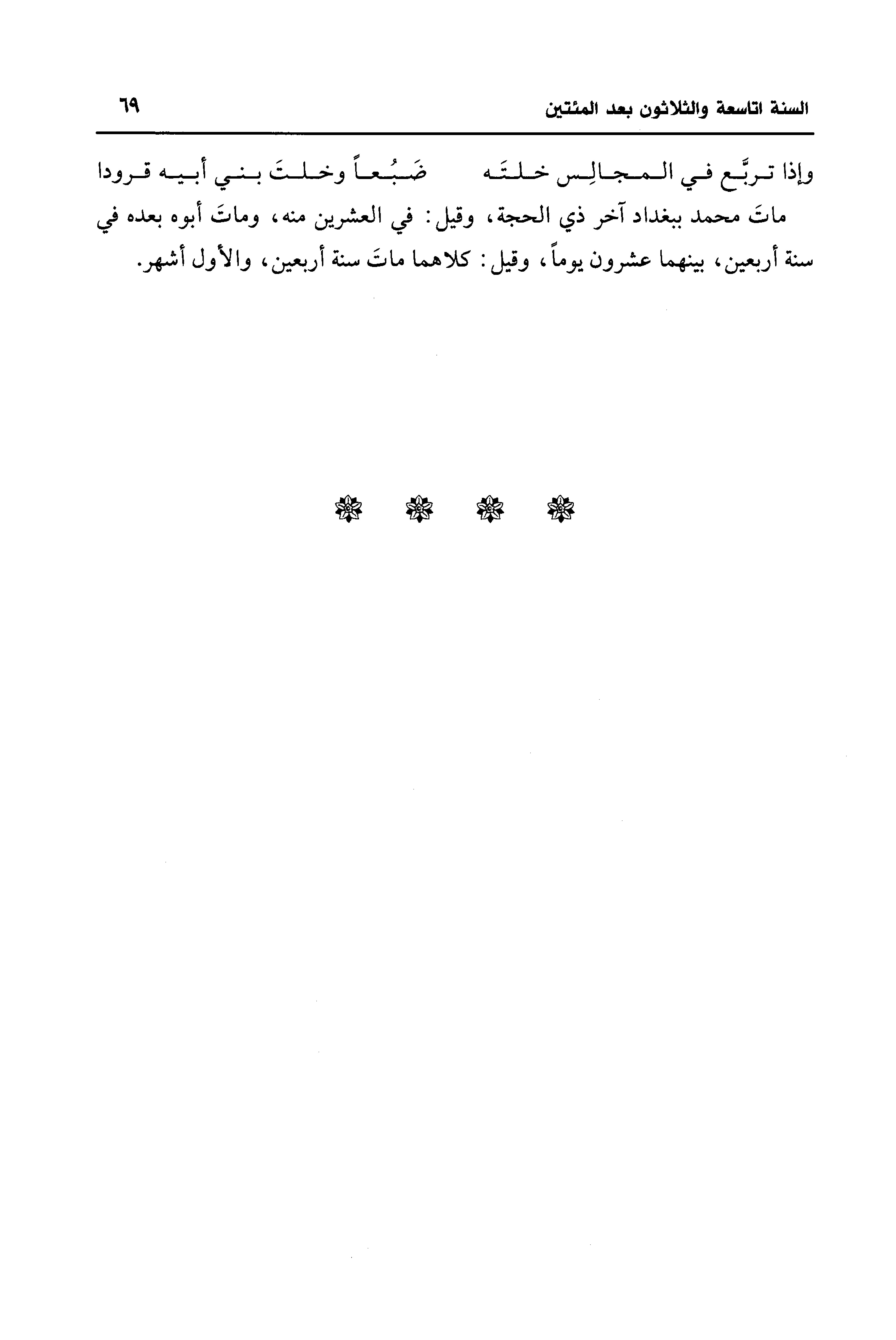 ماتَ محمد ببغداد آخر ذي الحجة، وقيل: في العشرين منه، وماتَ أبوه بعده في سنة أربعين، بينهما عشرون يومًا، وقيل: كلاهما ماتَ سنة أربعين، والأول أشهر.