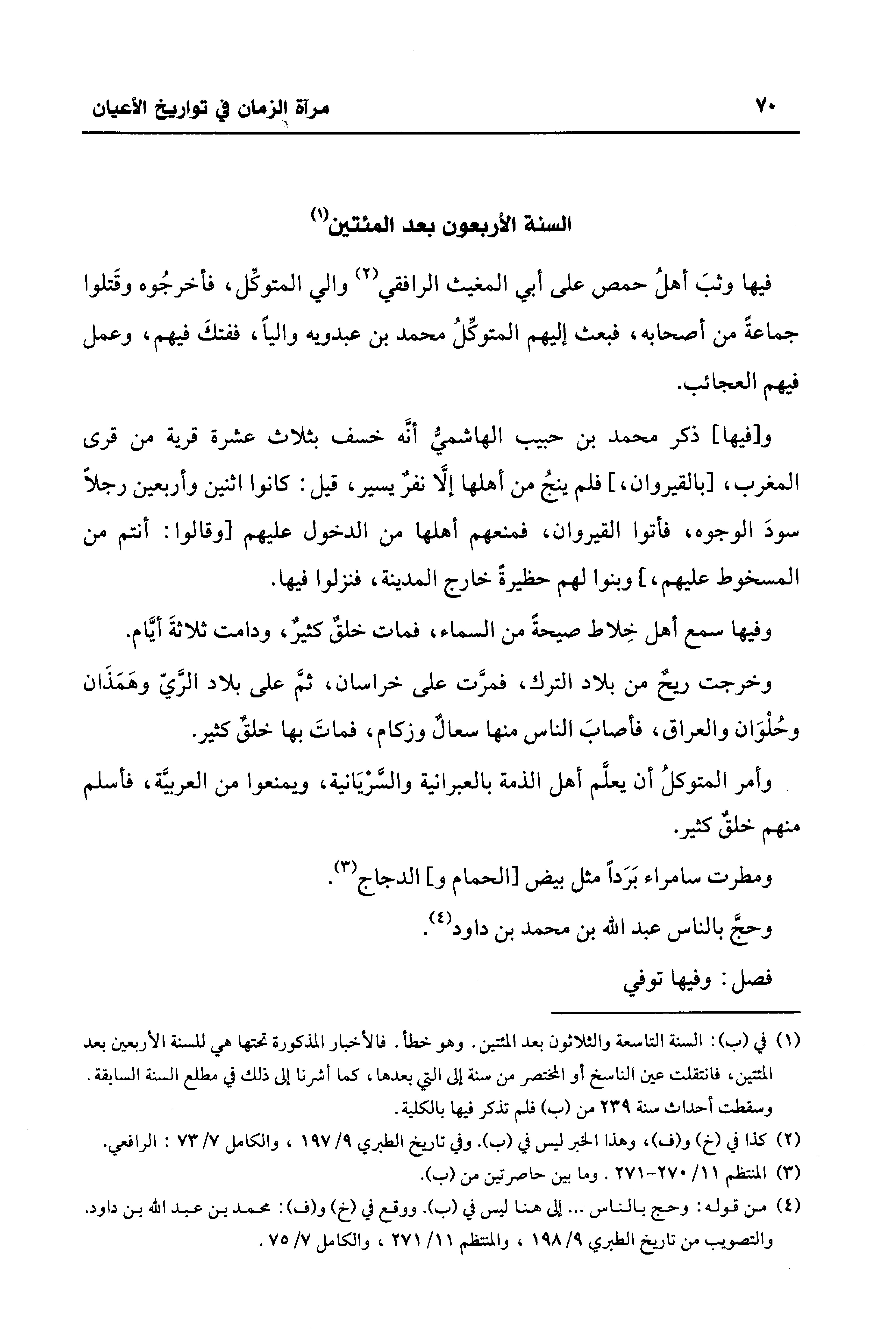 (¬1) في (ب): السنة التاسعة والثلاثون بعد المئتين. وهو خطأ. فالأخبار المذكورة تحتها هي للسنة الأربعين بعد المئتين، فانتقلت عين الناسخ أو المختصر من سنة إلى التي بعدها، كما أشرنا إلى ذلك في مطلع السنة السابقة. وسقطت أحداث سنة 239 من (ب) فلم تذكر فيها بالكلية.