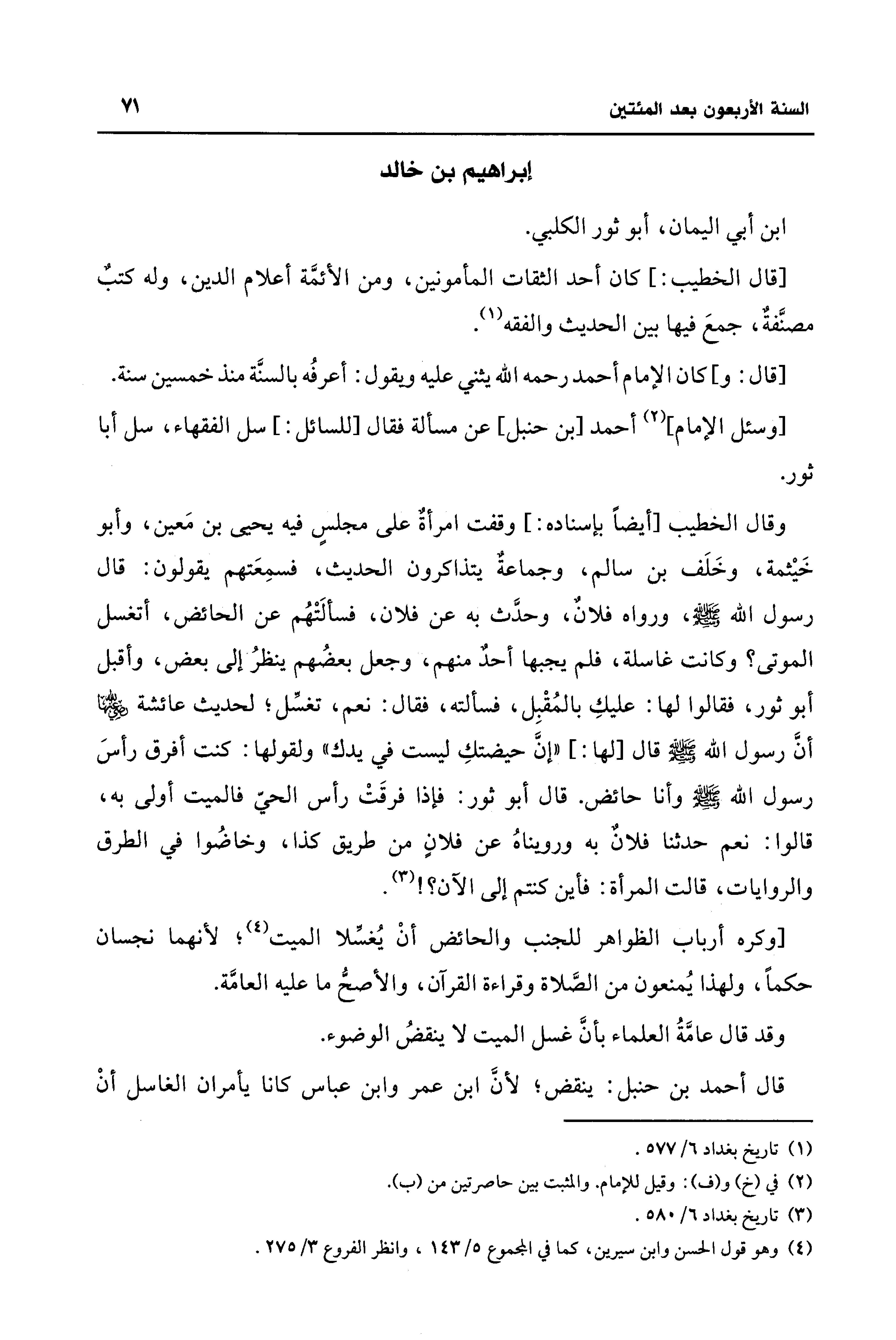وقال الخطيب [أيضًا بإسناده: ] وقفت امرأةٌ على مجلسٍ فيه يحيى بن مَعين، وأبو خَيثمة، وخَلَف بن سالم، وجماعةٌ يتذاكرون الحديث، فسمِعَتهم يقولون: قال رسول الله - صلى الله عليه وسلم -، ورواه فلانٌ، وحدَّث به عن فلان، فسألَتْهُم عن الحائض، أتغسل الموتى؟ وكانت غاسلة، فلم يجبها أحدٌ منهم، وجعل بعضُهم ينظرُ إلى بعض، وأقبل أبو ثور، فقالوا لها: عليكِ بالمُقْبِل، فسألته، فقال: نعم، تغسِّل؛ لحديث عائشة - رضي الله عنها - أنَّ رسول الله - صلى الله عليه وسلم - قال [لها: ] "إنَّ حيضتكِ ليست في يدك" ولقولها: كنت أفرق رأسَ رسول الله - صلى الله عليه وسلم - وأنا حائض. قال أبو ثور: فإذا فرقَتْ رأس الحيّ فالميت أولى به، قالوا: نعم حدثنا فلانٌ به ورويناهُ عن فلانٍ من طريق كذا، وخاضُوا في الطرق والروايات، قالت المرأة: فأين كنتم إلى الآن؟ ! (¬3).