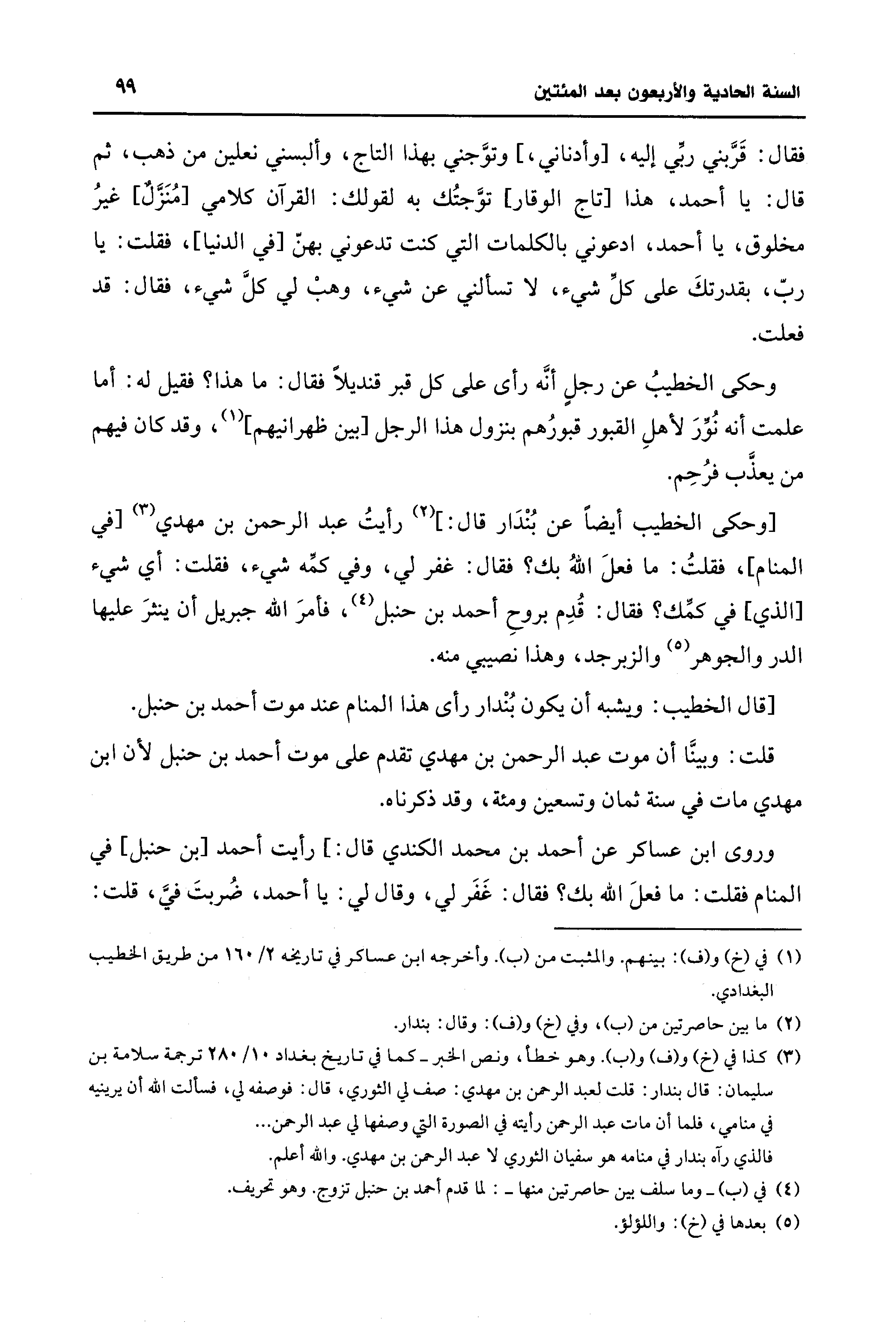[وحكى الخطيب أيضًا عن بُنْدَار قال: ] (¬2) رأيتُ عبد الرحمن بن مهدي (¬3) [في المنام]، فقلتُ: ما فعلَ اللهُ بك؟ فقال: غفر لي، وفي كمِّه شيء، فقلت: أي شيء [الذي] في كمِّك؟ فقال: قُدِم بروحِ أحمد بن حنبل (¬4)، فأمرَ الله جبريل أن ينثرَ عليها الدر والجوهر (¬5) والزبرجد، وهذا نصيبي منه.