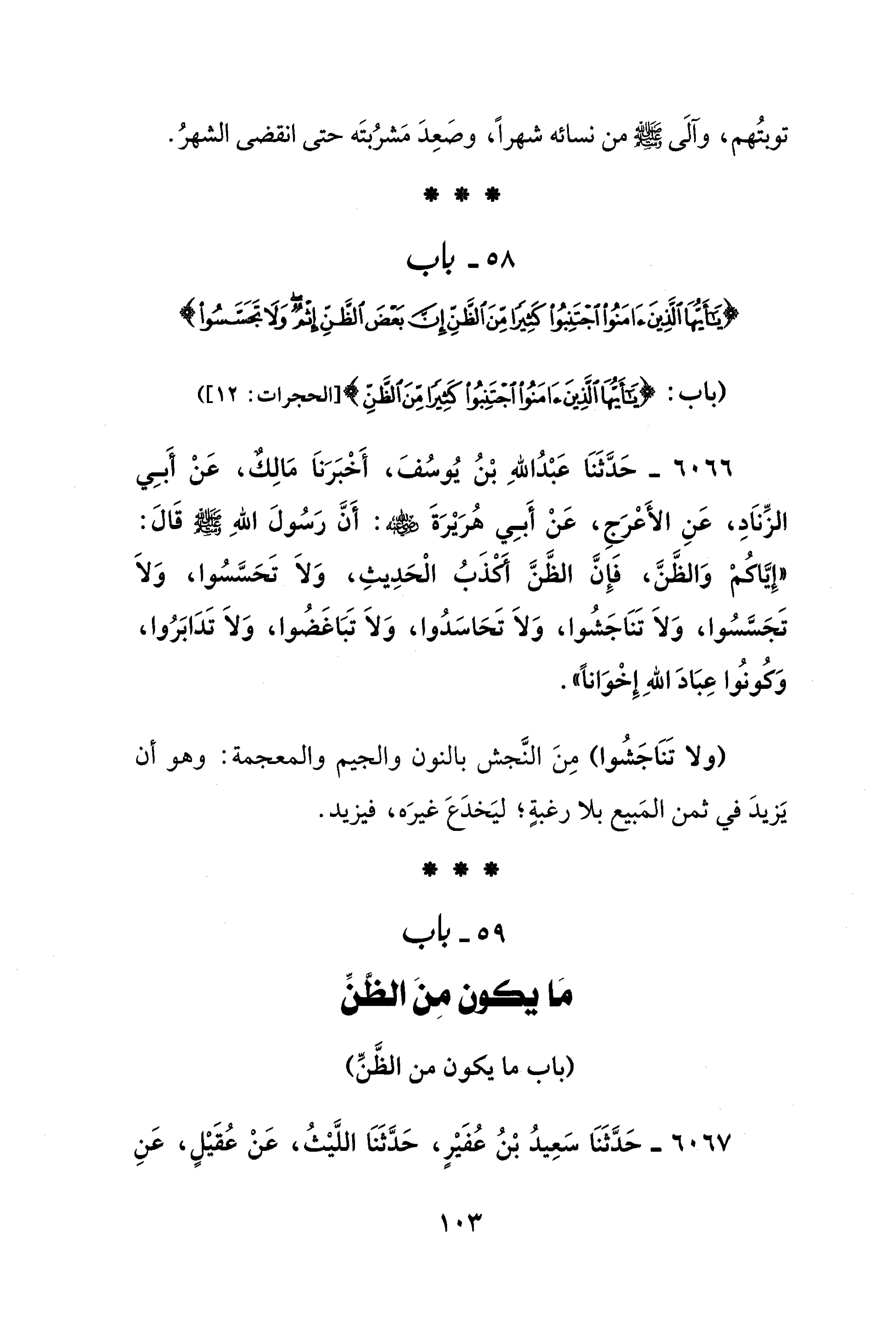 58 - باب {يَا أَيُّهَا الَّذِينَ آمَنُوا اجْتَنِبُوا كَثِيرًا مِنَ الظَّنِّ إِنَّ بَعْضَ الظَّنِّ إِثْمٌ وَلَا تَجَسَّسُوا}