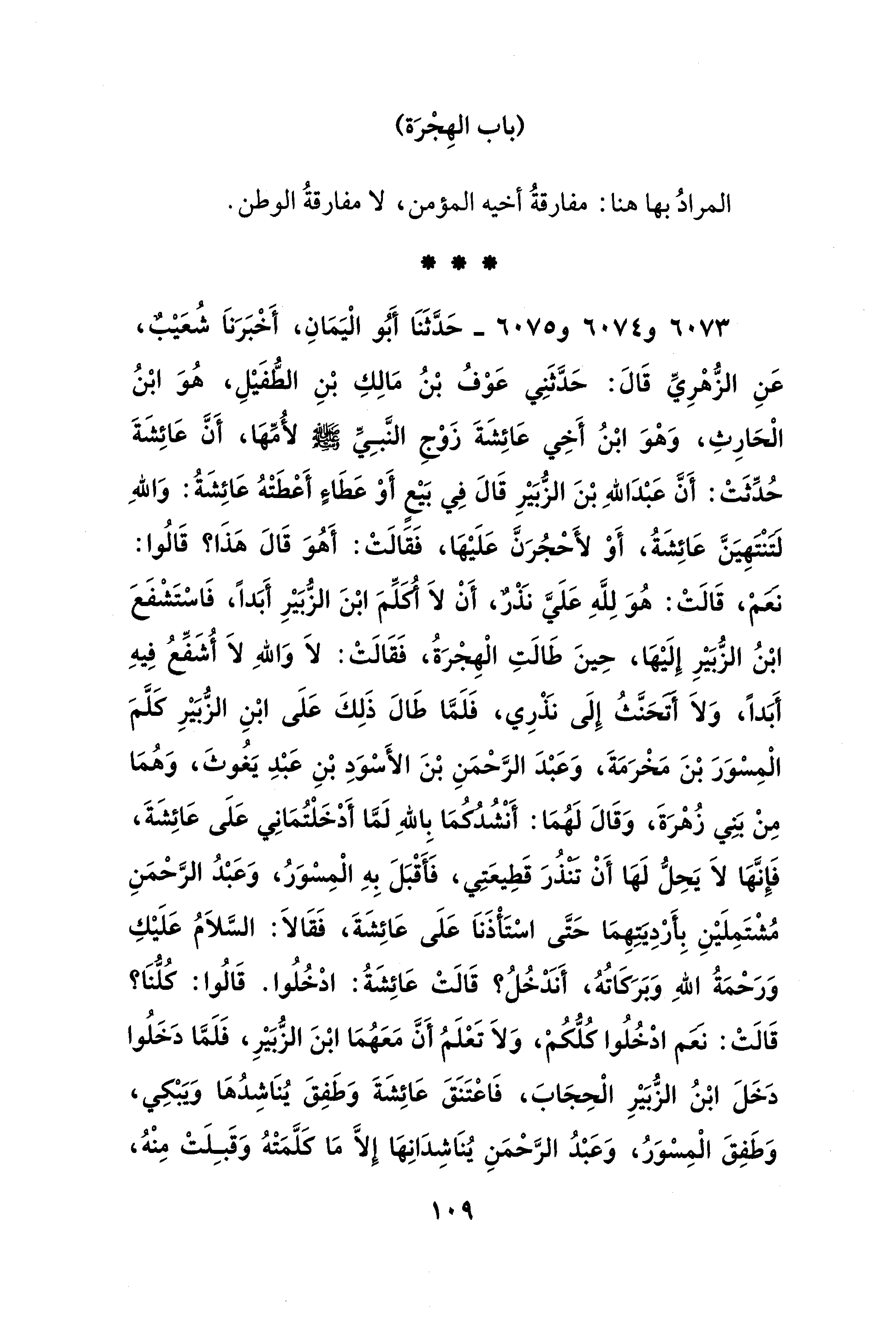6073 - و 6074 و 6075 - حَدَّثَنَا أَبُو الْيَمَانِ، أَخْبَرَنَا شُعَيْبٌ، عَنِ الزُّهْرِيِّ قَالَ: حَدَّثَنِي عَوْفُ بْنُ مَالِكِ بْنِ الطُّفَيْلِ، هُوَ ابْنُ الْحَارِثِ، وَهْوَ ابْنُ أَخِي عَائِشَةَ زَوْج النَّبِيِّ - صلى الله عليه وسلم - لأُمِّهَا، أَنَّ عَائِشَةَ حُدِّثَتْ: أَنَّ عَبْدَ اللهِ بْنَ الزُّبَيْرِ قَالَ فِي بَيْعٍ أَوْ عَطَاءٍ أَعْطَتْهُ عَائِشَةُ: وَاللهِ لتنْتَهِيَنَّ عَائِشَةُ، أَوْ لأَحْجُرَنَّ عَلَيْهَا، فَقَالَتْ: أَهُوَ قَالَ هَذَا؟ قَالُوا: نعمْ، قَالَتْ: هُوَ لِلَّهِ عَلَيَّ نَذْرٌ، أَنْ لَا أُكُلِّمَ ابْنَ الزُّبَيْرِ أَبَدًا، فَاسْتَشْفَعَ ابْنُ الزُّبَيْرِ إِلَيْهَا، حِينَ طَالَتِ الْهِجْرَةُ، فَقَالَتْ: لَا وَاللهِ لَا أُشَفِّعُ فِيهِ أَبَدًا، وَلَا أَتَحَنَّثُ إِلَى نَذْرِي، فَلَمَّا طَالَ ذَلِكَ عَلَى ابْنِ الزُّبَيْرِ كَلَّمَ الْمِسْوَرَ بْنَ مَخْرَمَةَ، وَعَبْدَ الرَّحْمَنِ بْنَ الأَسْوَدِ بْنِ عَبْدِ يَغُوثَ، وَهُمَا مِنْ بَنِي زُهْرَةَ، وَقَالَ لَهُمَا: أَنْشُدُكُمَا بِاللهِ لَمَّا أَدْخَلْتُمَانِي عَلَى عَائِشَةَ، فَإِنَّهَا لَا يَحِلُّ لَهَا أَنْ تَنْذُرَ قَطِيعَتِي، فَأَقْبَلَ بِهِ الْمِسْوَرُ، وَعَبْدُ الرَّحْمَنِ مُشْتَمِلَيْنِ بِأَرْدِيَتِهِمَا حَتَّى اسْتَأْذَنَا عَلَى عَائِشَةَ، فَقَالاَ: السَّلاَمُ عَلَيْكِ وَرَحْمَةُ اللهِ وَبَرَكَاتُهُ، أَنَدْخُلُ؟ قَالَتْ عَائِشَةُ: ادْخُلُوا. قَالُوا: كُلُّنَا؟ قَالَتْ: نعم ادْخُلُوا كُلُّكُمْ، وَلَا تَعْلَمُ أَنَّ مَعَهُمَا ابْنَ الزُّبَيْرِ، فَلَمَّا دَخَلُوا دَخَلَ ابْنُ الزُّبَيْرِ الْحِجَابَ، فَاعْتَنَقَ عَائِشَةَ وَطَفِقَ يُنَاشِدُهَا وَيَبْكِي، وَطَفِقَ الْمِسْوَرُ، وَعَبْدُ الرَّحْمَنِ يُنَاشِدَانِهَا إِلَّا مَا كَلَّمَتْهُ وَقَبِلَتْ مِنْهُ،