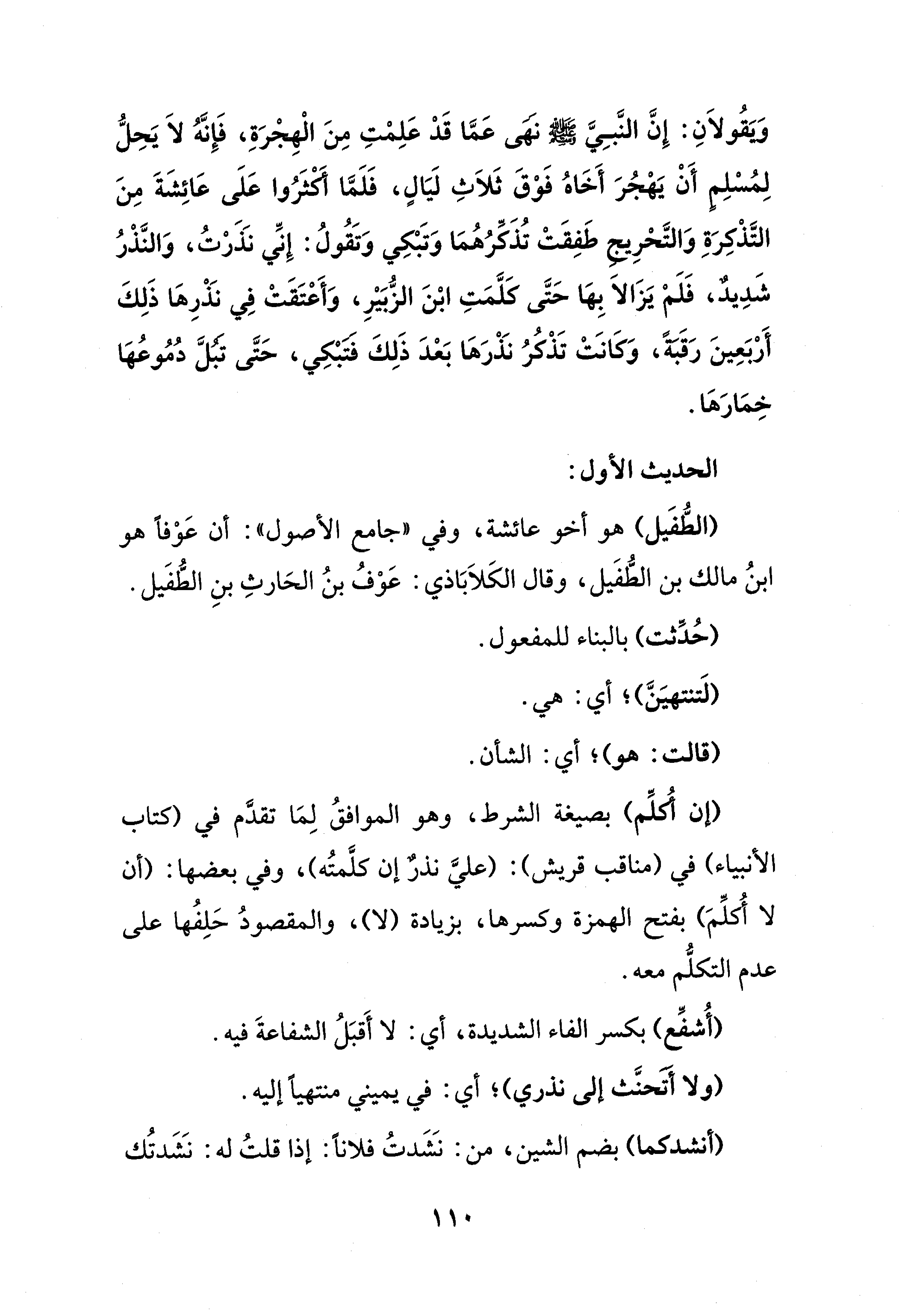 وَيَقُولَانِ: إِنَّ النَّبِيَّ - صلى الله عليه وسلم - نهى عَمَّا قَدْ عَلِمْتِ مِنَ الْهِجْرَةِ، فَإِنَّهُ لَا يَحِلُّ لِمُسْلِمٍ أَنْ يَهْجُرَ أَخَاهُ فَوْقَ ثَلاَثِ لَيَالٍ، فَلَمَّا أَكثَرُوا عَلَى عَائِشَةَ مِنَ التَّذْكِرَةِ وَالتَّحْرِيج طَفِقَتْ تُذَكِّرُهُمَا وَتَبْكِي وَتَقُولُ: إِنِّي نَذَرْتُ، وَالنَّذْرُ شَدِيدٌ، فَلَمْ يَزَالاَ بِهَا حَتَّى كَلَّمَتِ ابْنَ الزُّبَيْرِ، وَأَعْتَقَتْ فِي نَذْرِهَا ذَلِكَ أَرْبَعِينَ رَقَبَةً، وَكَانَتْ تَذْكُرُ نَذْرَهَا بَعْدَ ذَلِكَ فَتَبْكِي، حَتَّى تَبُلَّ دُمُوعُهَا خِمَارَهَا.