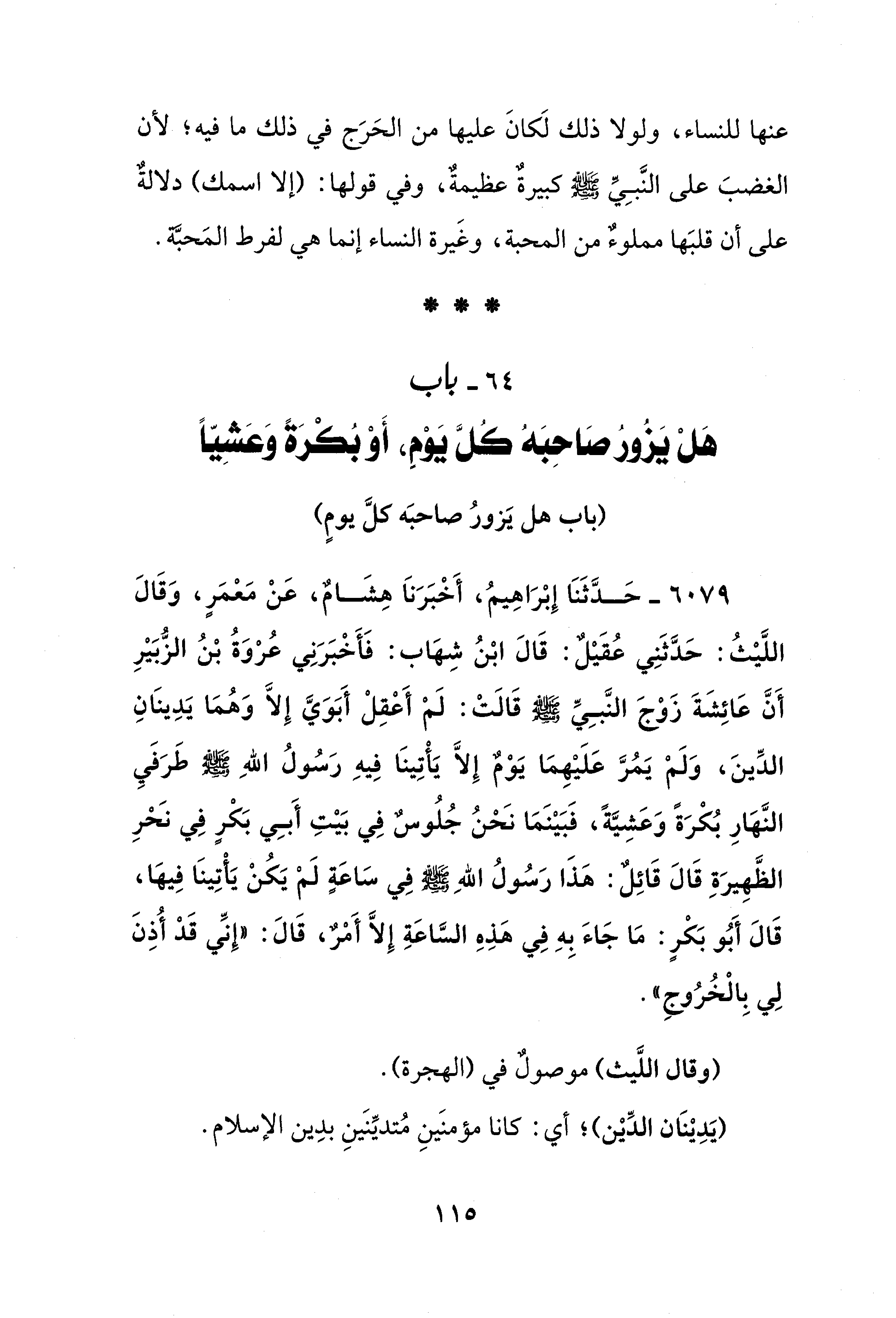 6079 - حَدَّثَنَا إِبْرَاهِيمُ، أَخْبَرَنَا هِشَامٌ، عَنْ مَعْمَرٍ، وَقَالَ اللَّيْثُ: حَدَّثَنِي عُقَيْلٌ: قَالَ ابْنُ شِهَاب: فَأَخْبَرَنِي عُرْوَةُ بْنُ الزُّبَيْرِ أَنَّ عَائِشَةَ زَوْجَ النَّبِيِّ - صلى الله عليه وسلم - قَالَتْ: لَمْ أَعْقِلْ أَبَوَيَّ إِلَّا وَهُمَا يَدِينَانِ الدِّينَ، وَلَمْ يَمُرَّ عَلَيْهِمَا يَوْمٌ إِلَّا يَأْتِينَا فِيهِ رَسُولُ اللهِ - صلى الله عليه وسلم - طَرَفَيِ النَّهَارِ بُكْرَةً وَعَشِيَّةً، فَبَيْنَمَا نَحْنُ جُلُوسٌ فِي بَيْتِ أَبِي بَكْرٍ فِي نَحْرِ الظَّهِيرَةِ قَالَ قَائِلٌ: هَذَا رَسُولُ اللهِ - صلى الله عليه وسلم - فِي سَاعَةٍ لَمْ يَكُنْ يَأْتِينَا فِيهَا، قَالَ أَبُو بَكْرٍ: مَا جَاءَ بِهِ فِي هَذِهِ السَّاعَةِ إِلَّا أَمْرٌ، قَالَ: "إِنِّي قَدْ أُذِنَ لِي بِالْخُرُوجِ".
