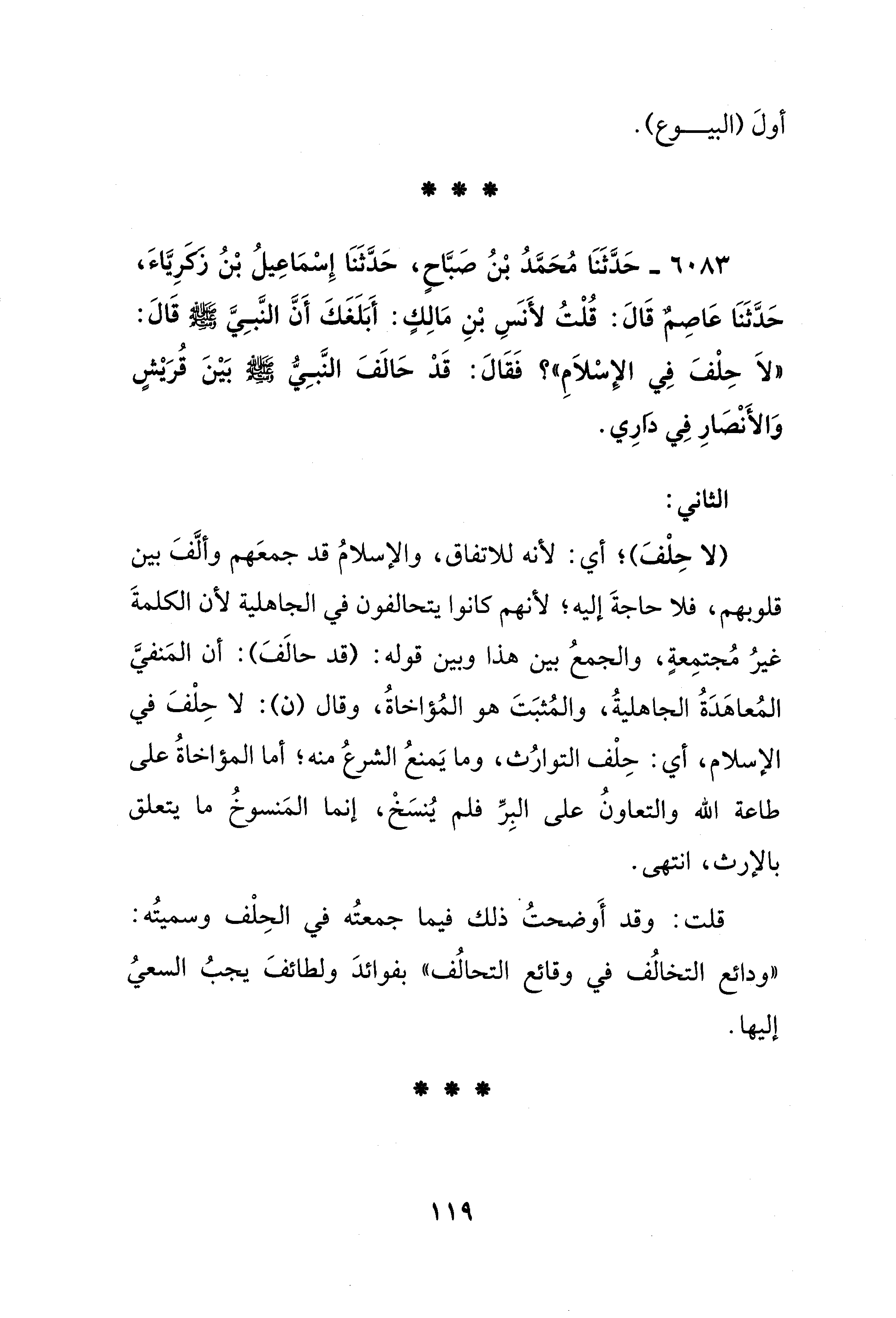 6083 - حَدَّثَنَا مُحَمَّدُ بْنُ صَبَّاحٍ، حَدَّثَنَا إِسْمَاعِيلُ بْنُ زَكَرِيَّاءَ، حَدَّثَنَا عَاصِمٌ قَالَ: قُلْتُ لأَنَسِ بْنِ مَالِكٍ: أَبَلَغَكَ أَنَّ النَّبِيَّ - صلى الله عليه وسلم - قَالَ: "لَا حِلْفَ فِي الإِسْلَامِ"؟ فَقَالَ: قَدْ حَالَفَ النَّبِيُّ - صلى الله عليه وسلم - بَيْنَ قُرَيْشٍ وَالأَنْصَارِ فِي دَارِي.