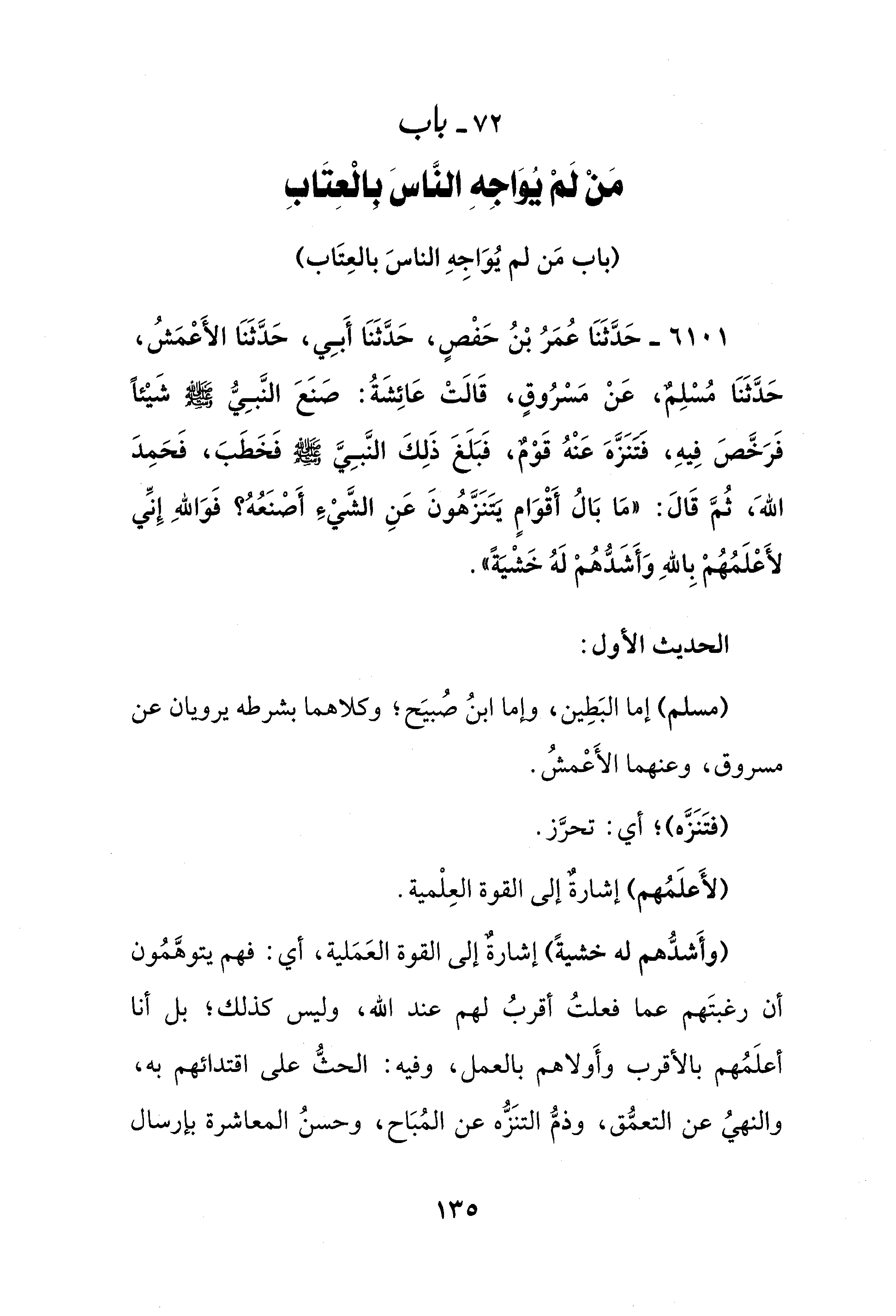 6101 - حَدَّثَنَا عُمَرُ بْنُ حَفْصٍ، حَدَّثَنَا أَبِي، حَدَّثَنَا الأَعْمَشُ، حَدَّثَنَا مُسْلِمٌ، عَنْ مَسْرُوقٍ، قَالَتْ عَائِشَةُ: صَنَعَ النَّبِيُّ - صلى الله عليه وسلم - شَيْئًا فَرَخَّصَ فِيهِ، فَتَنَزَّهَ عَنْهُ قَوْمٌ، فَبَلَغَ ذَلِكَ النَّبِيَّ - صلى الله عليه وسلم - فَخَطَبَ، فَحَمِدَ اللهَ، ثُمَّ قَالَ: "مَا بَالُ أَقْوَامٍ يَتَنَزَّهُونَ عَنِ الشَّيْءِ أَصْنَعُهُ؟ فَوَاللهِ إِنِّي لأَعْلَمُهُمْ بِاللهِ وَأَشَدُّهُمْ لَهُ خَشْيَةً".